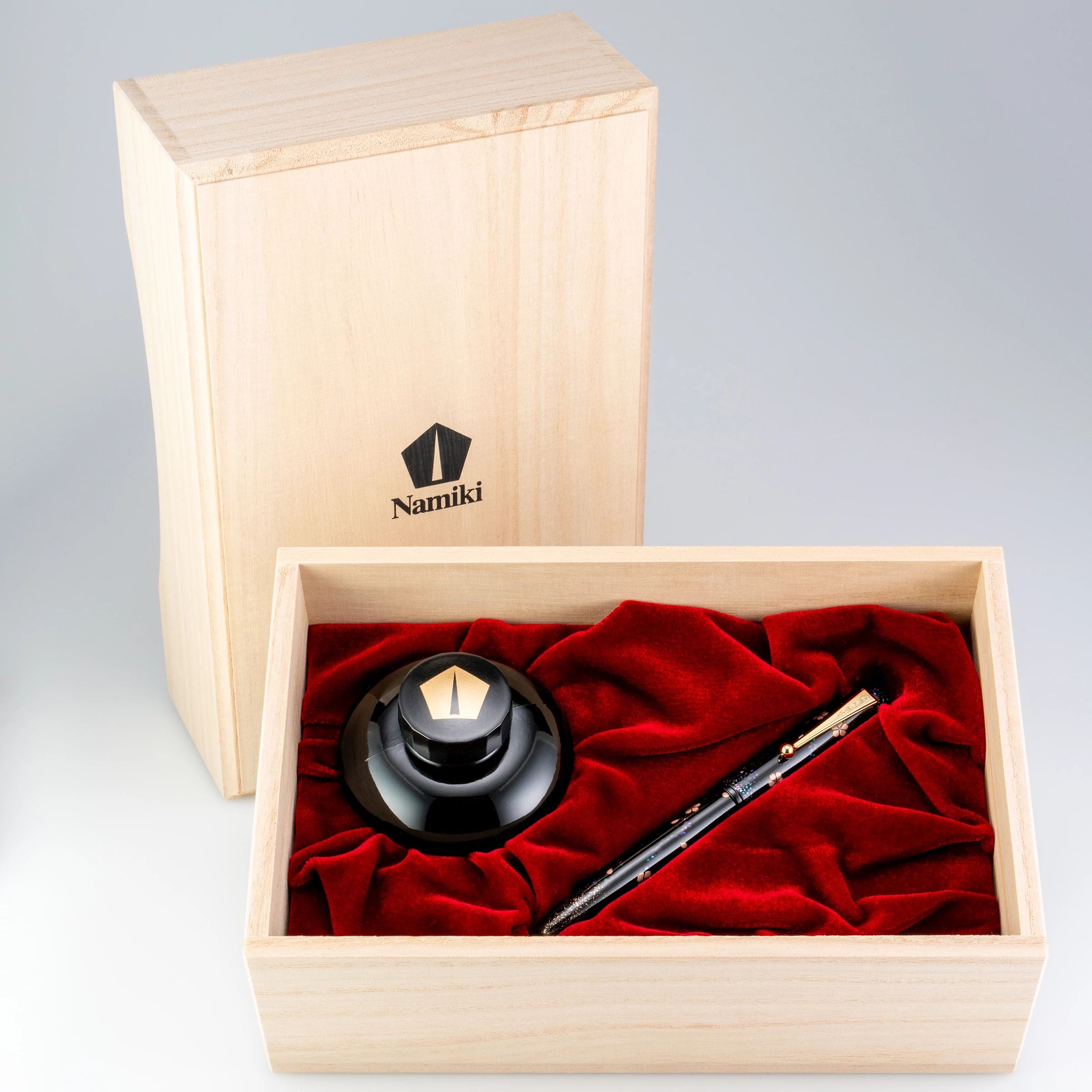 Using the traditional Maki-e techniques Togidashi Maki-e, or burnished-raised maki-e, and Raden, the Yukari collection within Pilot Namiki pens are inspired by the beauty of the four seasons. The making of a Maki-e piece is an extremely labor- and time-intensive process involving a repetitive series of applying layers of lacquer, drawing the design outline, sprinkling gold and silver powders to fill in the designs, and polishing to achieve a lustrous surface. The lacquered main design is filled in with the carefully sprinkled gold and silver powders, and then several additional layers of lacquer are applied. Once these layers harden, the surface is polished many times. A finished product can take up to 3 months, and some of the pieces go through the repetitive lacquer-drawing-sprinkling-polishing process up to 130 times.