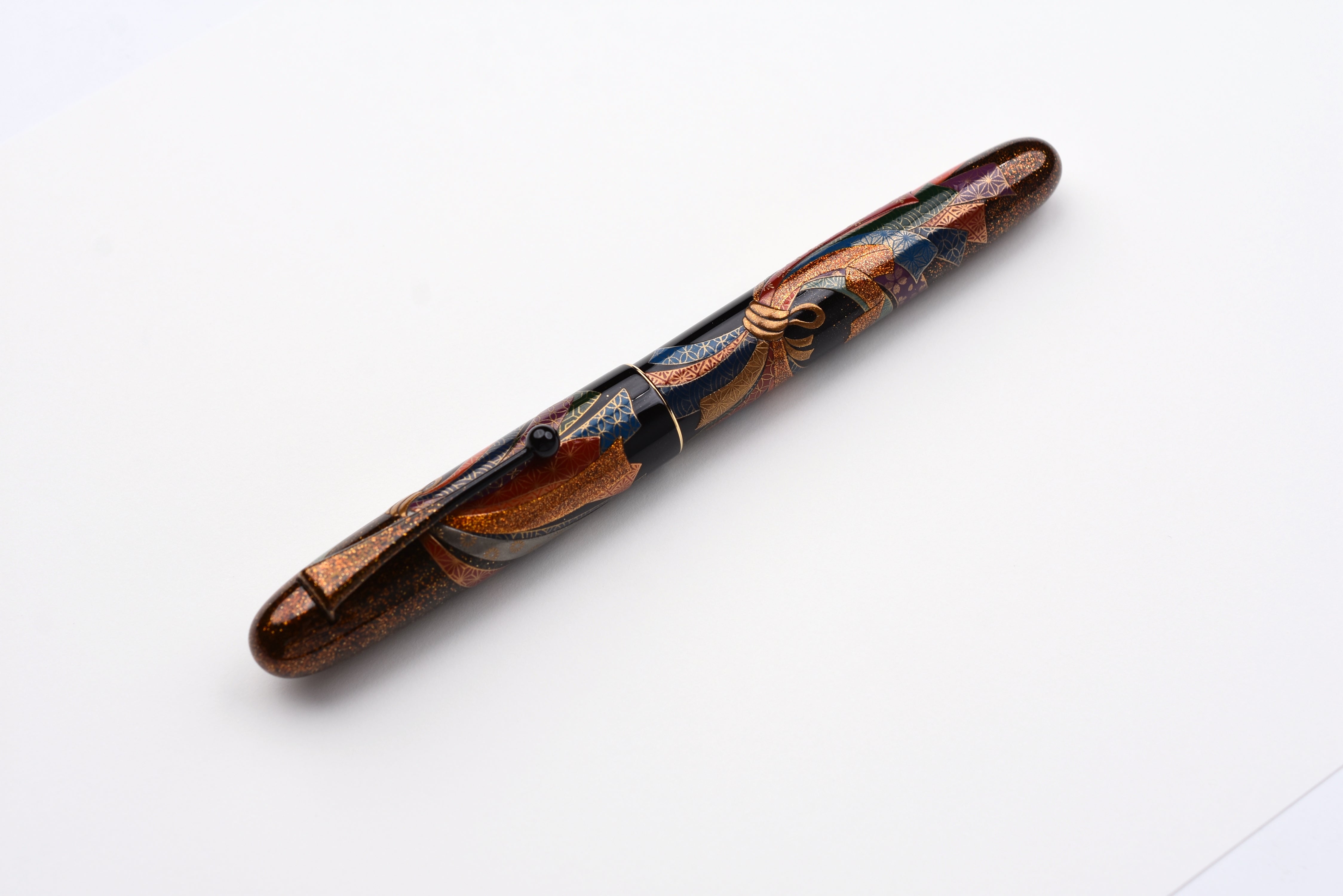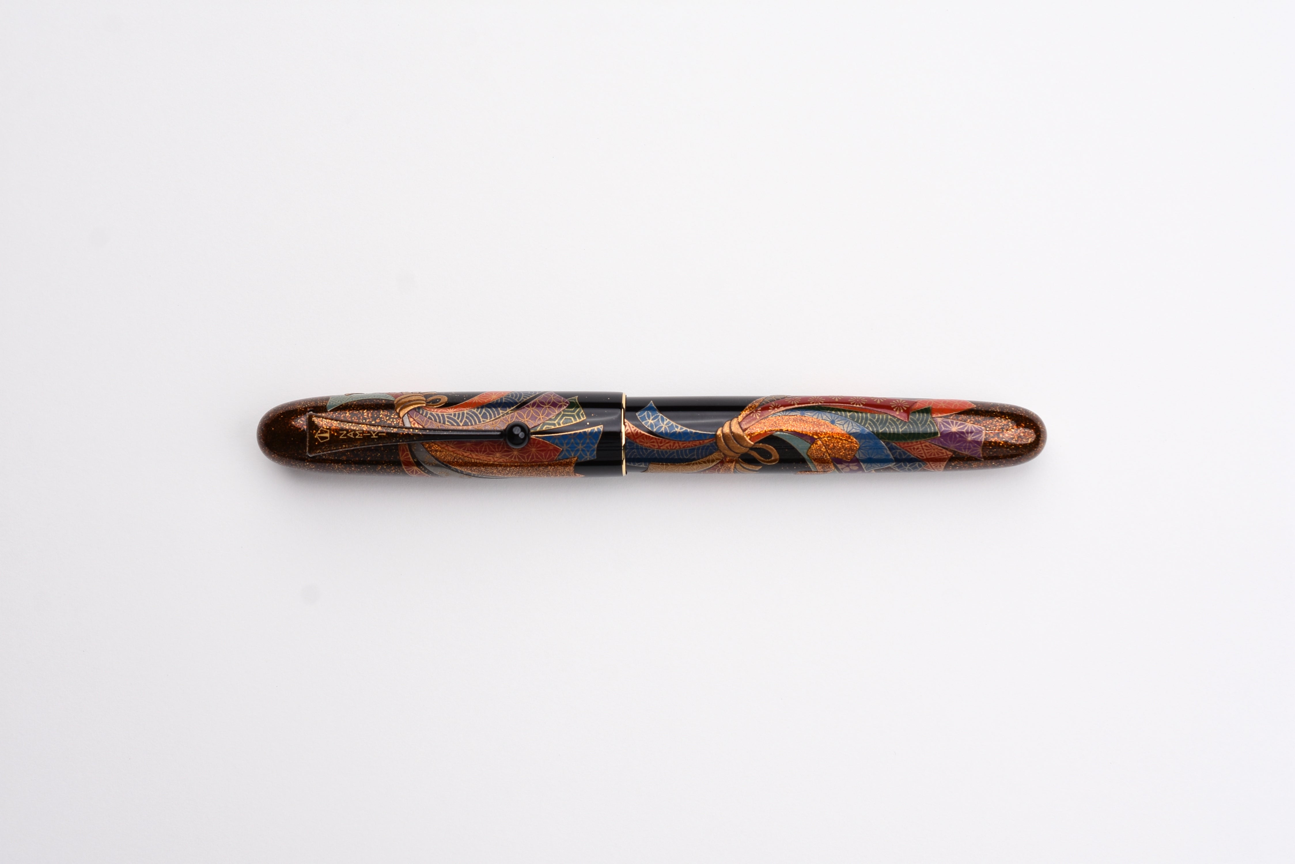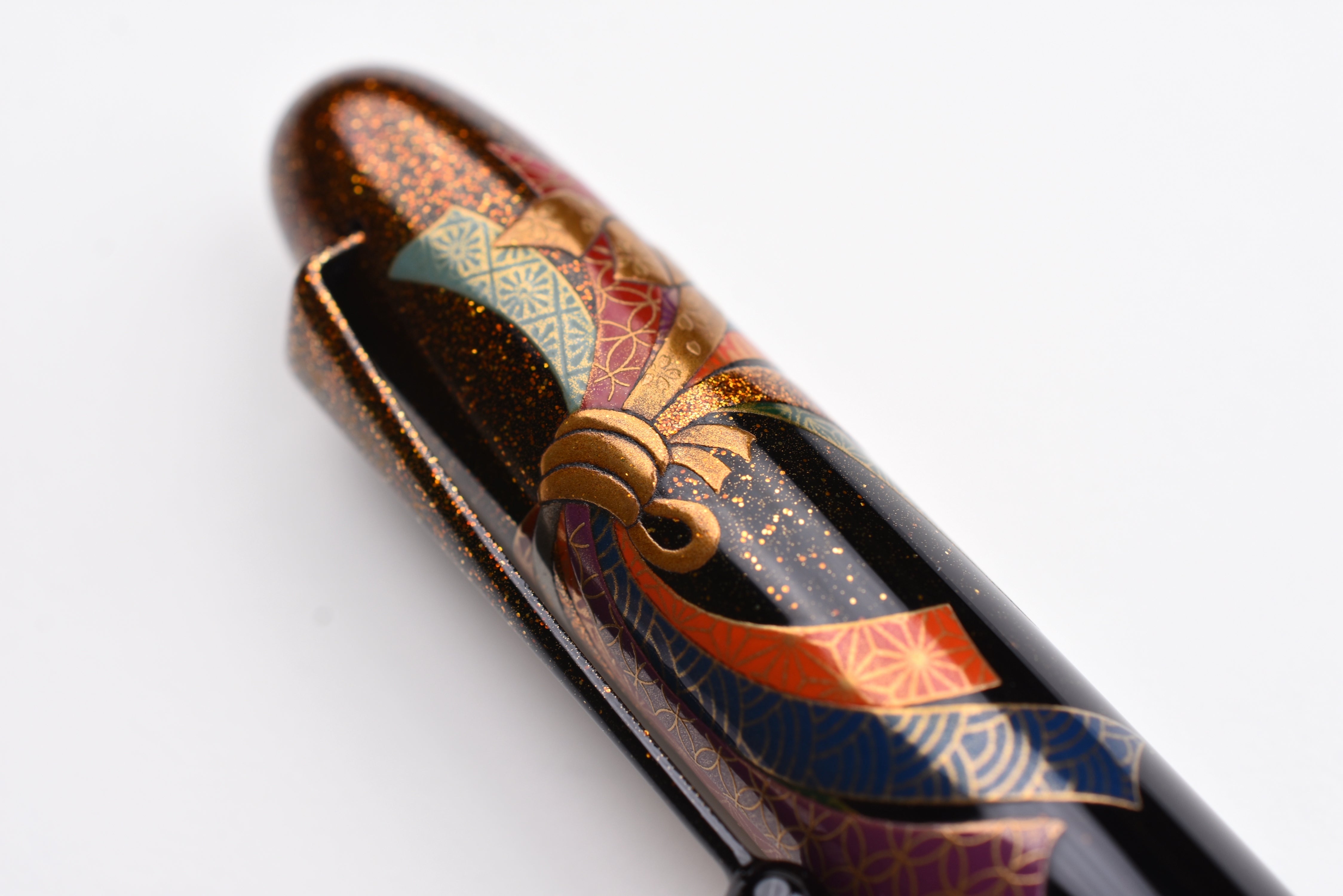 Noshi are decorative bundles made of colored ribbons or folded paper strips that signify good fortune; they are attached to gifts and given on special occasions in Japan. This pen features two ornate noshi bundles, with ribbons of varying colors and patterns; each strand is illuminated with gold glitter and painstakingly rendered details. As this image was created using the Togidashi-Taka Maki-e technique, portions of ribbons also have a raised surface, giving the design texture and great depth. Namiki Yukari Royale - Noshi Bundle was made by master maki-e artist Misa Seki.