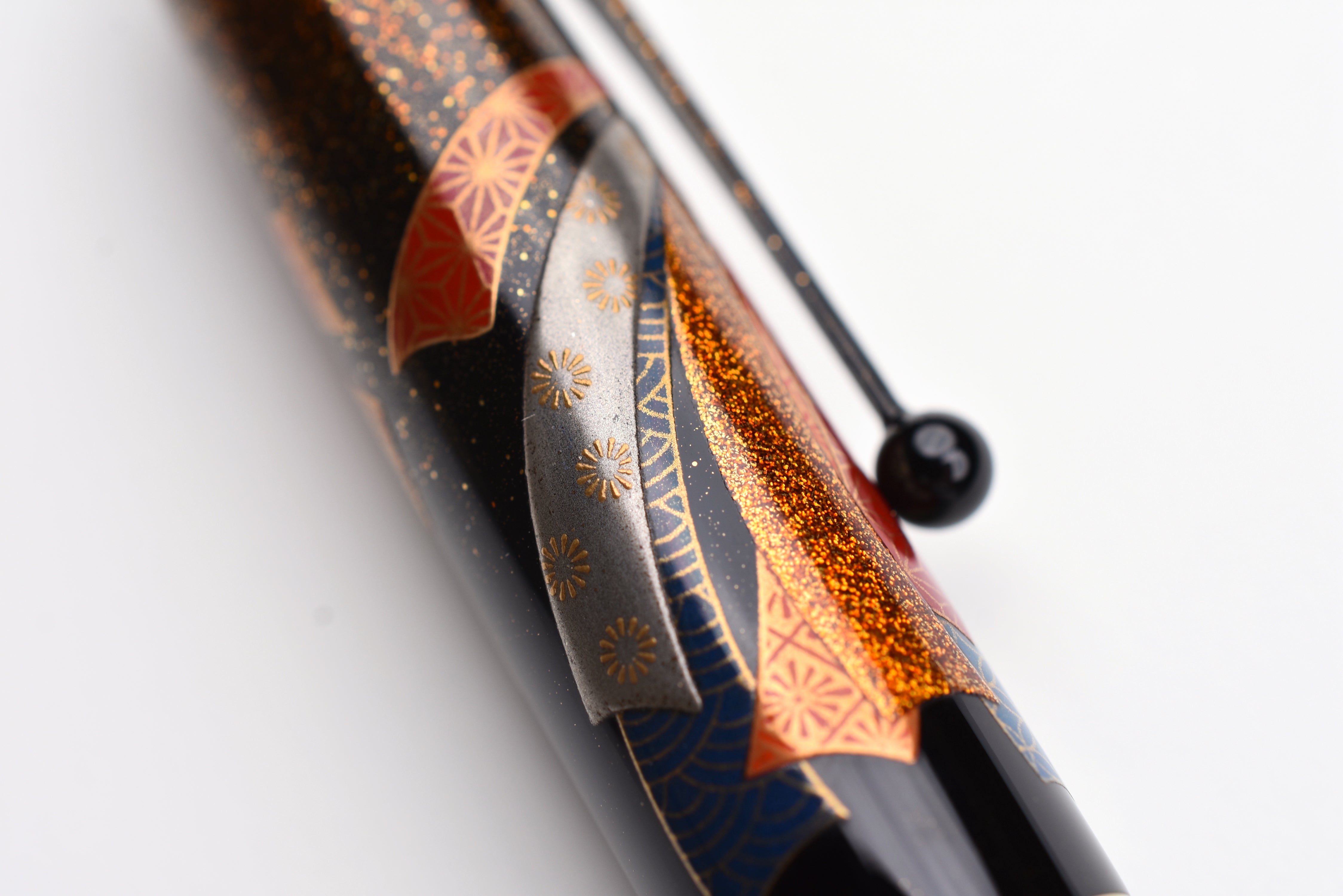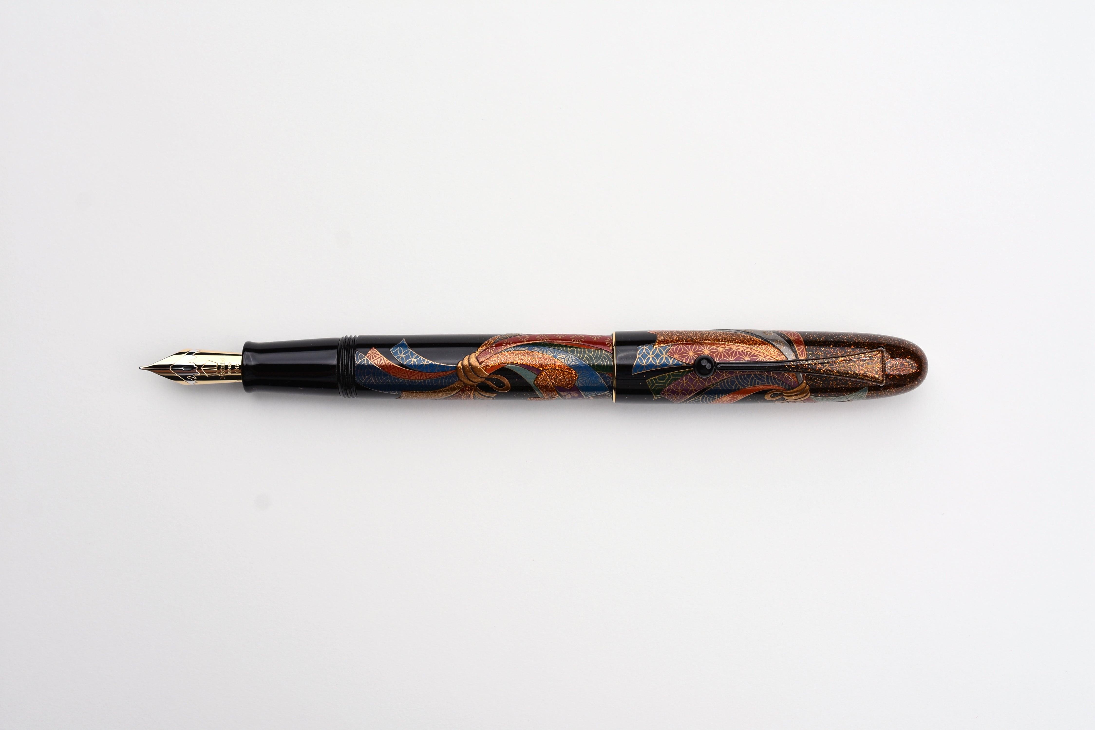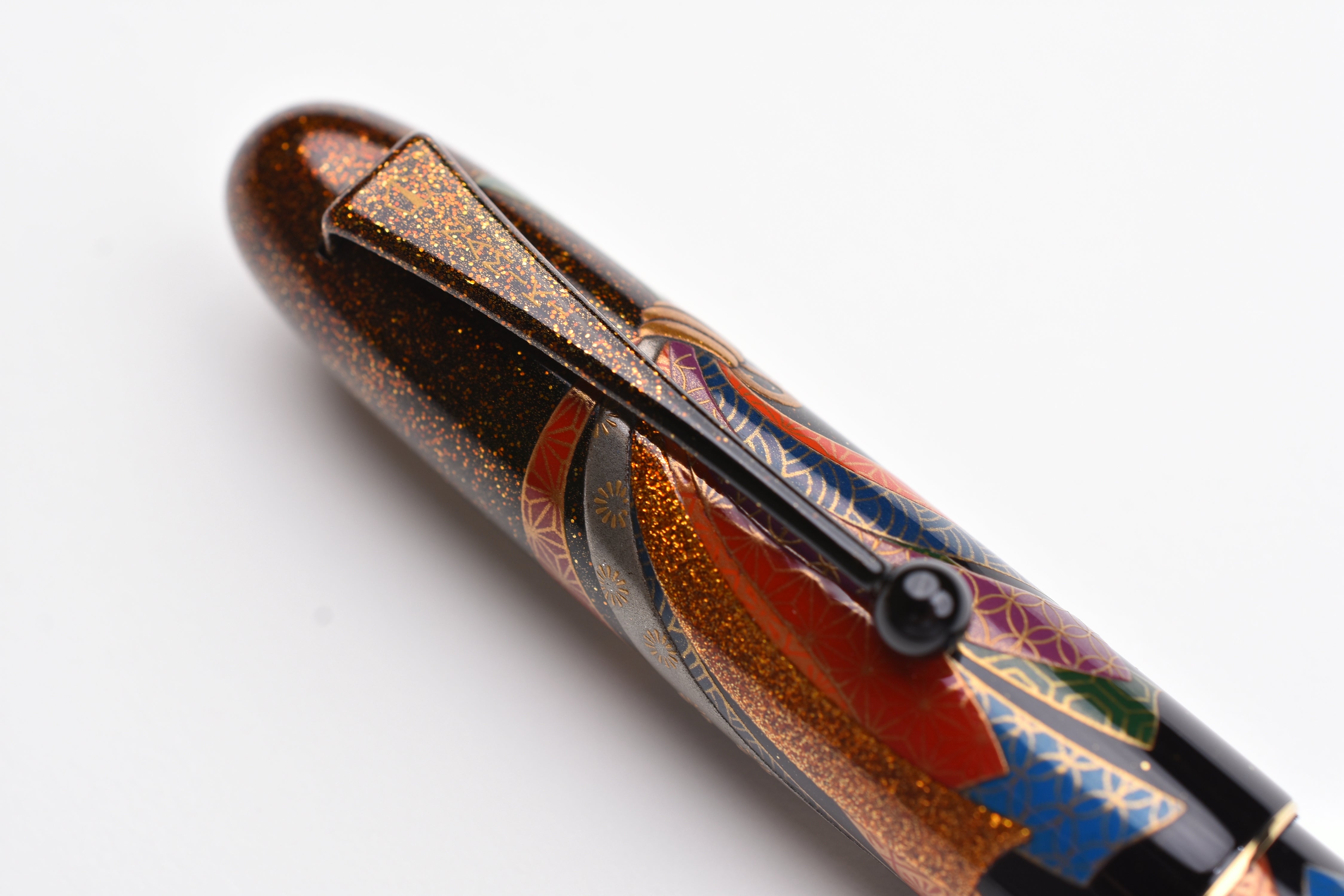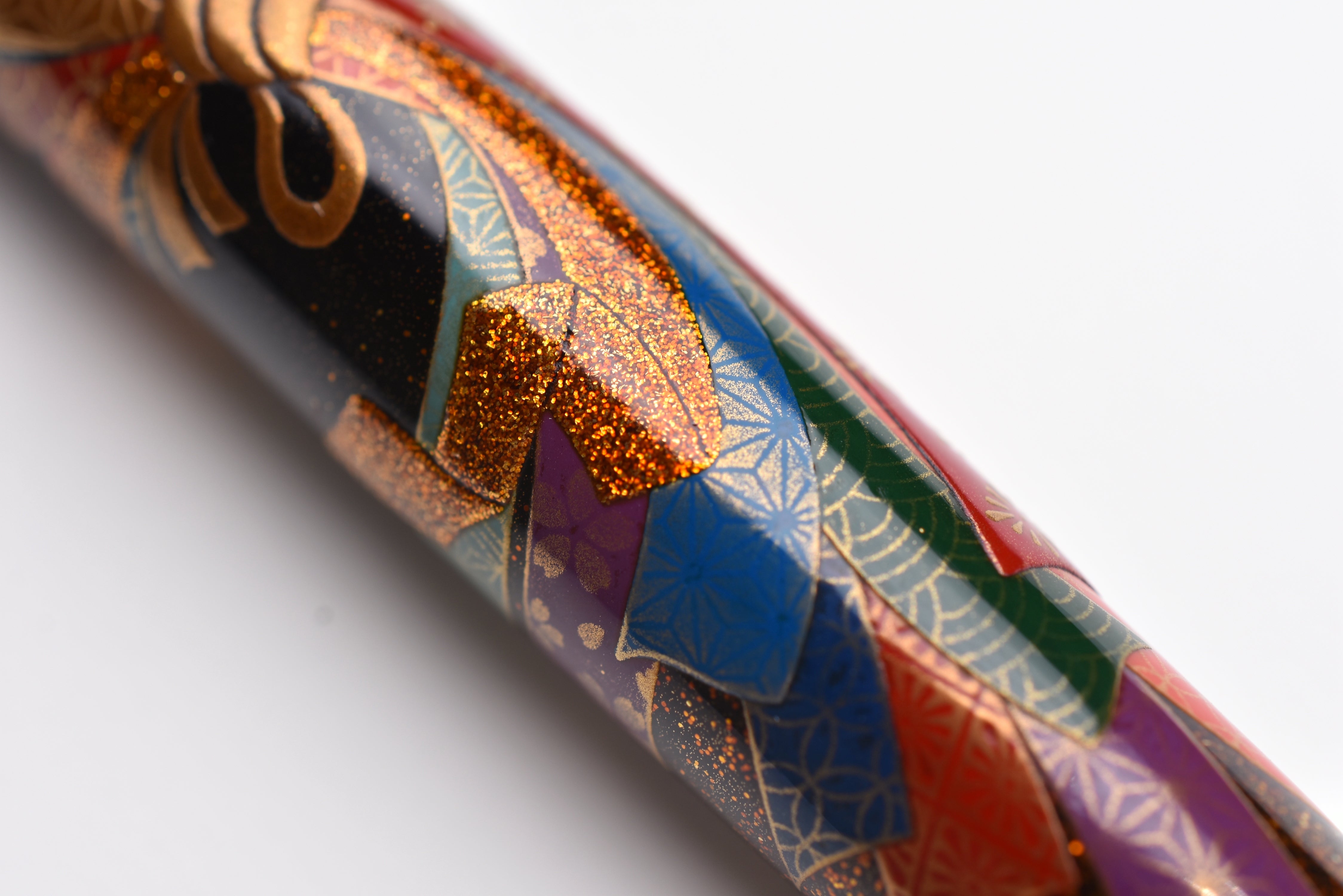 Noshi are decorative bundles made of colored ribbons or folded paper strips that signify good fortune; they are attached to gifts and given on special occasions in Japan. This pen features two ornate noshi bundles, with ribbons of varying colors and patterns; each strand is illuminated with gold glitter and painstakingly rendered details. As this image was created using the Togidashi-Taka Maki-e technique, portions of ribbons also have a raised surface, giving the design texture and great depth. Namiki Yukari Royale - Noshi Bundle was made by master maki-e artist Misa Seki.