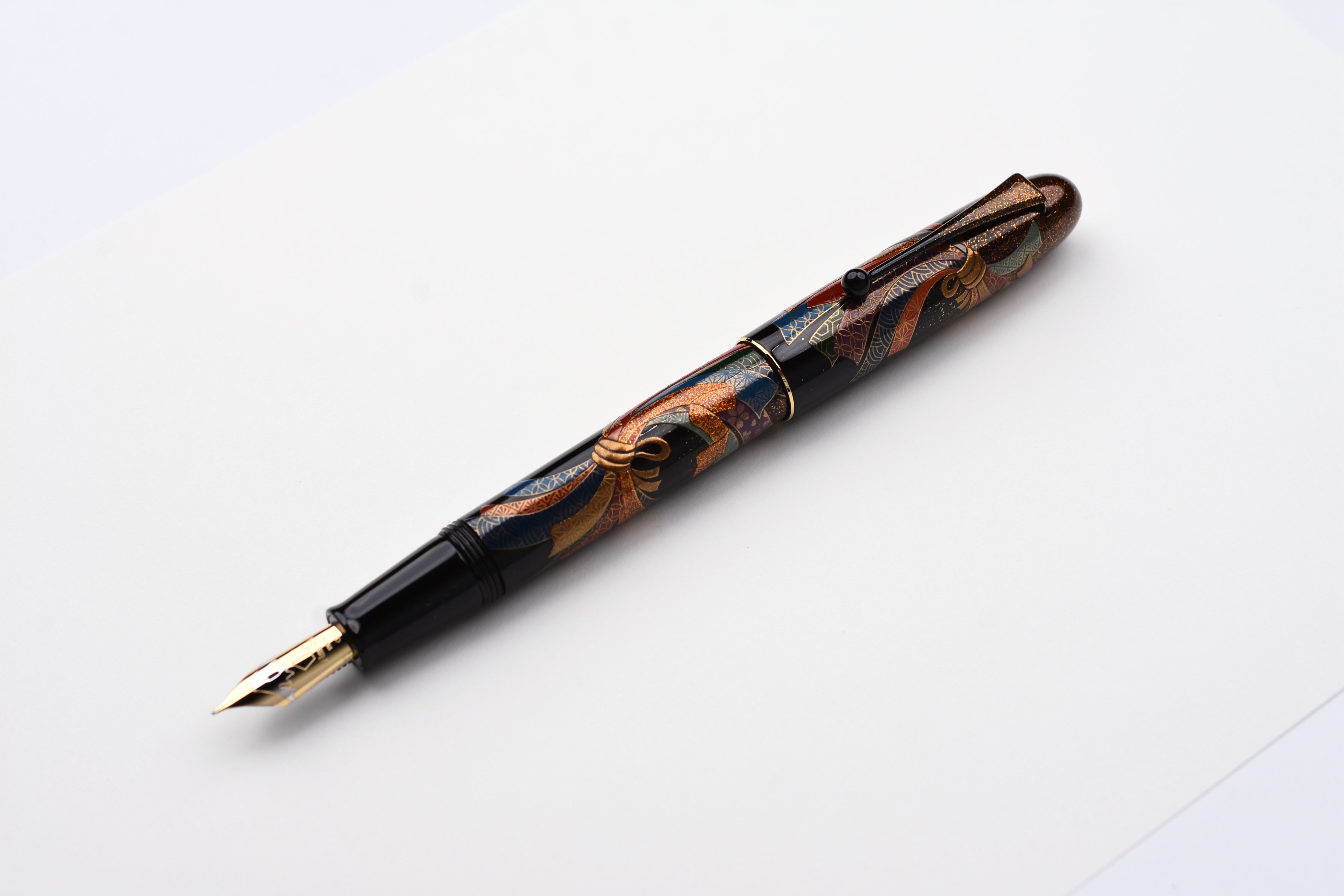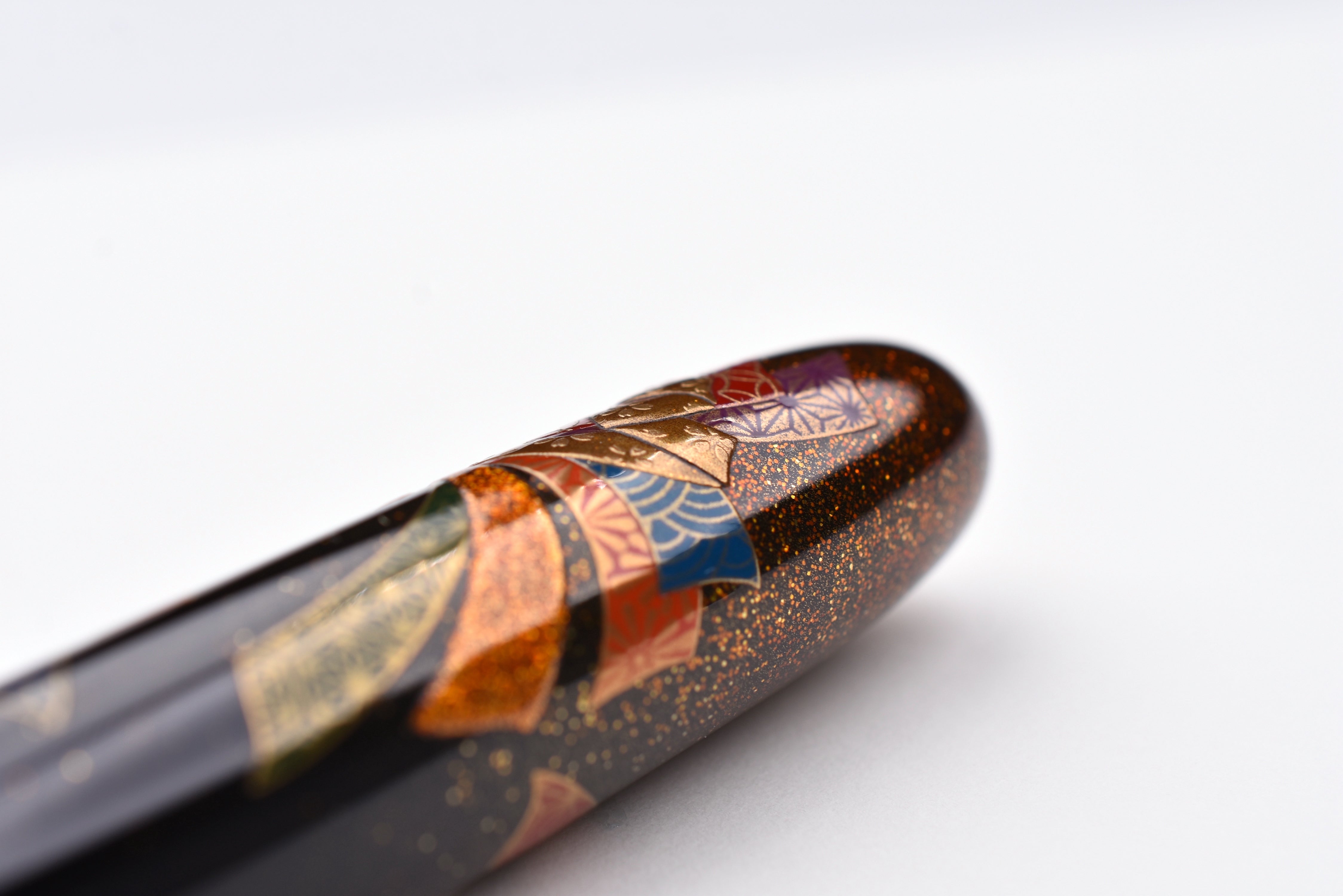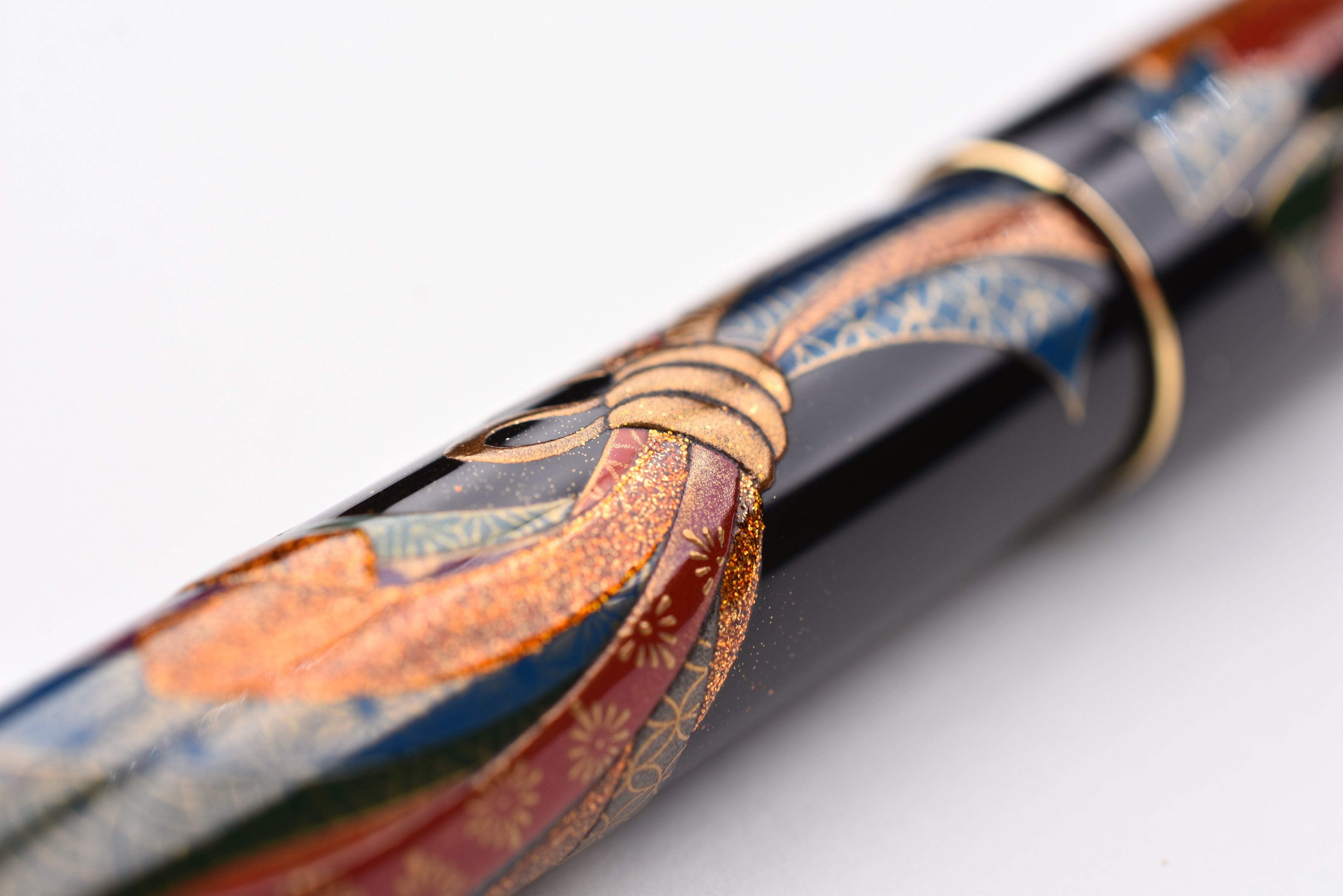 The pens in Namiki's Yukari Royale Collection feature elegant designs on a large ebonite body and size #20 18k gold nib. The motifs are created through the highly advanced Togidashi-Taka Maki-e technique (Burnished-Raised Maki-e), also applied in the creation of pens in Namiki's Emperor collection. First, Togidashi Maki-e (Burnished Maki-e) is used; the background and scenery are painted with lacquer, which are then sprinkled with gold or silver powder and sealed with Urushi lacquer. After drying, the surface is lightly burnished with charcoal, revealing the design underneath. Then, the main design is further rendered through additional use of materials like lacquer and charcoal powder. Finally, Hira-Maki-e (Flat Maki-e) is used to create the last details with layers of metal powder and lacquer. (The Pilot-Namiki website also provides a fascinating peek into the steps of the process here.)