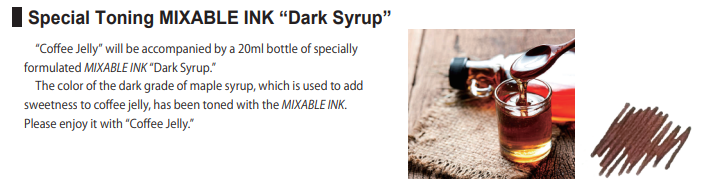 Accompanying the Coffee Jelly pen is a 20ml bottle of specially formulated Mixable ink "Dark Syrup". This ink is a rich lovely brown hue Inspired by the dark grade of maple syrup used to add sweetness to coffee jelly.