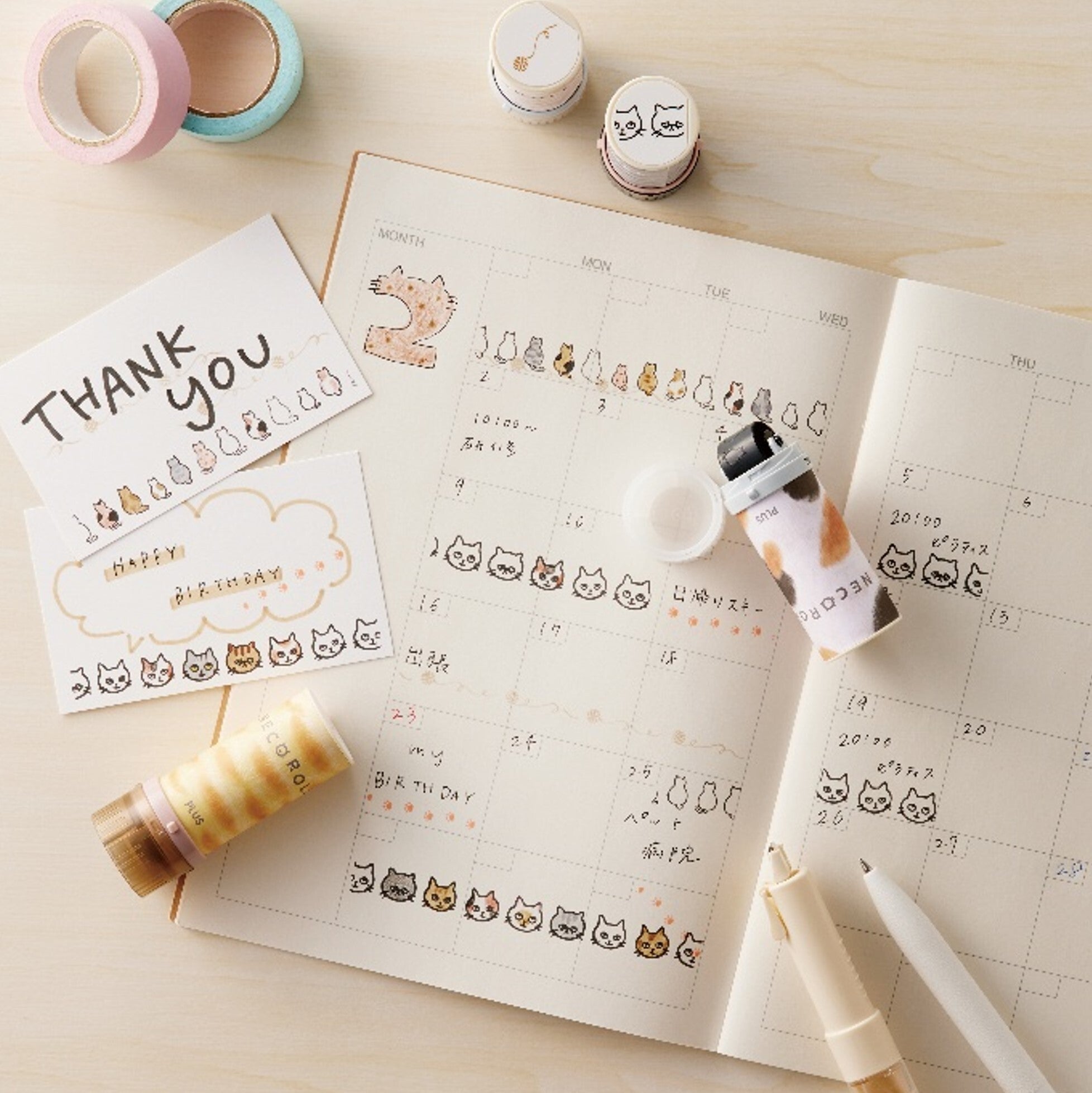 Neco Roll is a limited edition cat-themed decorative roller stamp that adds soft, playful accents to planners, cards, and notebooks with continuous designs such as paw prints, yarn, cat faces, and adorable back view silhouettes. The lightly pigmented ink applies smoothly without bleeding through paper, even when painted over, so you can write or layer on top with ease. To use, simply uncap and roll to create consistent patterns, then recap after use to keep it fresh.