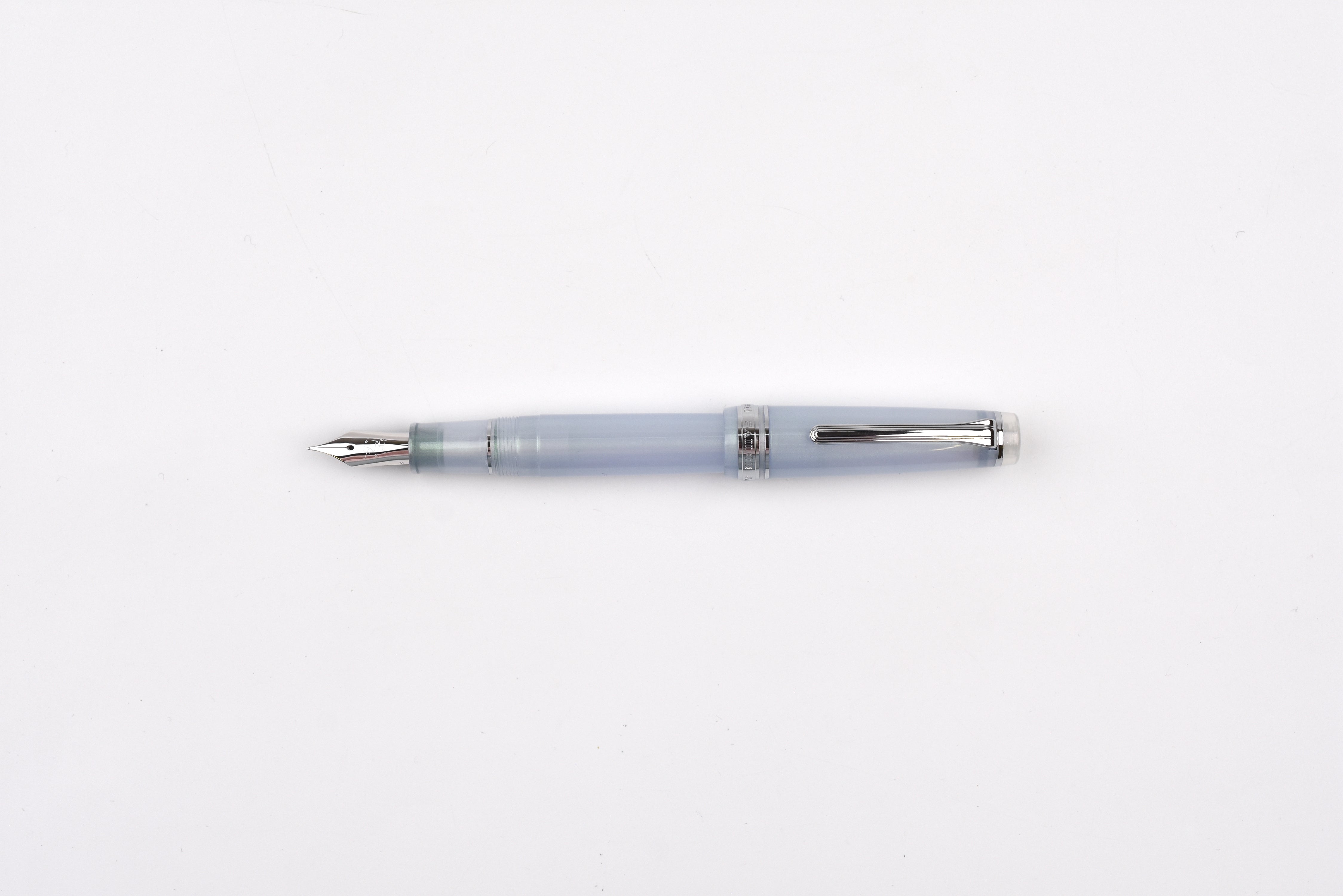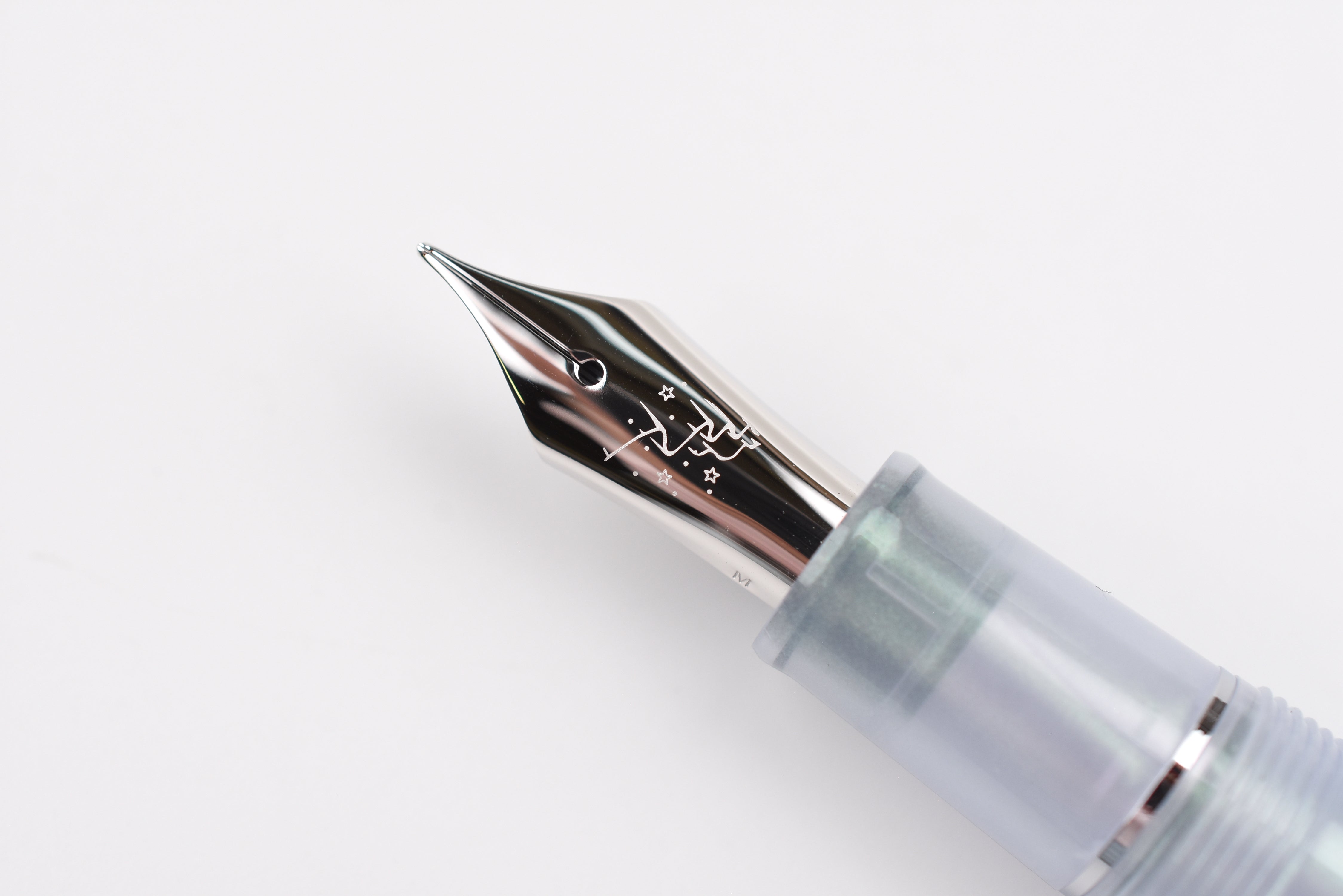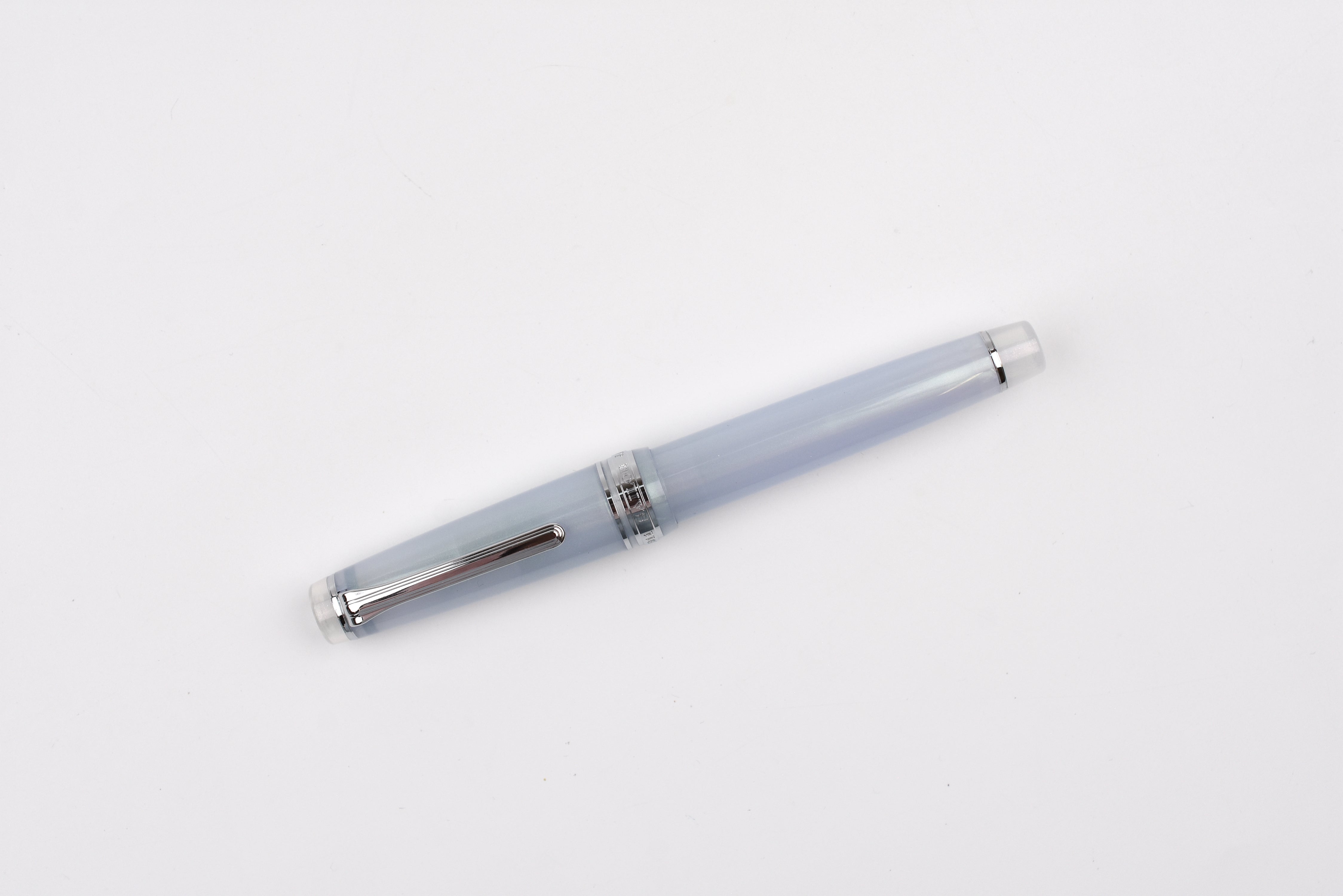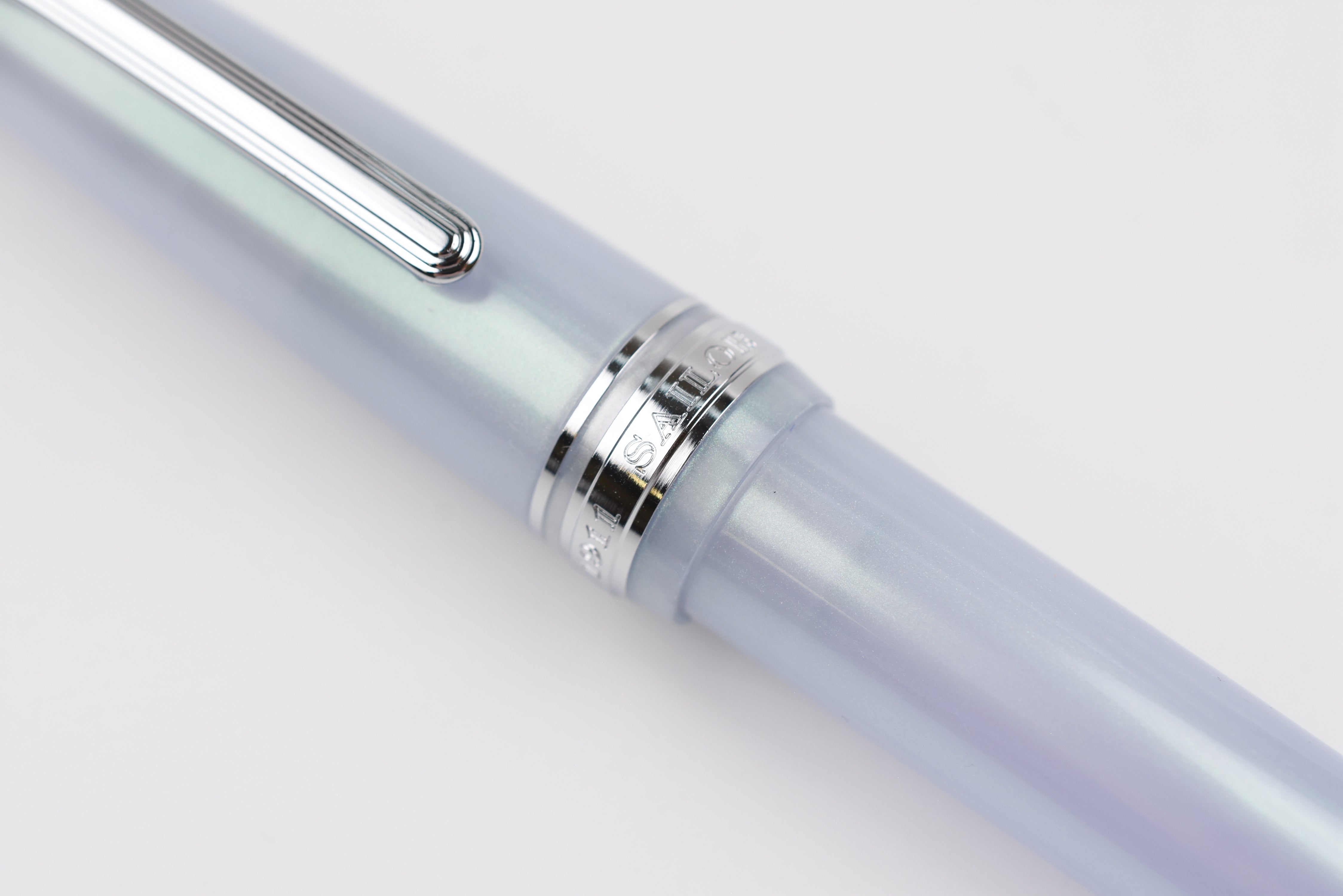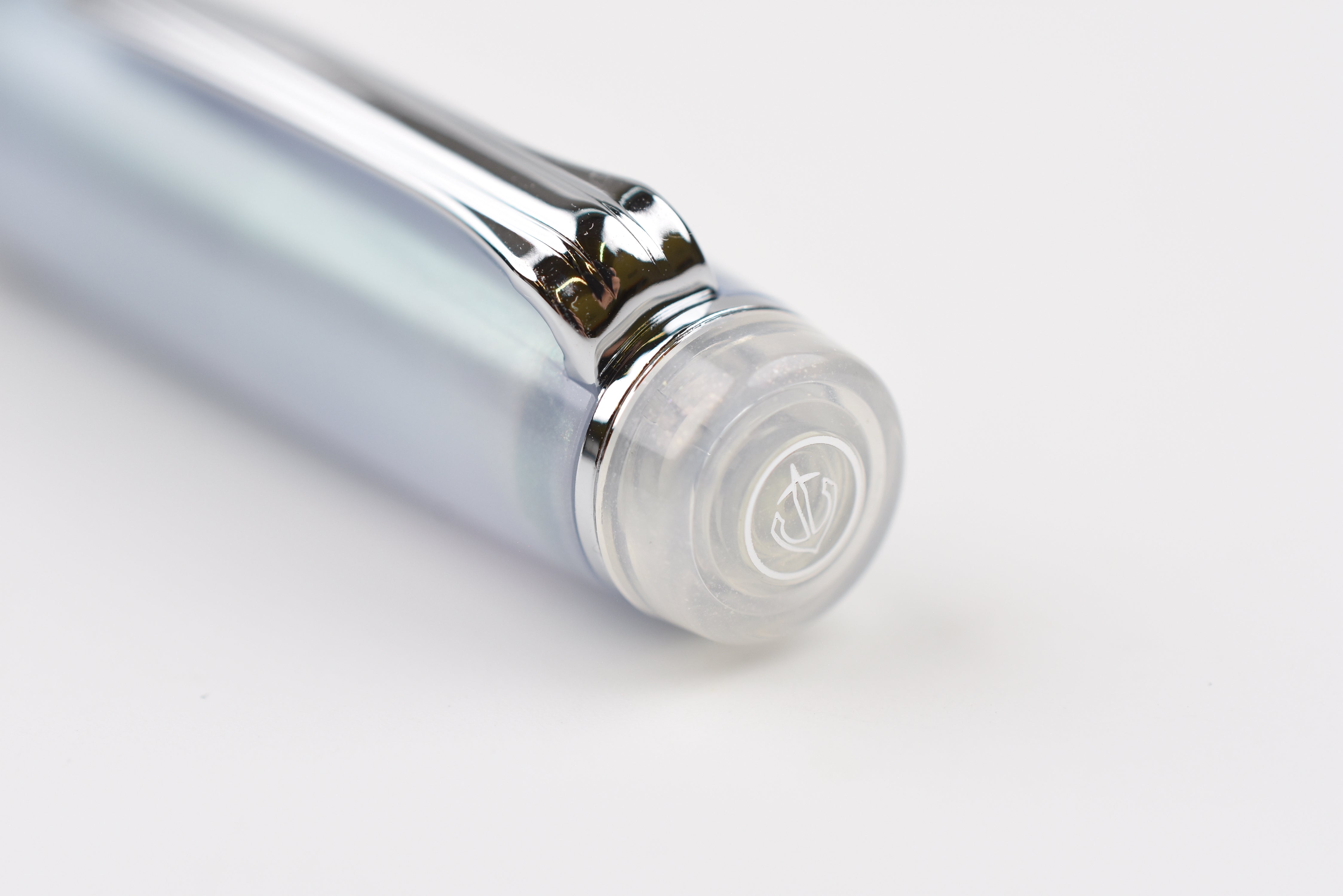 This Aurora pen has a pearlescent pale blue body containing iridescent green shimmer that resembles the Aurora Borealis. The ends are a translucent white pearl with tiny shimmer particles, and the 21K rhodium plated gold nib is engraved with an aurora motif that makes each written word feel ethereal.