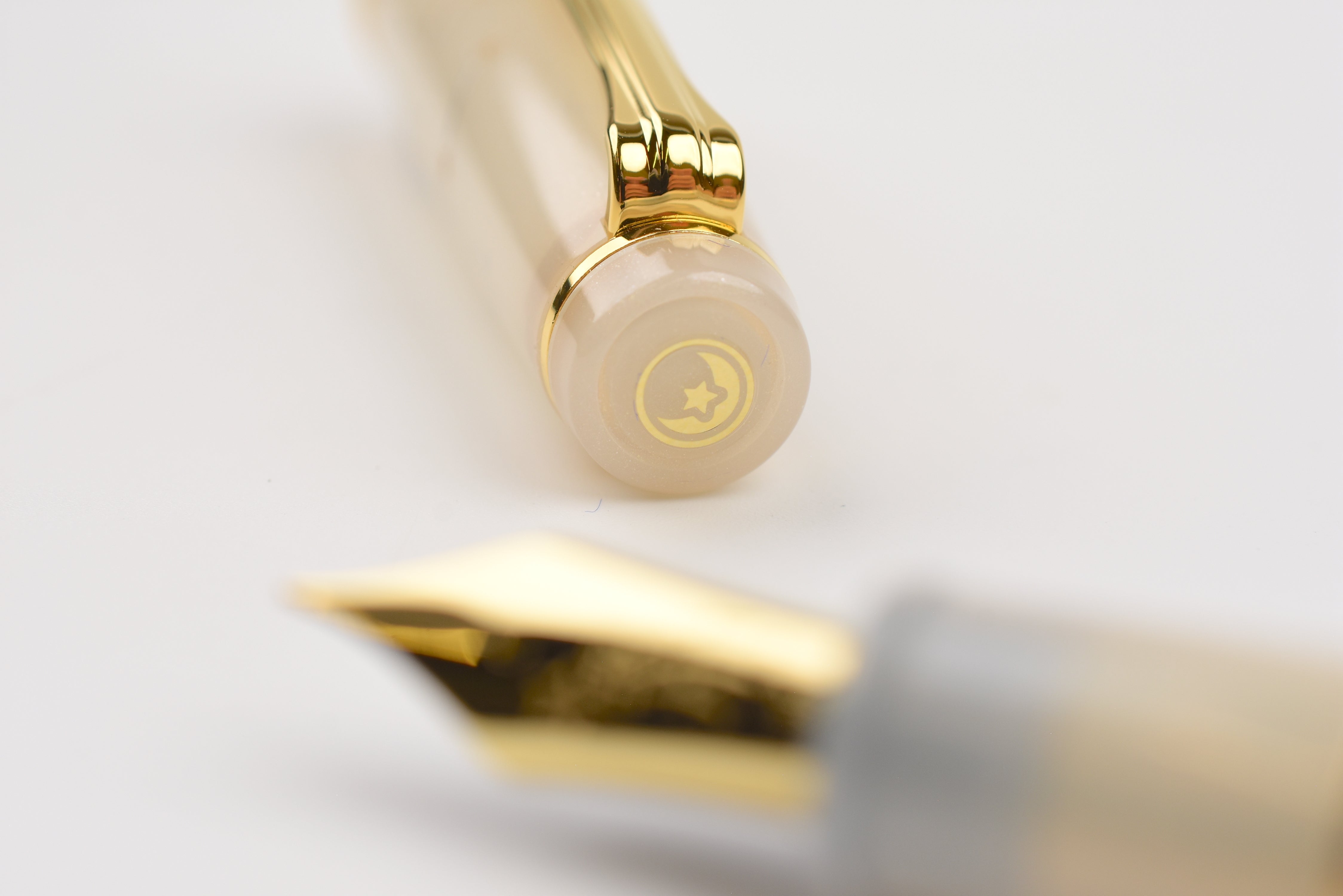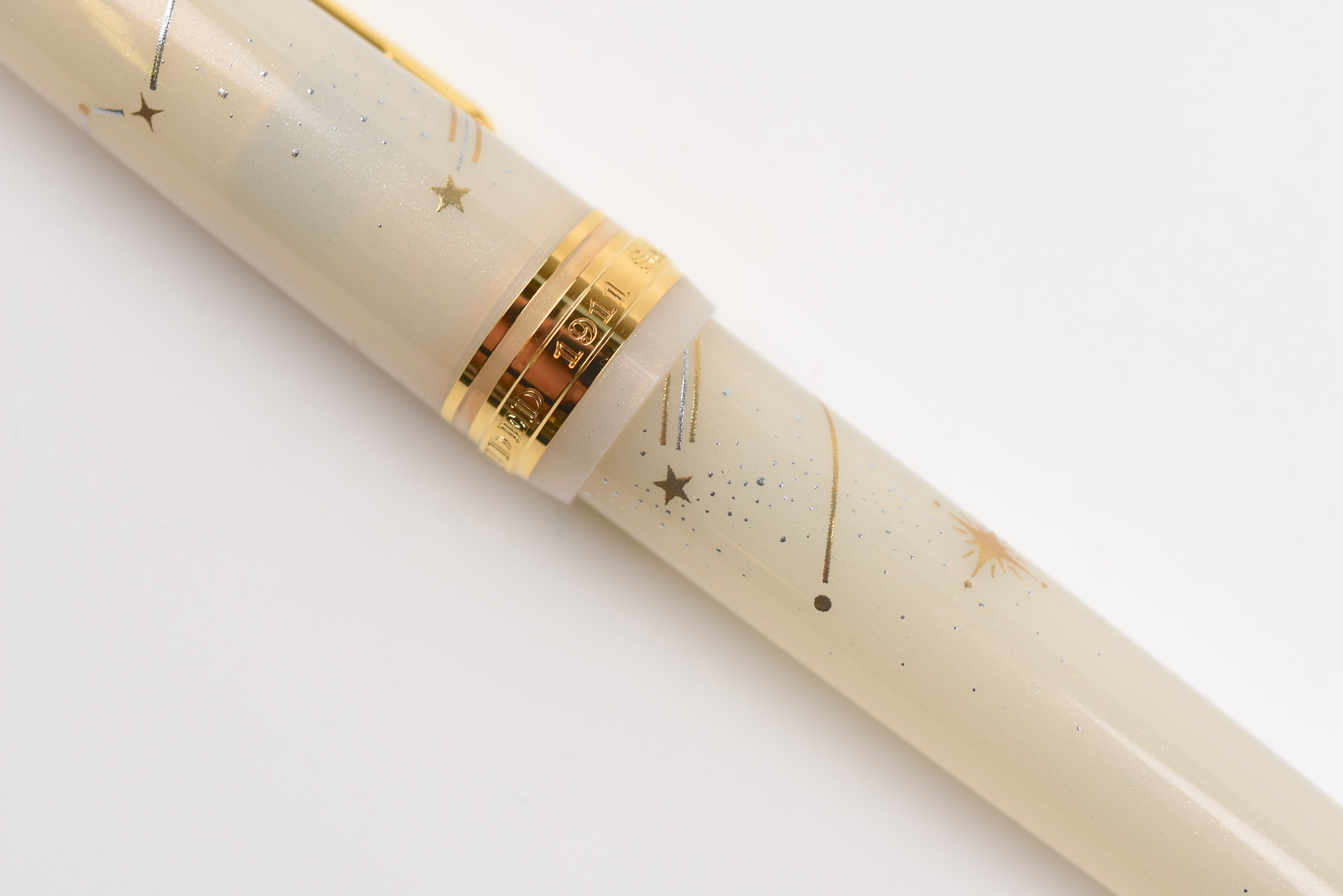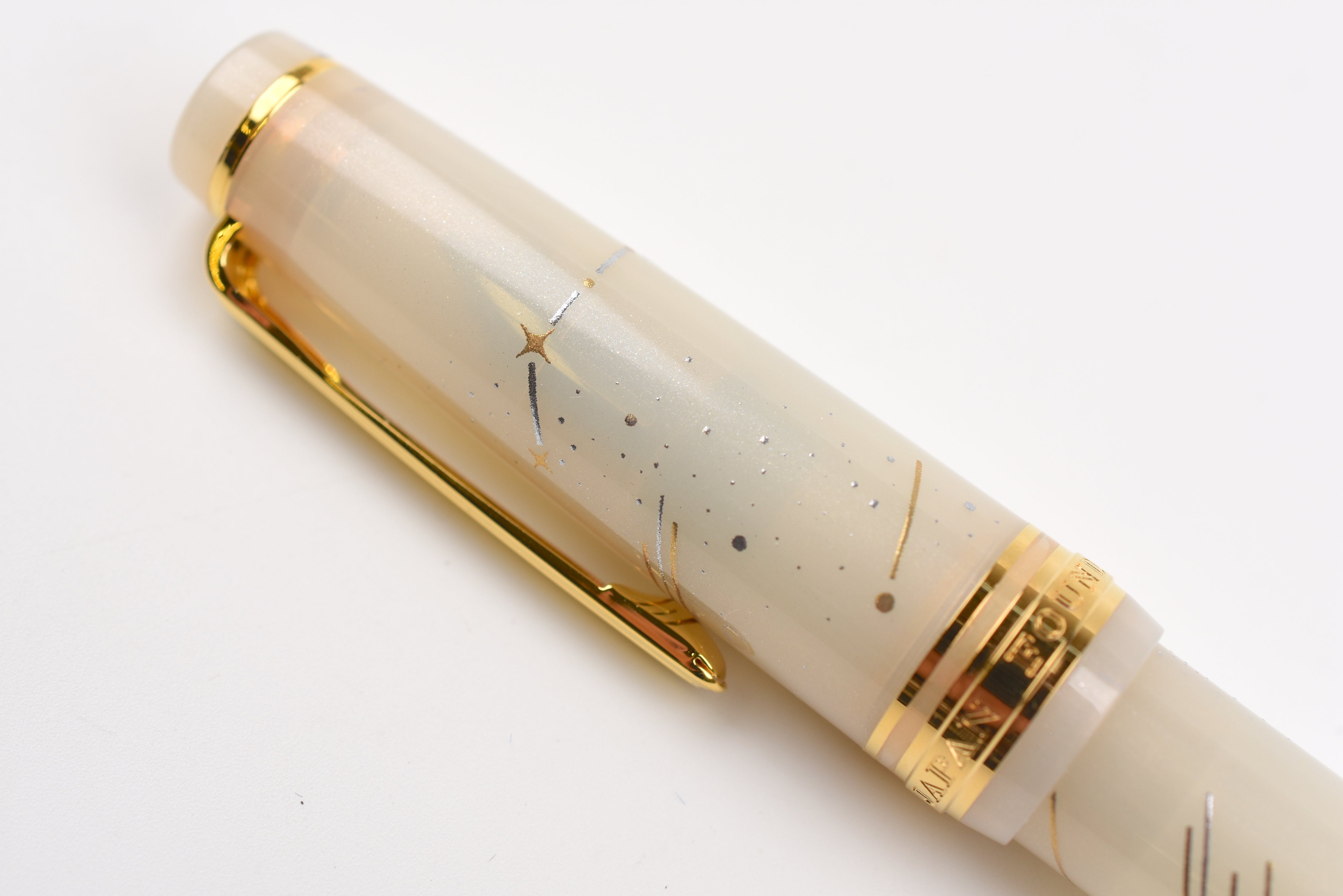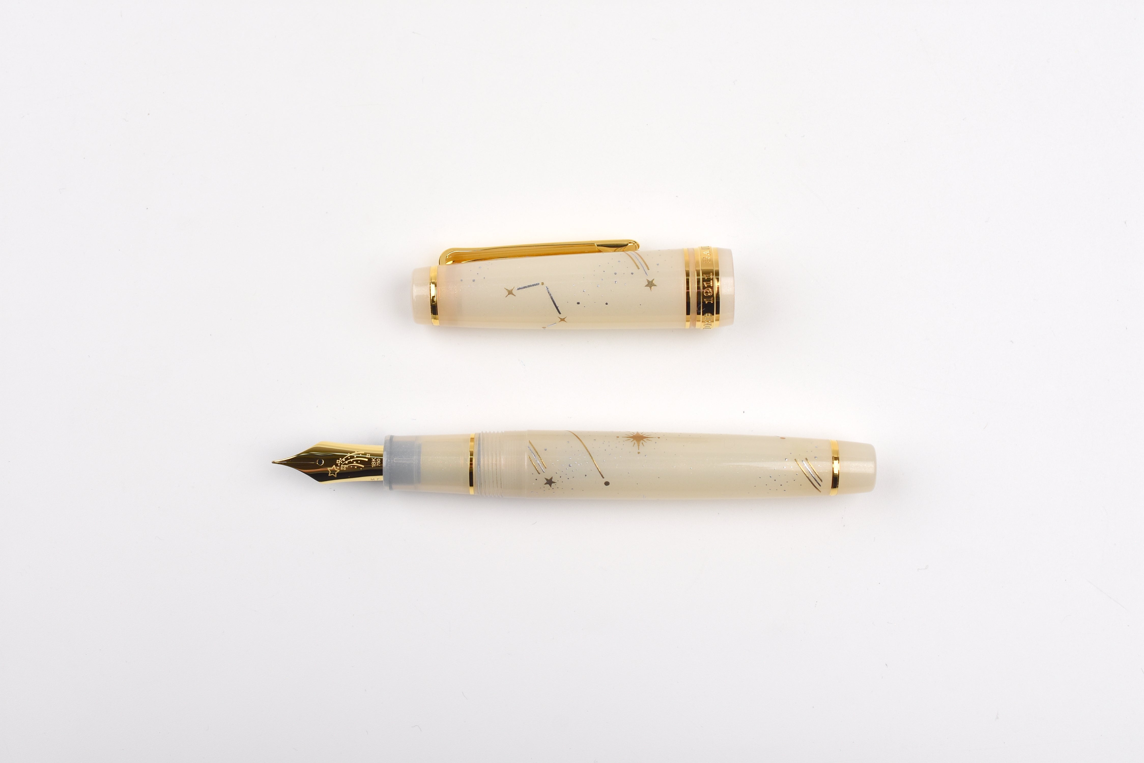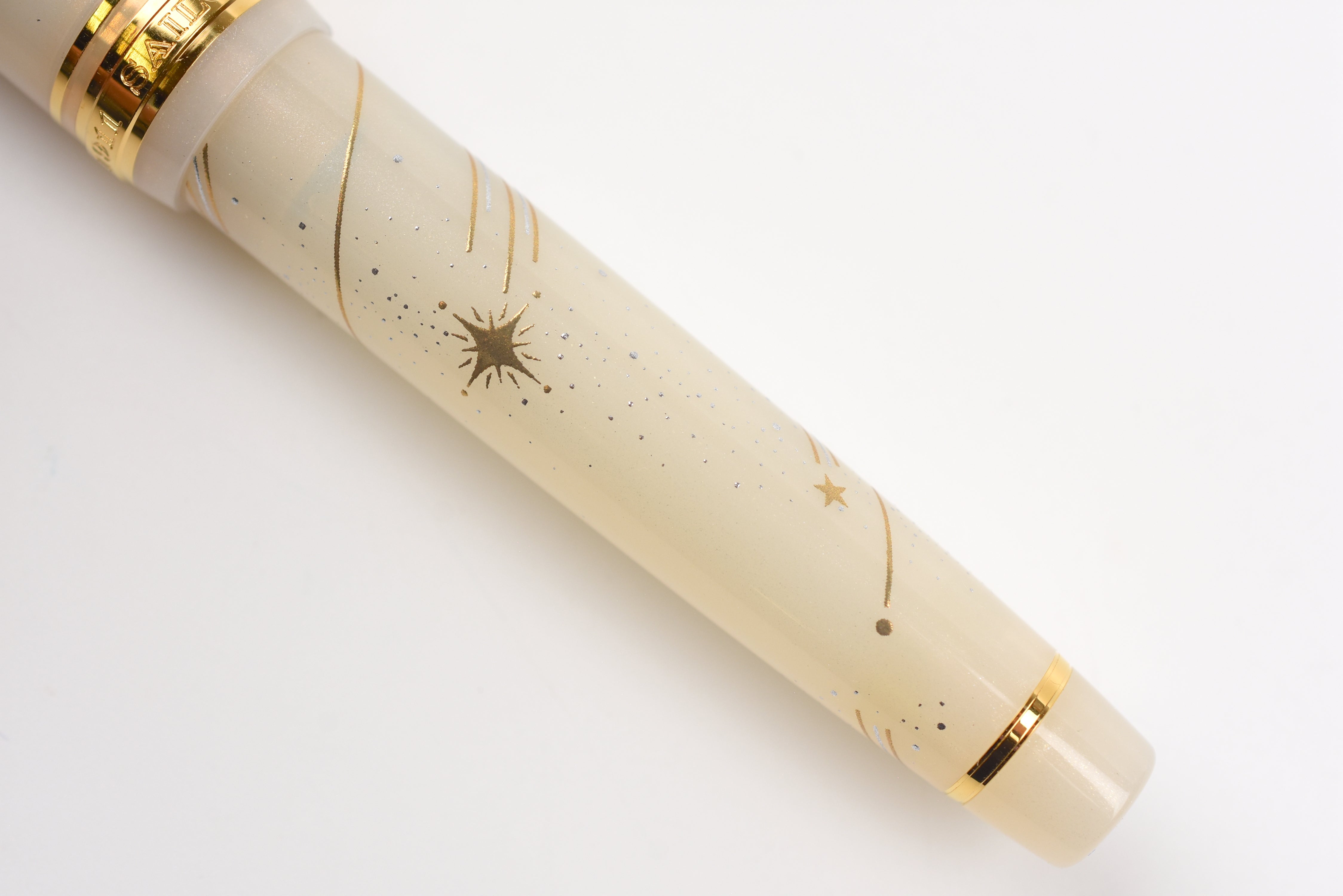 This Shooting Star pen has a milky off-white body sprinkled with delicate shimmer, adorned with golden and silver constellation patterns that sparkle like starlight. The 18K gold nib is engraved with a shooting star motif that makes each written word feel magical. The finial is adorned with another shooting star. Posting not recommended to preserve the longevity of the painted designs.