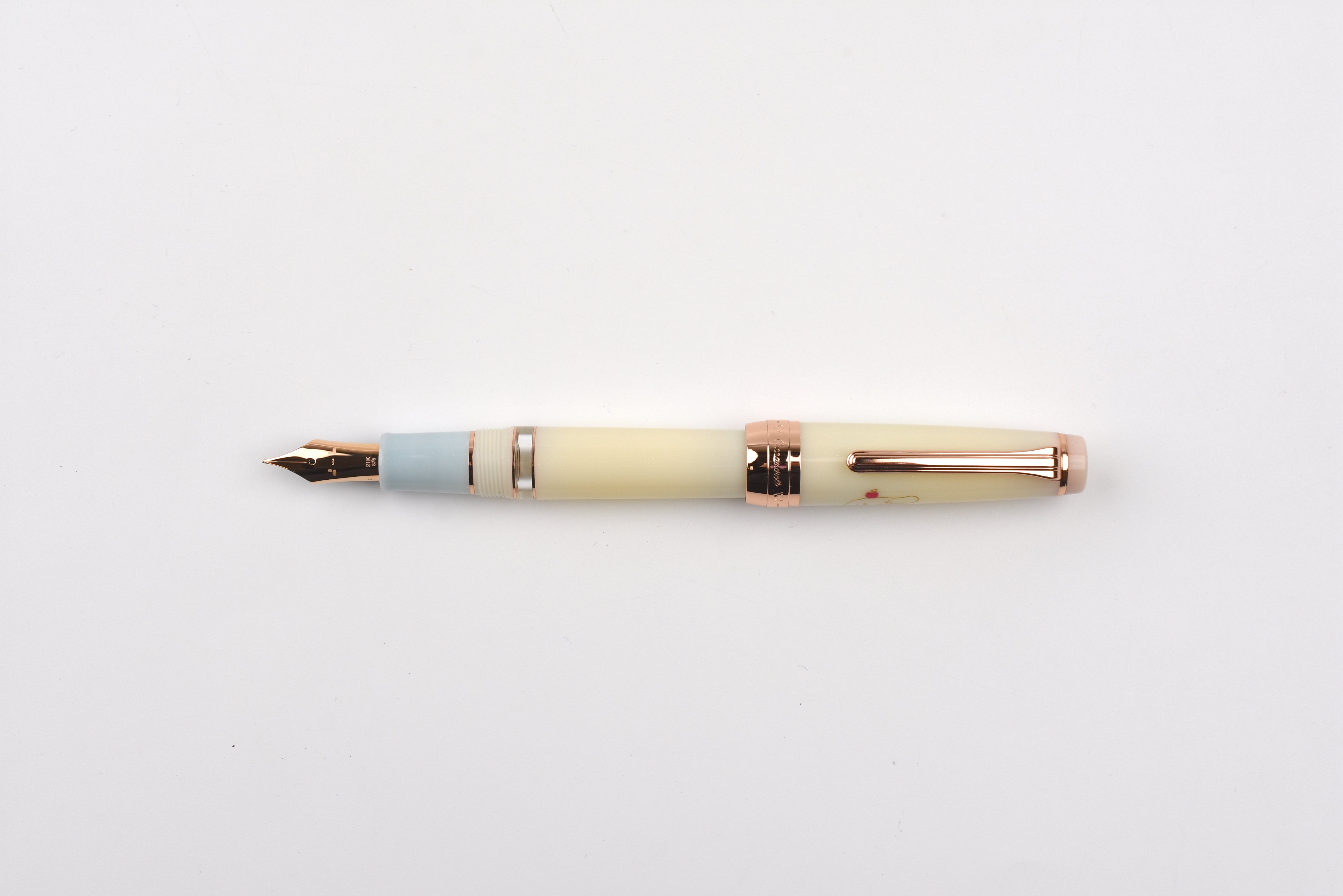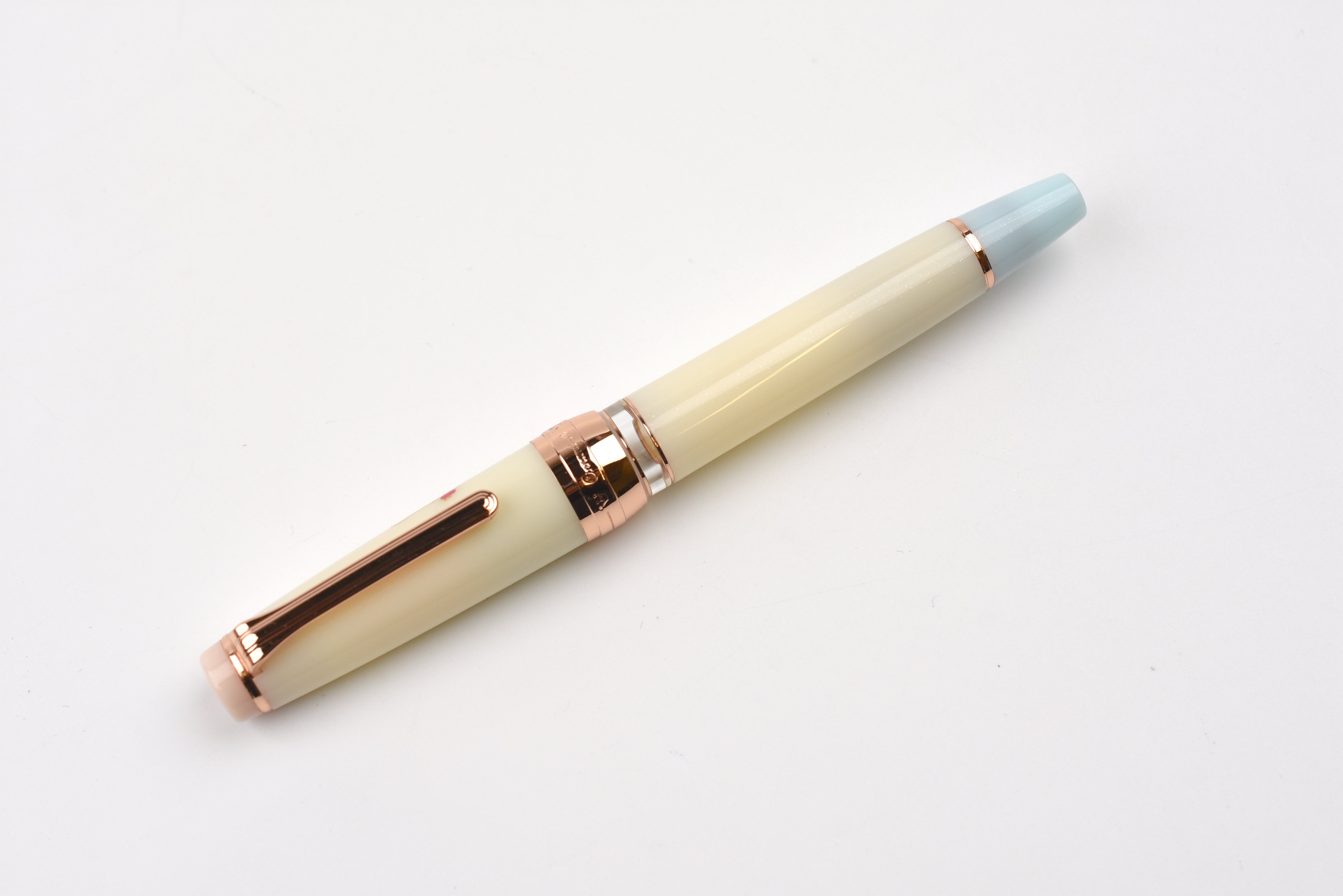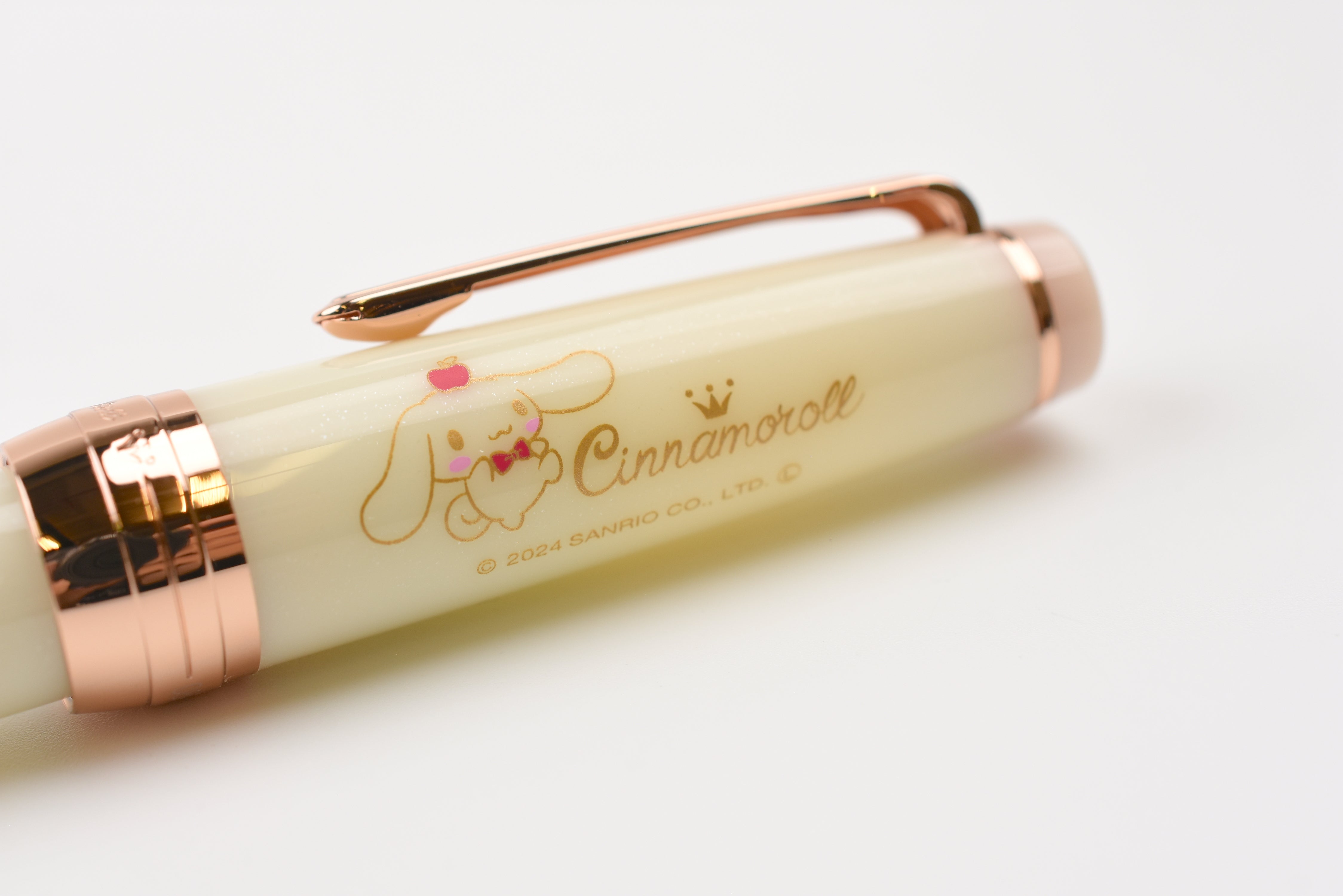 This special collaboration model with Sanrio's popular Cinnamoroll character captures the elegant and cute design of the world of Cinnamoroll. Rose gold accents on the clip and ring add a touch of luxury, and the cap and finial have a special design of the Cinnamoroll logo motif. The pen itself utilizes a piston filling mechanism, and features an ink window so you can see when it's time to refill your pen. Equipped with a 21k gold nib, the nib has Cinnamoroll's face specially engraved on the surface. Limited to 100 pieces worldwide, this pen is a cute one to have in any collection.