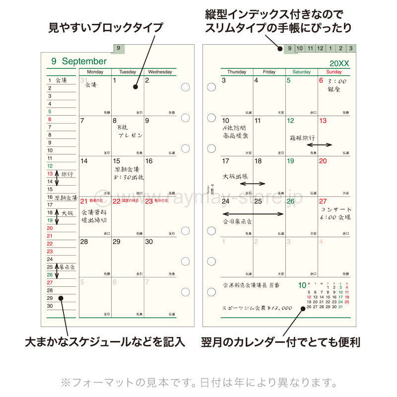 This monthly planner refill features a vertical monthly block format starting on Monday, with an index on both sides of the spread.