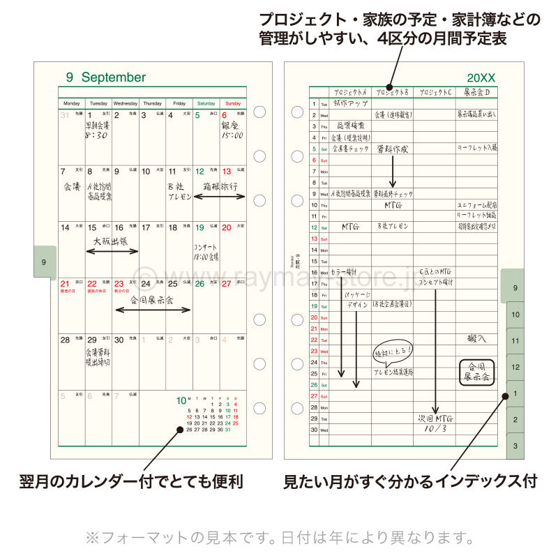 This monthly planner refill features a single-sided monthly block format that starts on Monday, paired with a single-sided monthly list layout for writing up to four plans. It also includes an index for quickly locating each month.