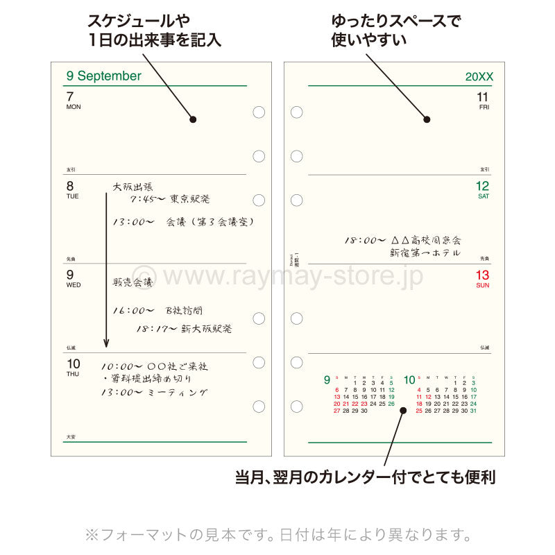 This weekly planner refill features a double-sided spread for one week, with ample space for each day to write detailed schedules.