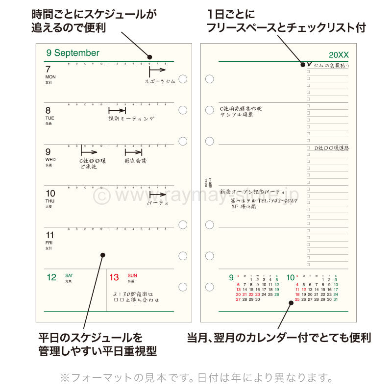 This weekly planner refill features a one-sided weekly layout with a time scale and weekday emphasis. The weekly schedule is on the left page, while the right page provides space for notes and checklists. The time scale makes it easy to organize and manage your schedule by the hour.