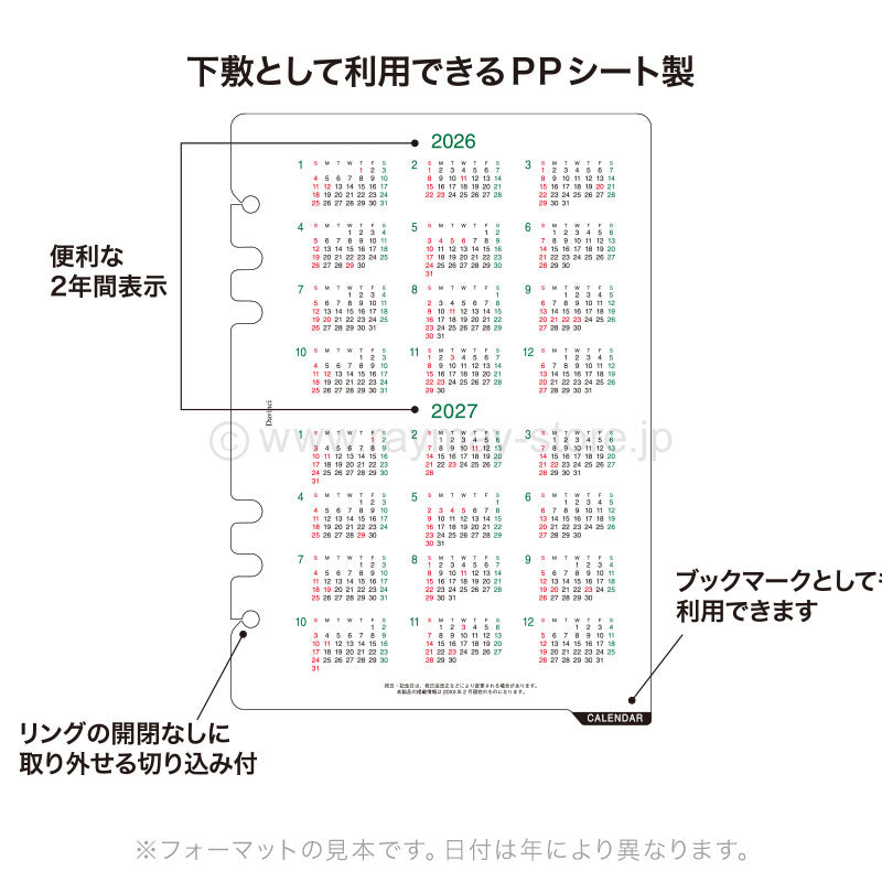This planner refill features a two-year calendar covering 2026 to 2027, printed on a highly transparent PP sheet. It is rigid, so it can also be used as a desk pad.