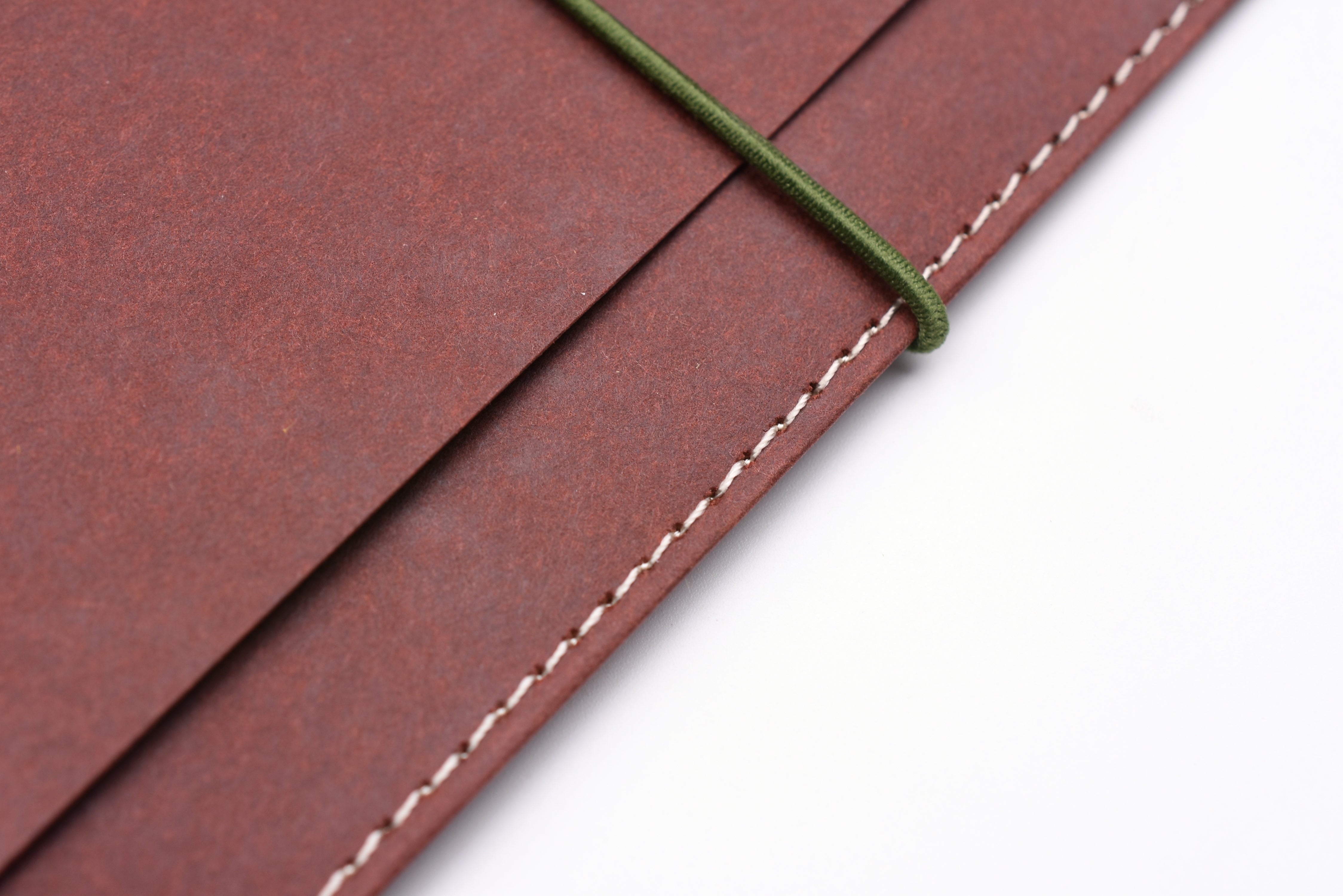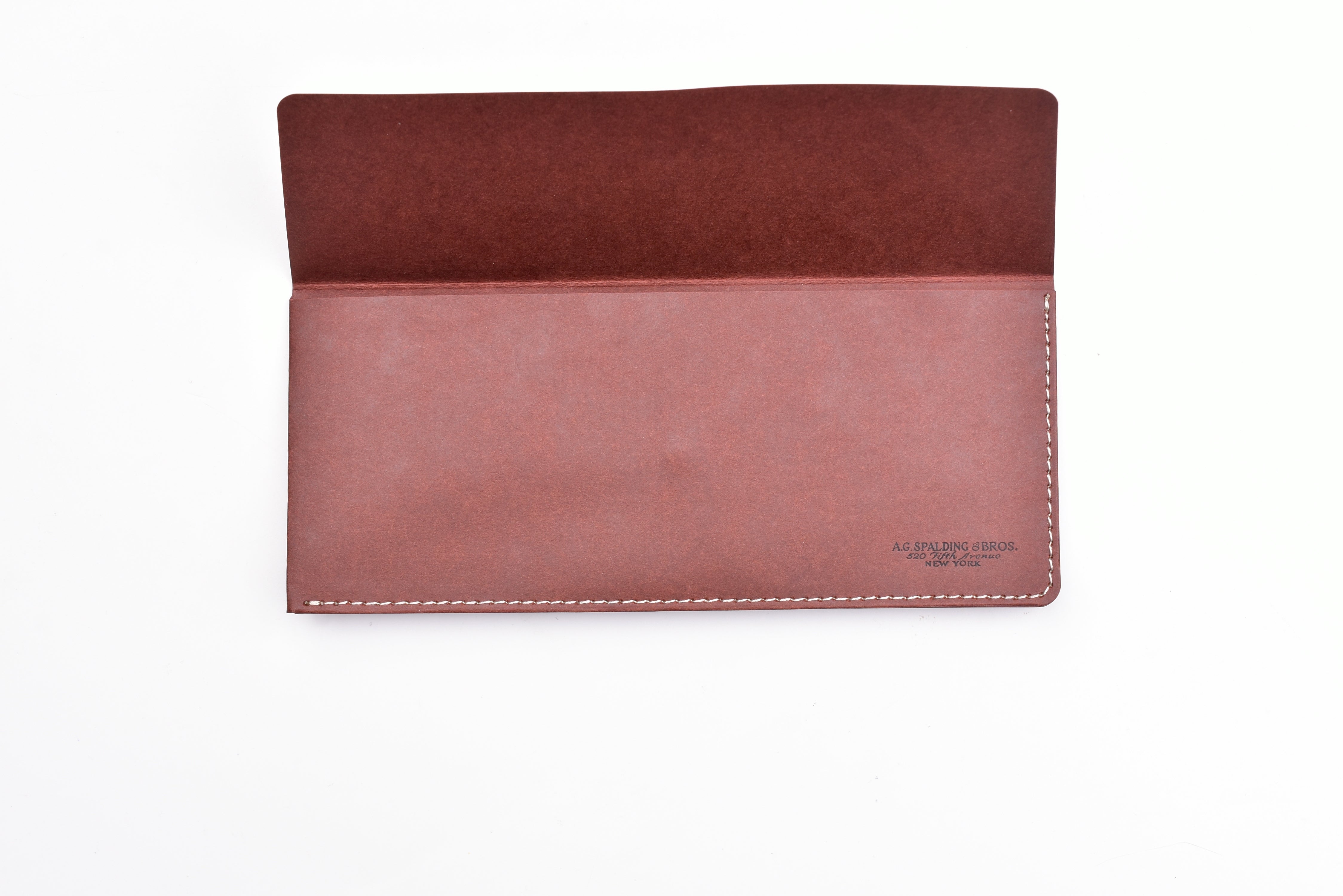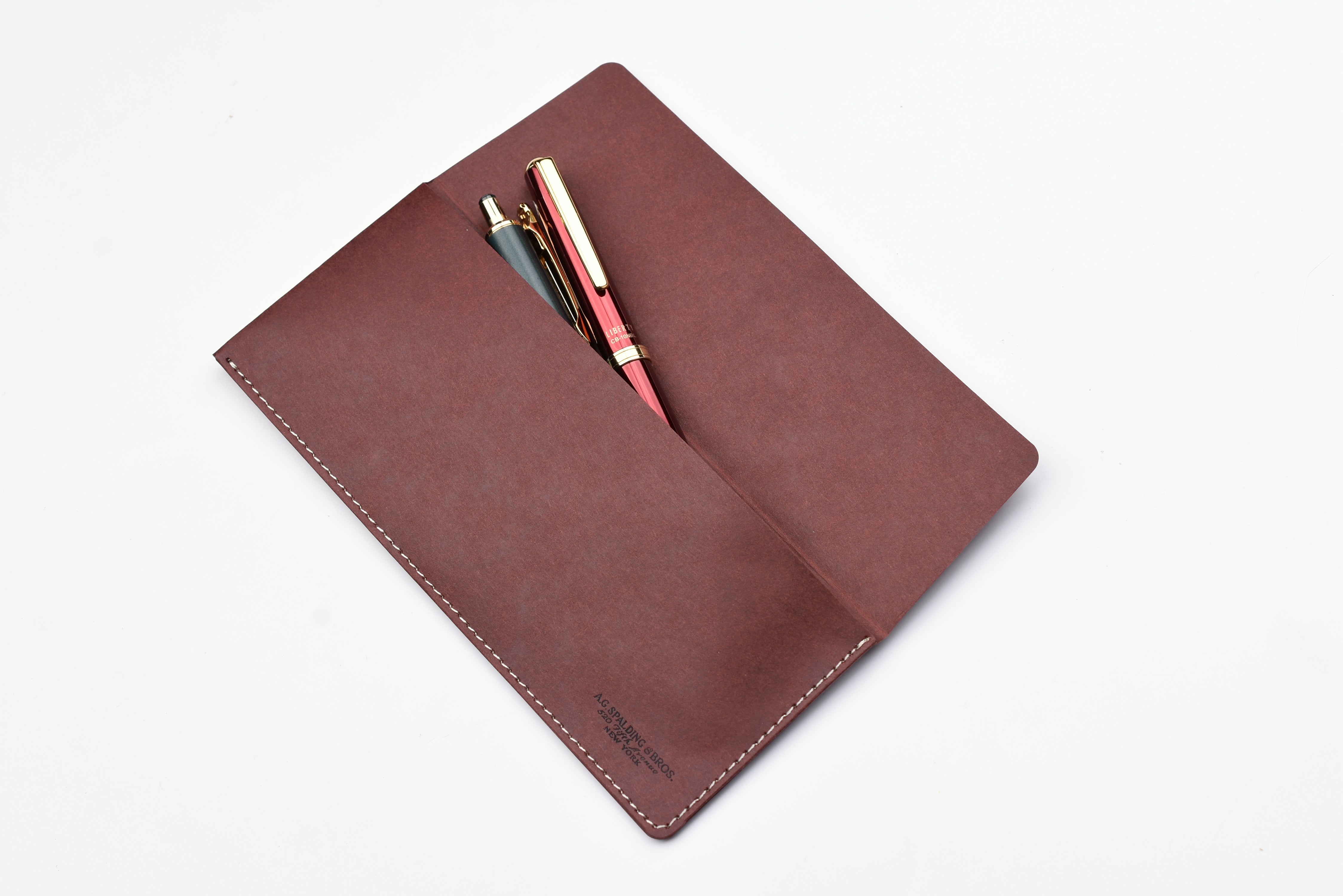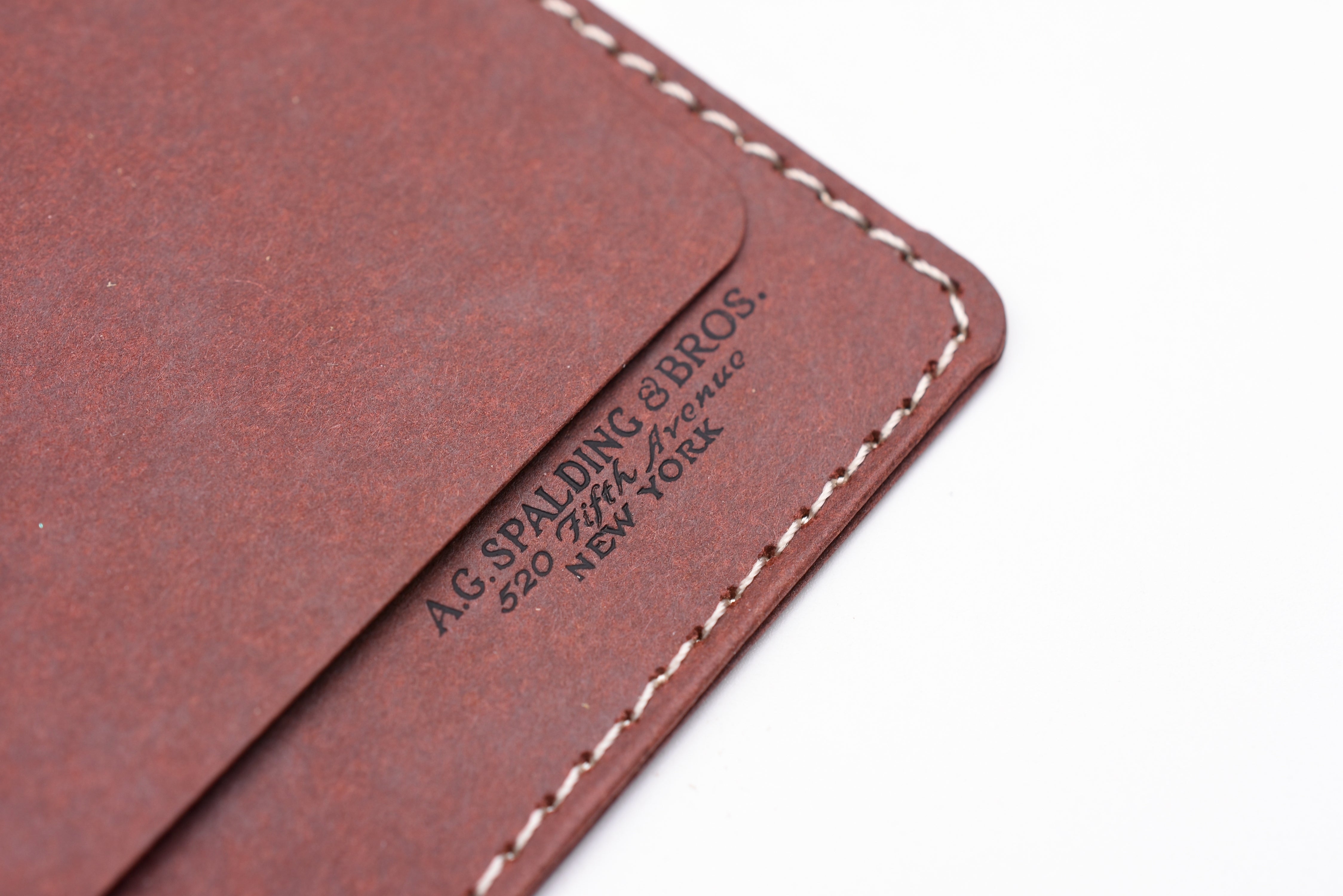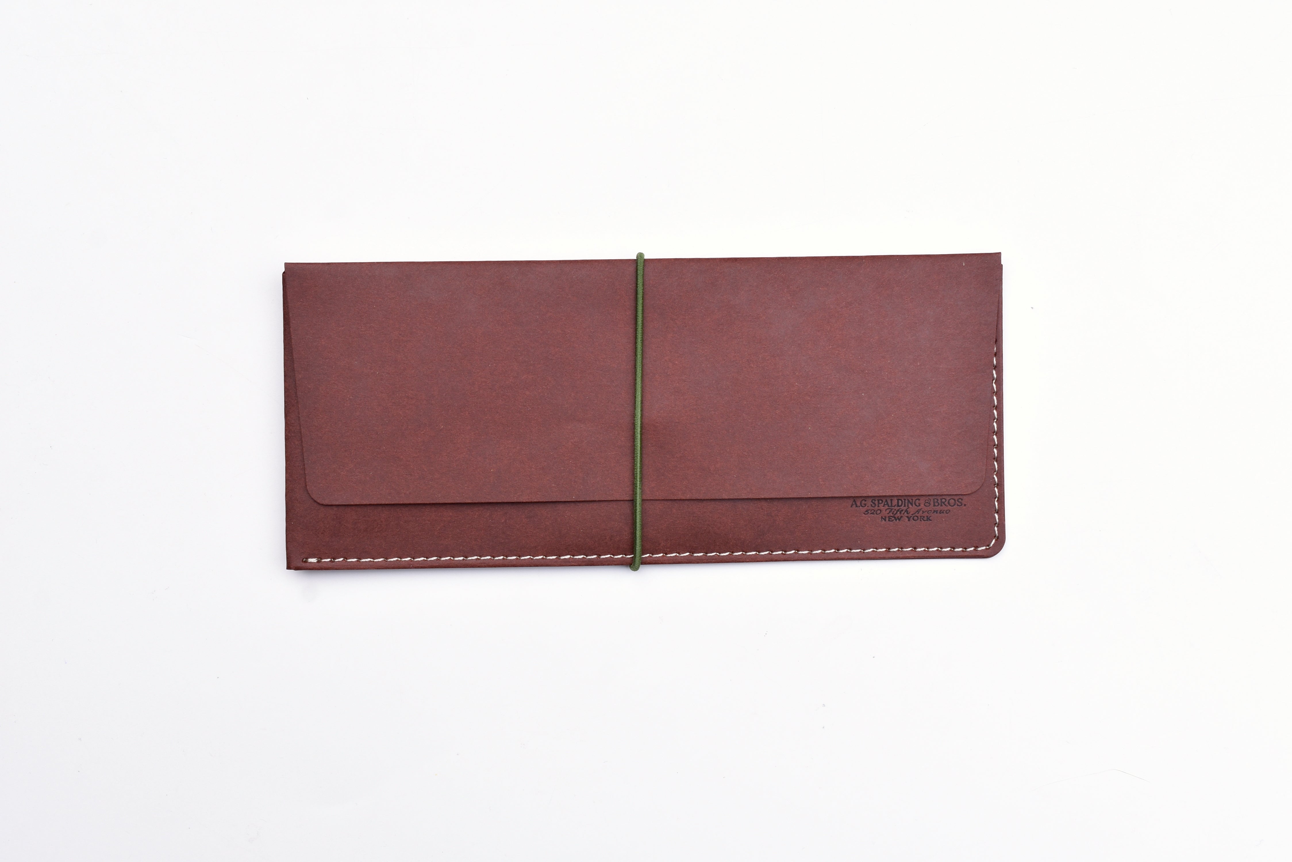 This pen case made in collaboration with renowned A.G. Spalding & Bros. features a special paper material called Cordoba. The unique material feels similar to supple leather and will wear and wrinkle nicely over time. This case has one pocket with a fold over flap and a band closure. There is thick white stitching around the edges that is inspired by vintage American sports products.