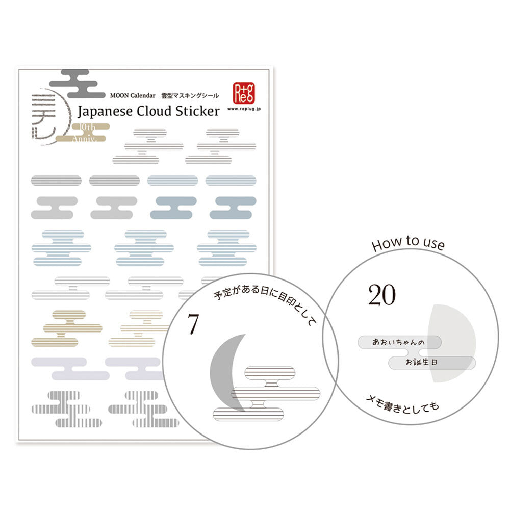 commemorate the 10th anniversary of Michiru, Replug's most well-known moon phase calendar. The stickers are cloud-shaped stickers made out of masking tape (washi tape), with classical patterns that can be used to mark the Replug calendar without interrupting its design. Use them to mark the days when you have plans, or write notes on them with an oil-based ballpoint pen. Enjoy creating a unique moonscape that combines minimal design and functionality.