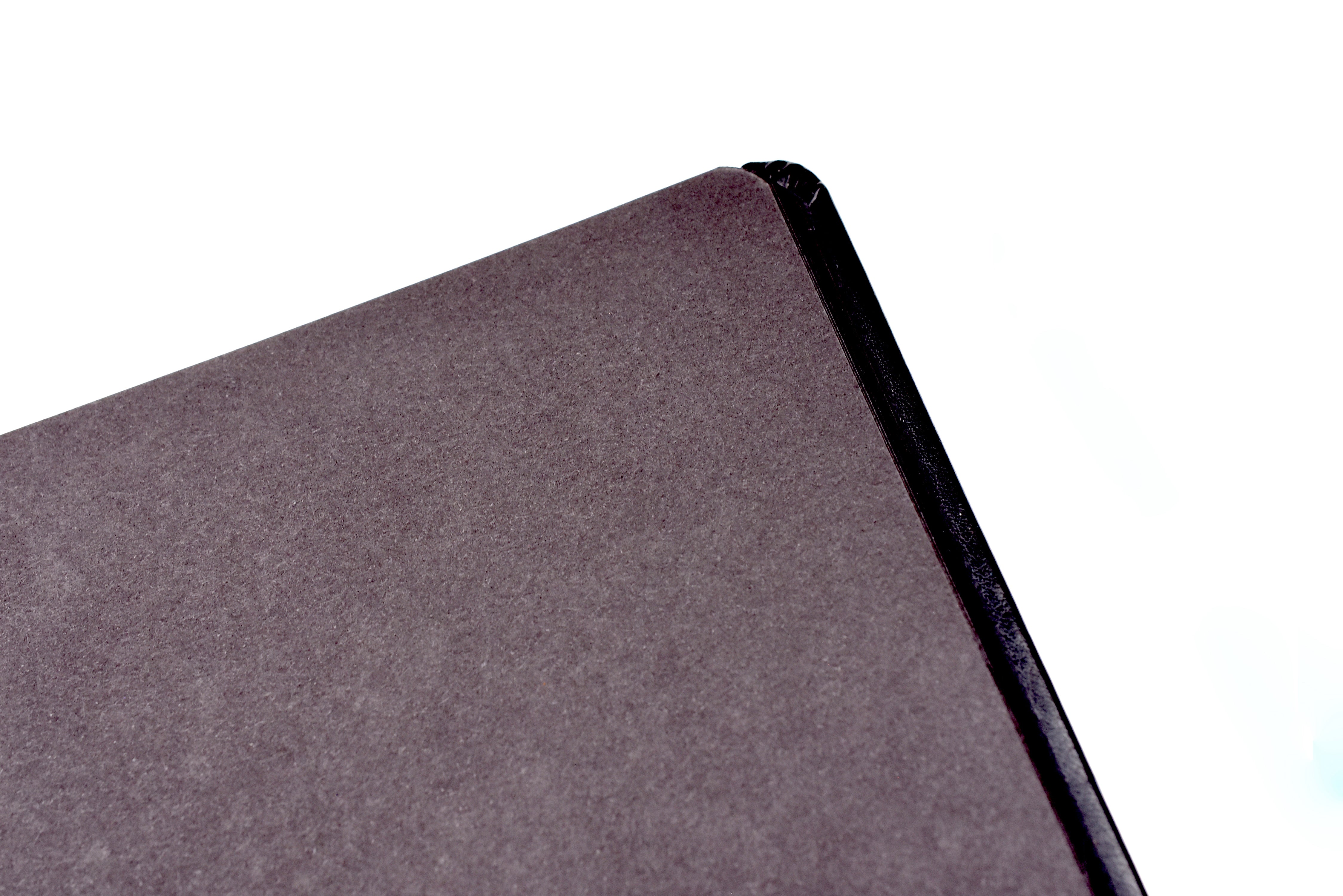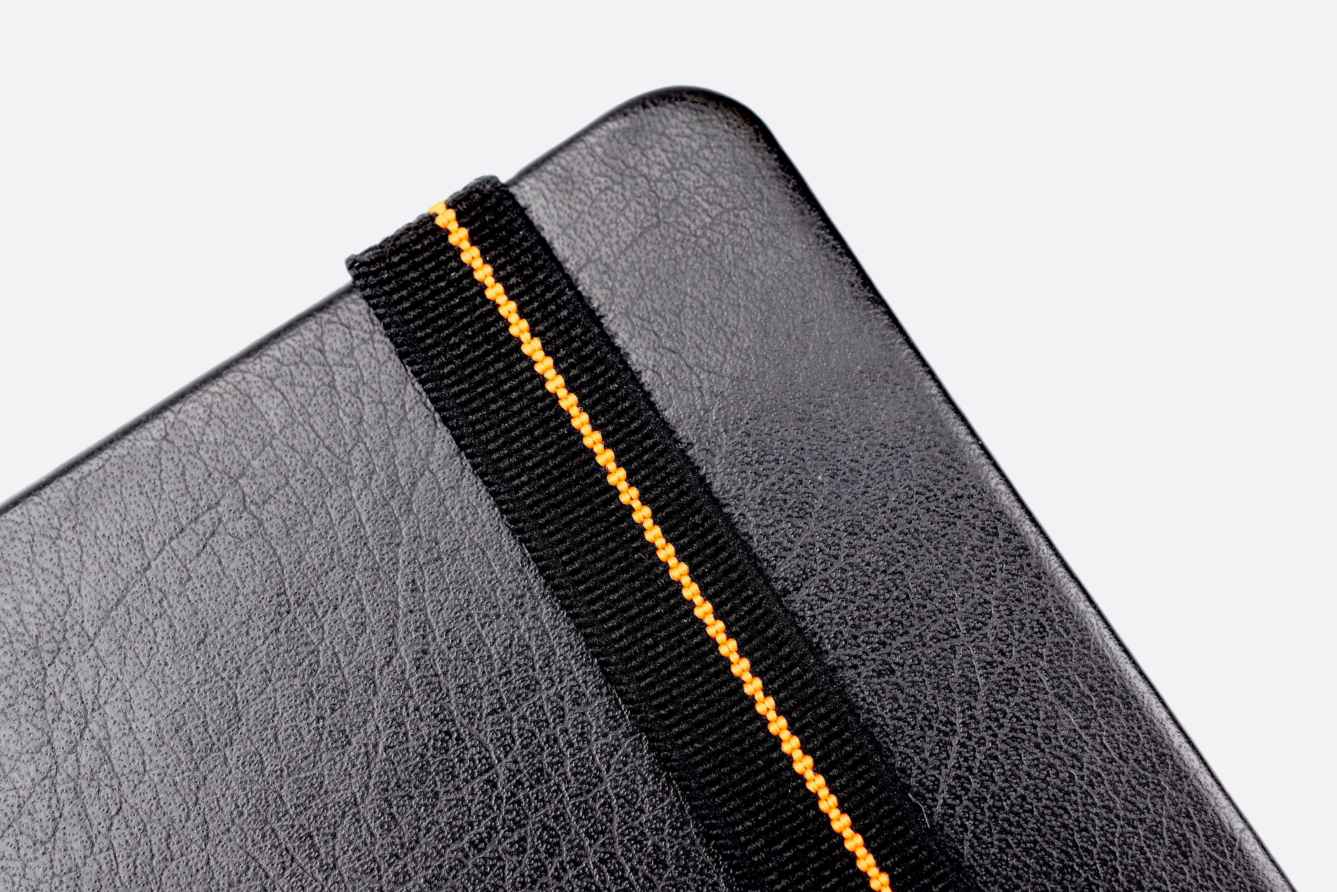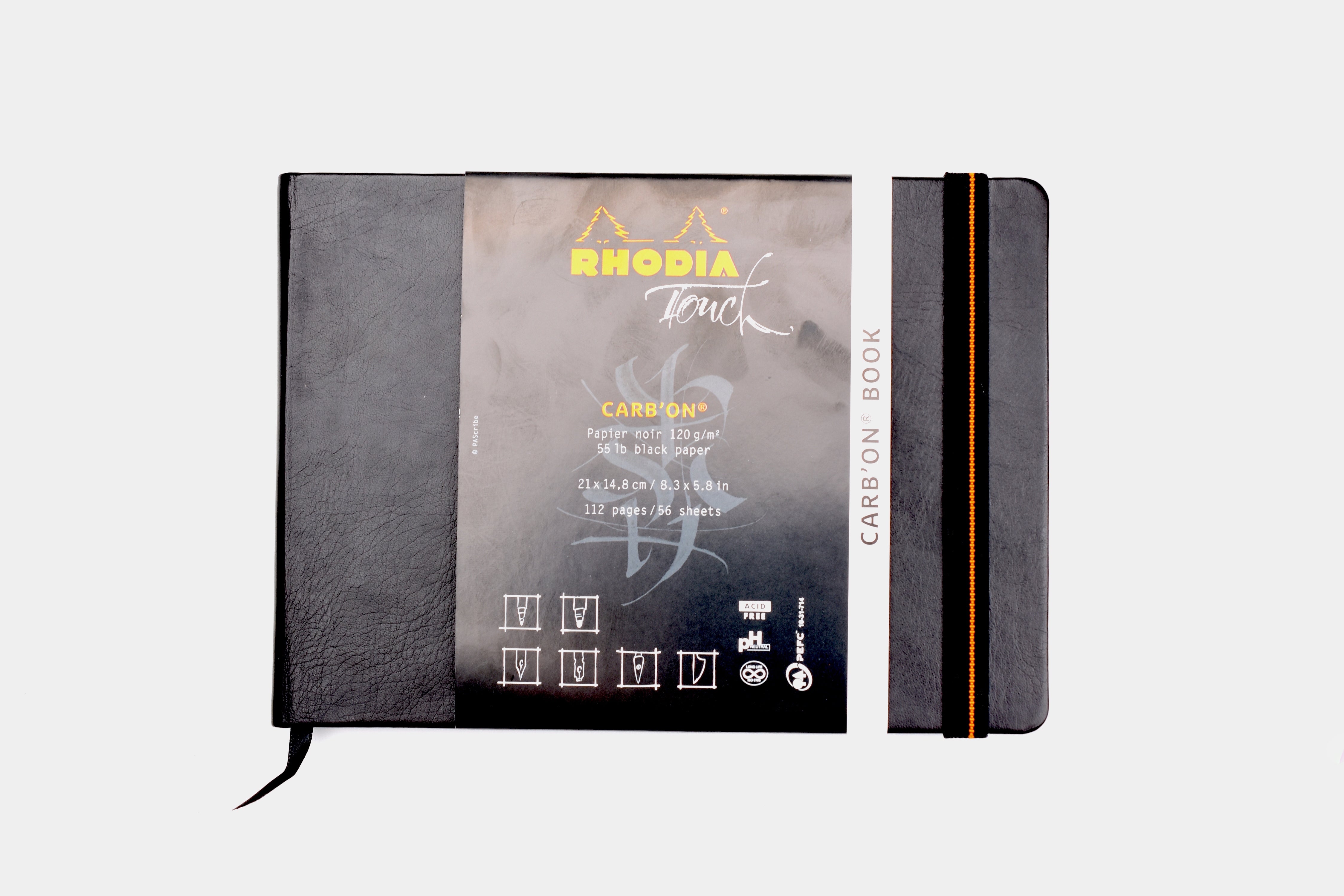 Rhodia Carb'ON Book - A5. Encased in an Italian leatherette hardbound cover with an elastic closure and ribbon marker, the deep-dyed Carb'ON paper provides a black surface that invites a unique writing or drawing experience. Its double-grain paper offers difference textures on each side of the sheets: a finely grained texture for detailed work, as well as a smooth finish great for dry drawing techniques. The black Carb'ON paper is acid-free, pH-neutral, and light-resistant.