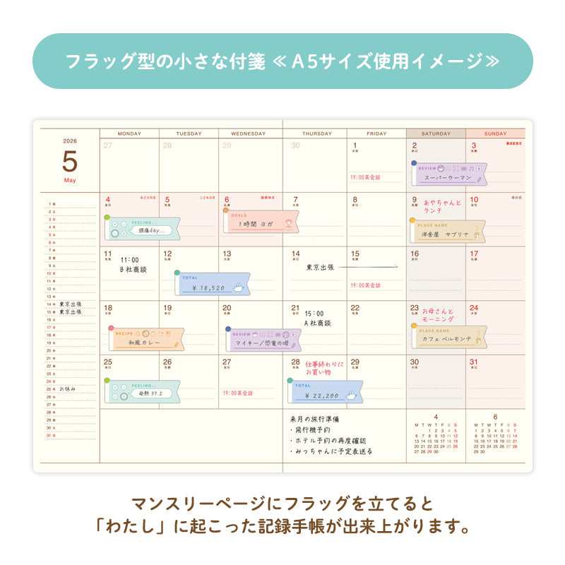 The flag-shaped notes are ideal for marking daily highlights on a monthly calendar or serving as handy page indexes. The square notes provide more space for text and can be paired with photos, tickets, or diary entries — perfect for adding to a life log. Each set also includes a convenient index tab that doubles as a bookmark.
