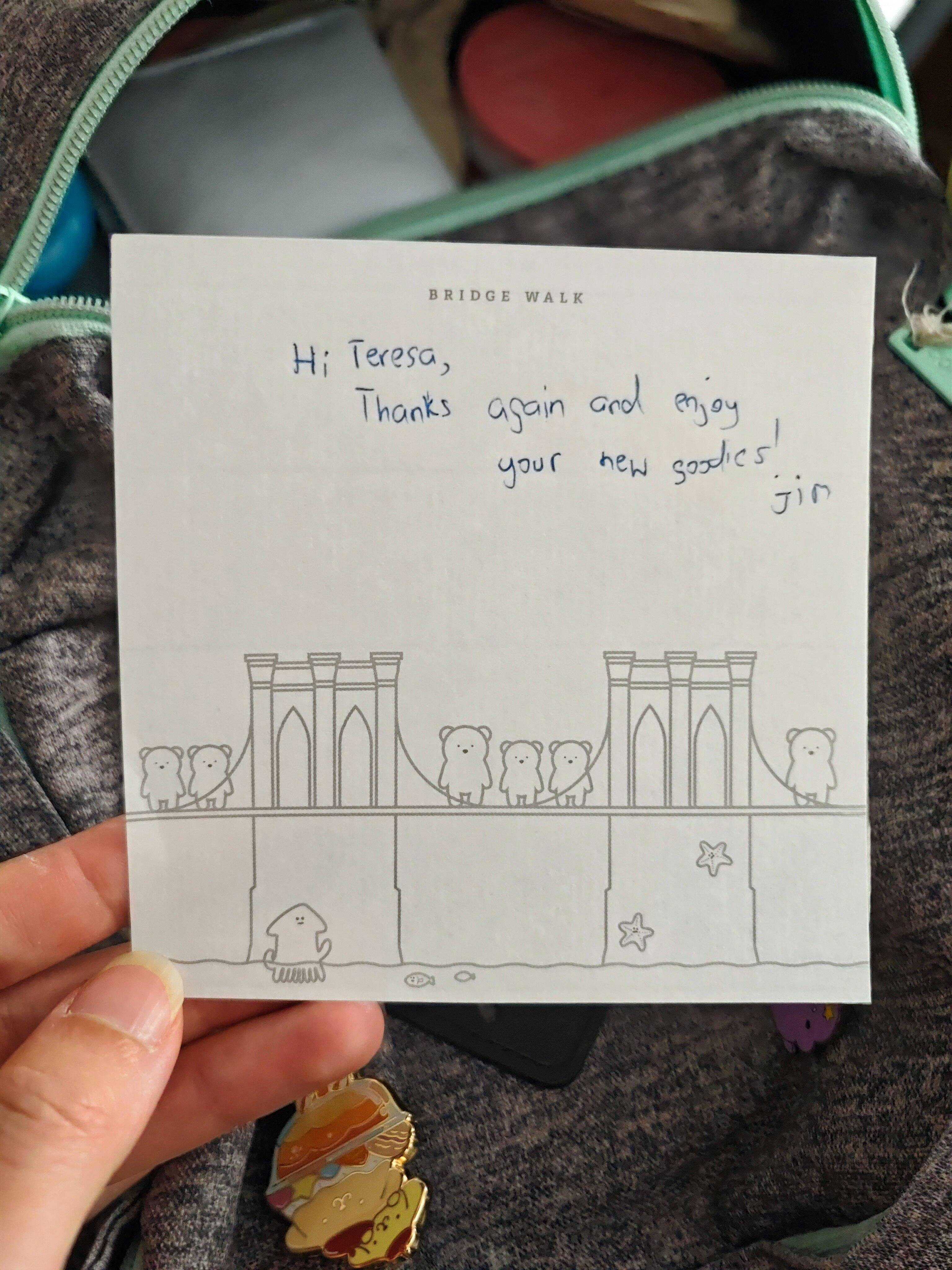 First, I would like to thank the staff who helped me find the tracking number so that I can be informed of the gift's delivery. Additionally, I would like to thank Jim who wrote this personalized note, because this was the most funny note that truly made the gift all the more special. Huge shout out to Jim.
