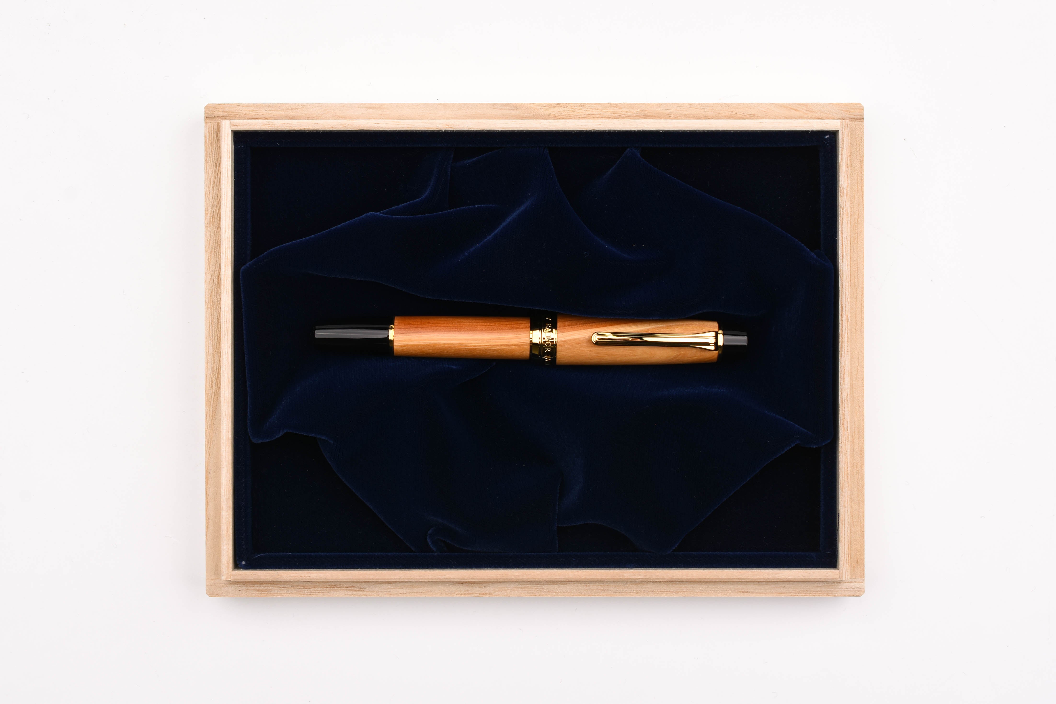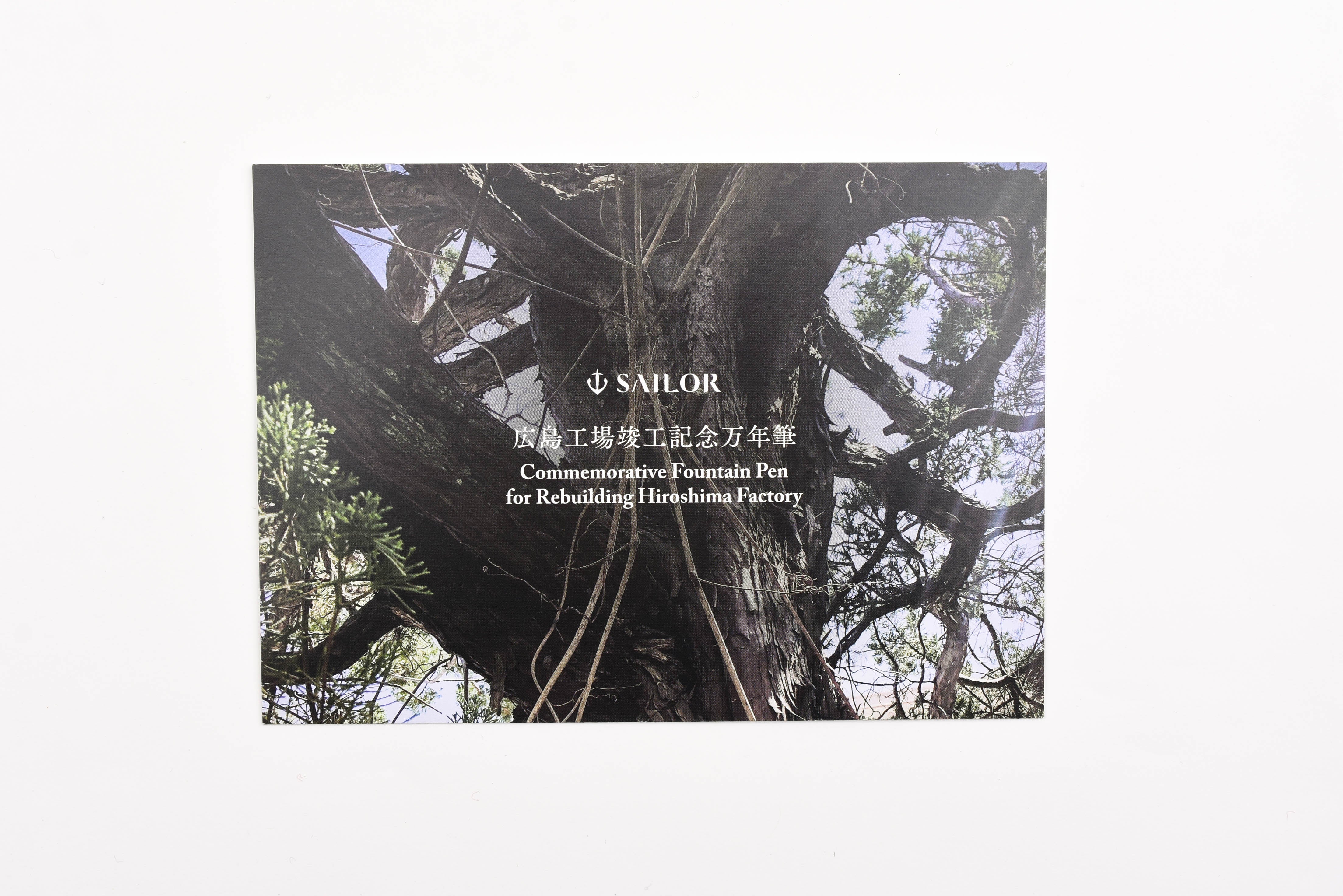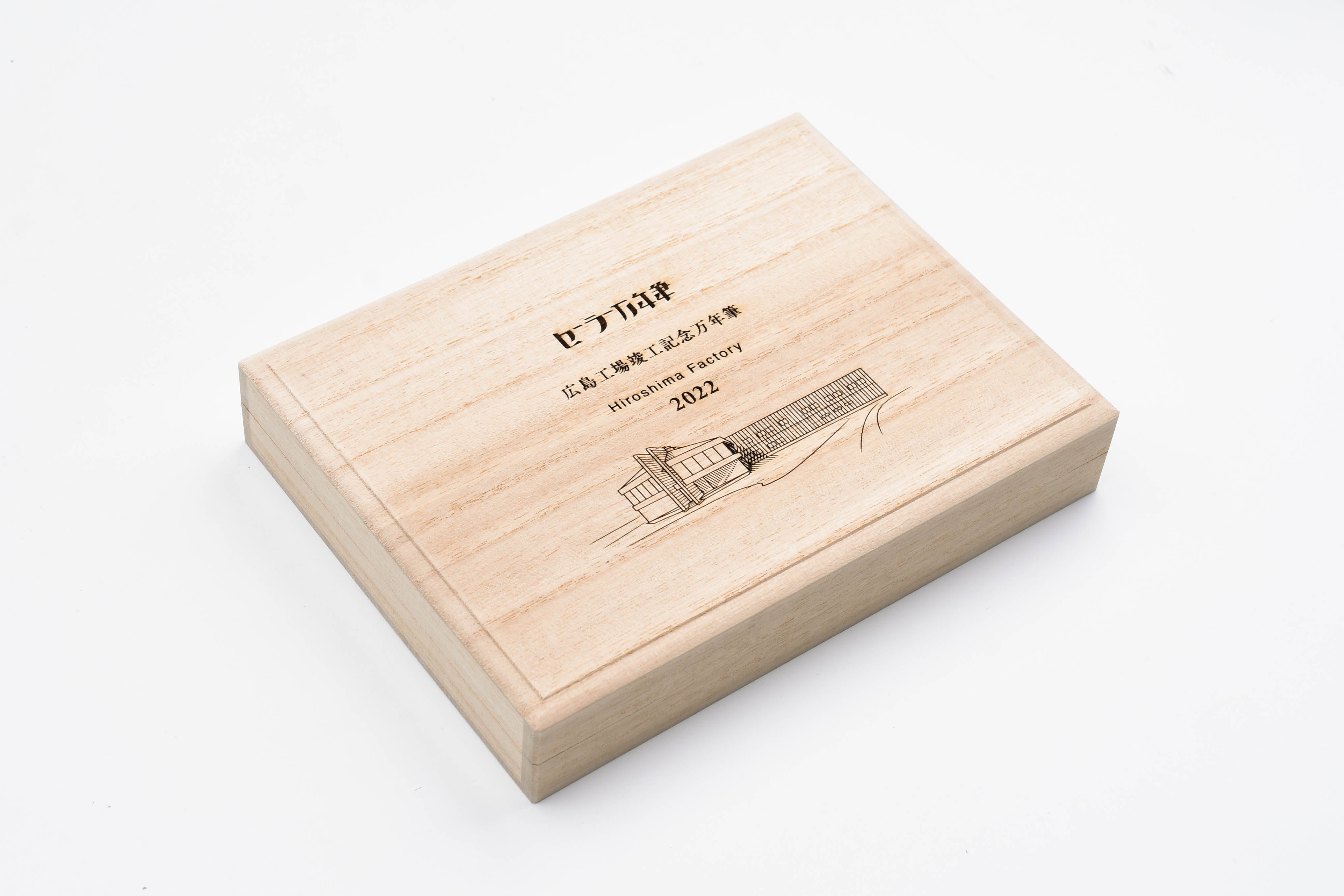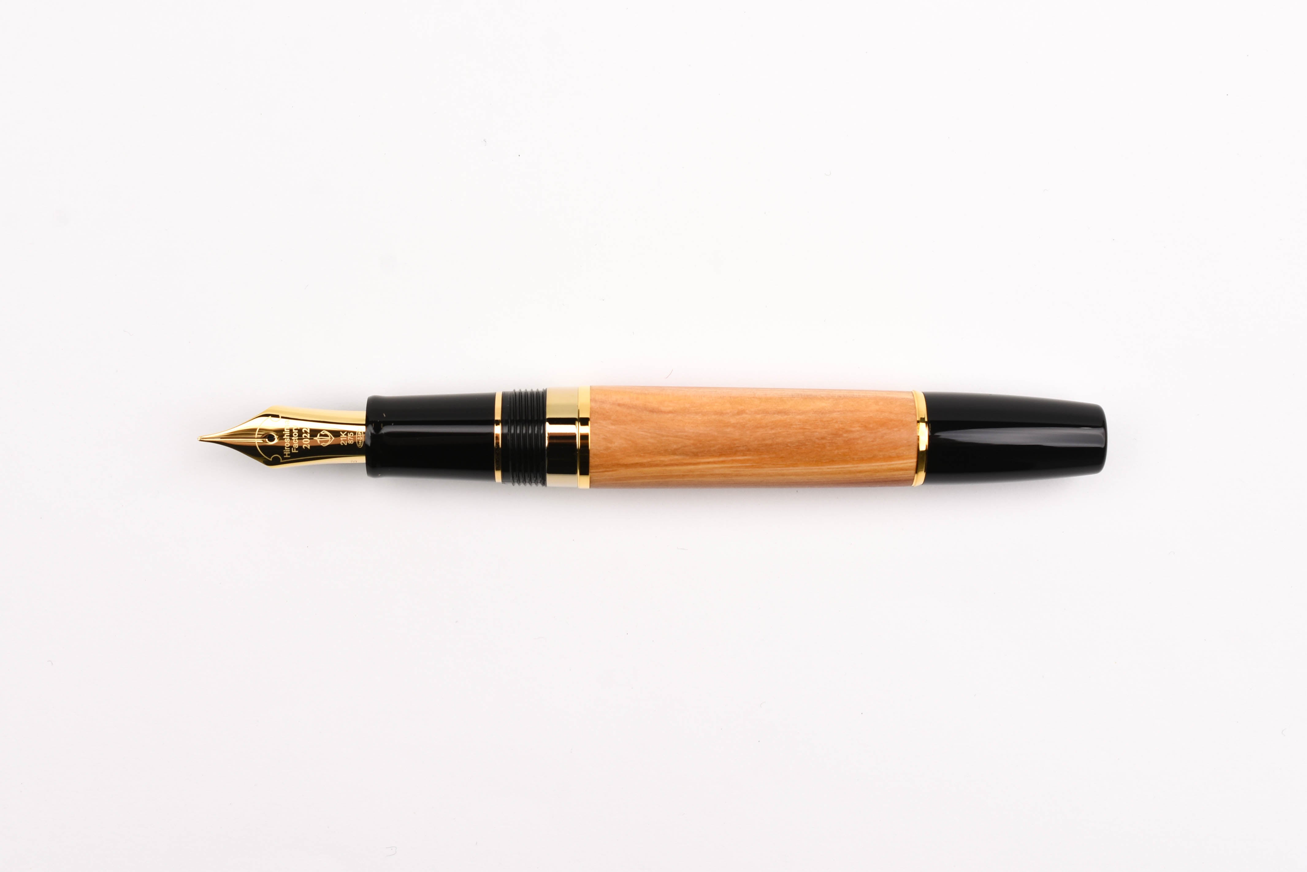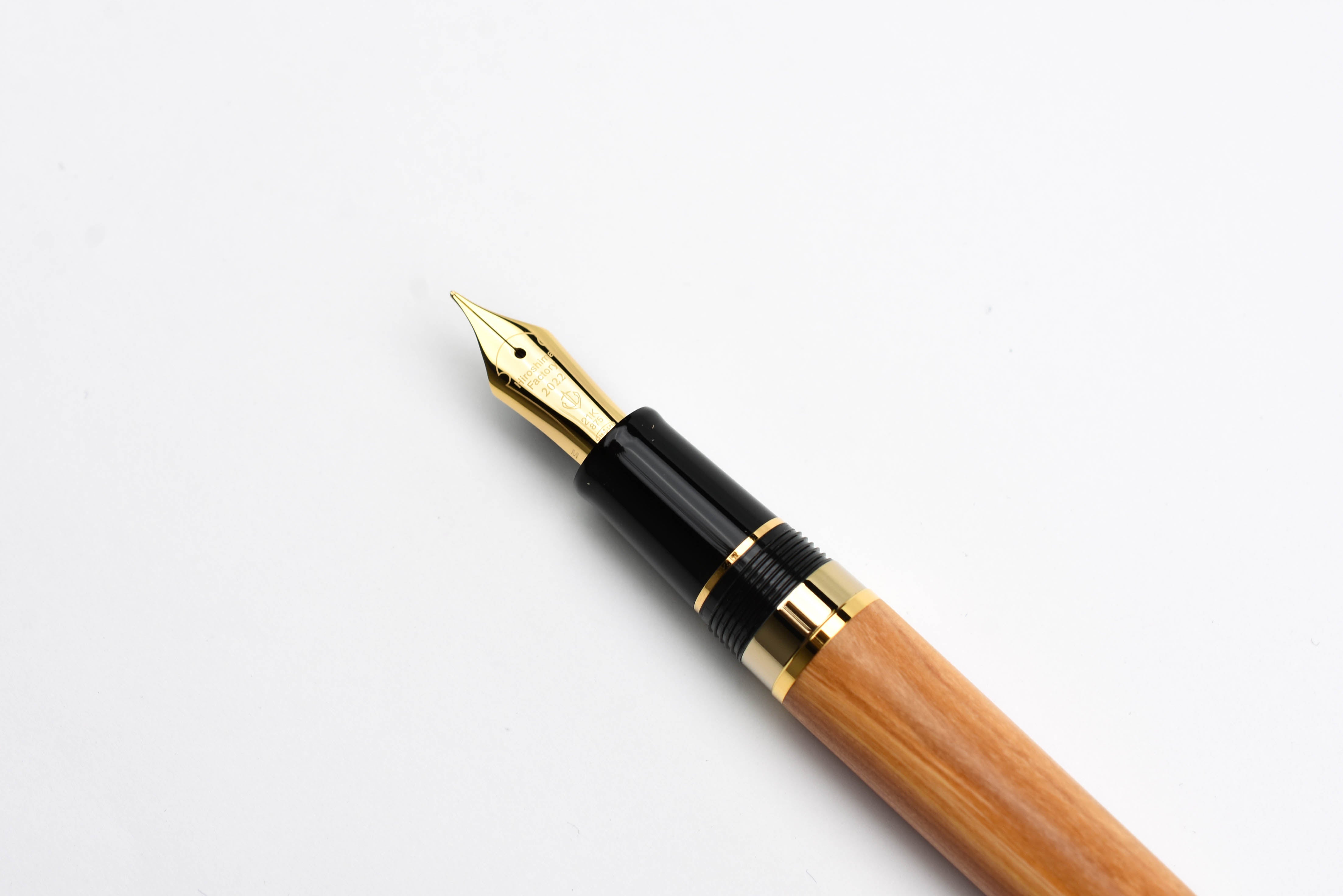 The Commemorative Fountain Pens for Rebuilding Hiroshima Factory are made from the repurposed Juniperus Chinensis trees. The barrel and cap boast unique color variations resulting from the natural wood grain patterns. The warm natural wood of the barrel and cap are juxtaposed with black finials and gold plated trim. "Hiroshima Factory 2022" is engraved into both the cap ring and the 21K gold nib. This Limited Edition pen features the serial number printed on the barrel end of the fountain pen.