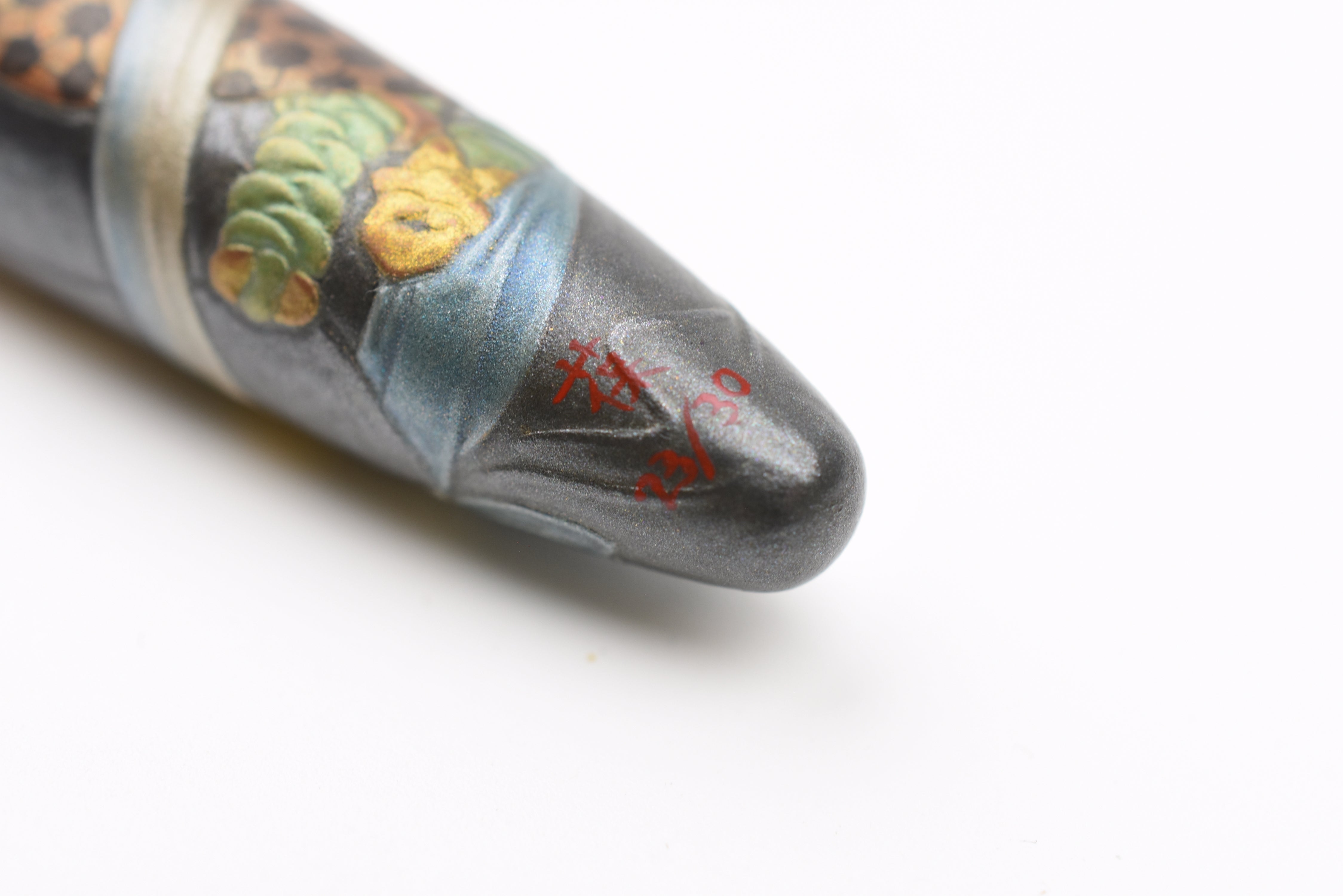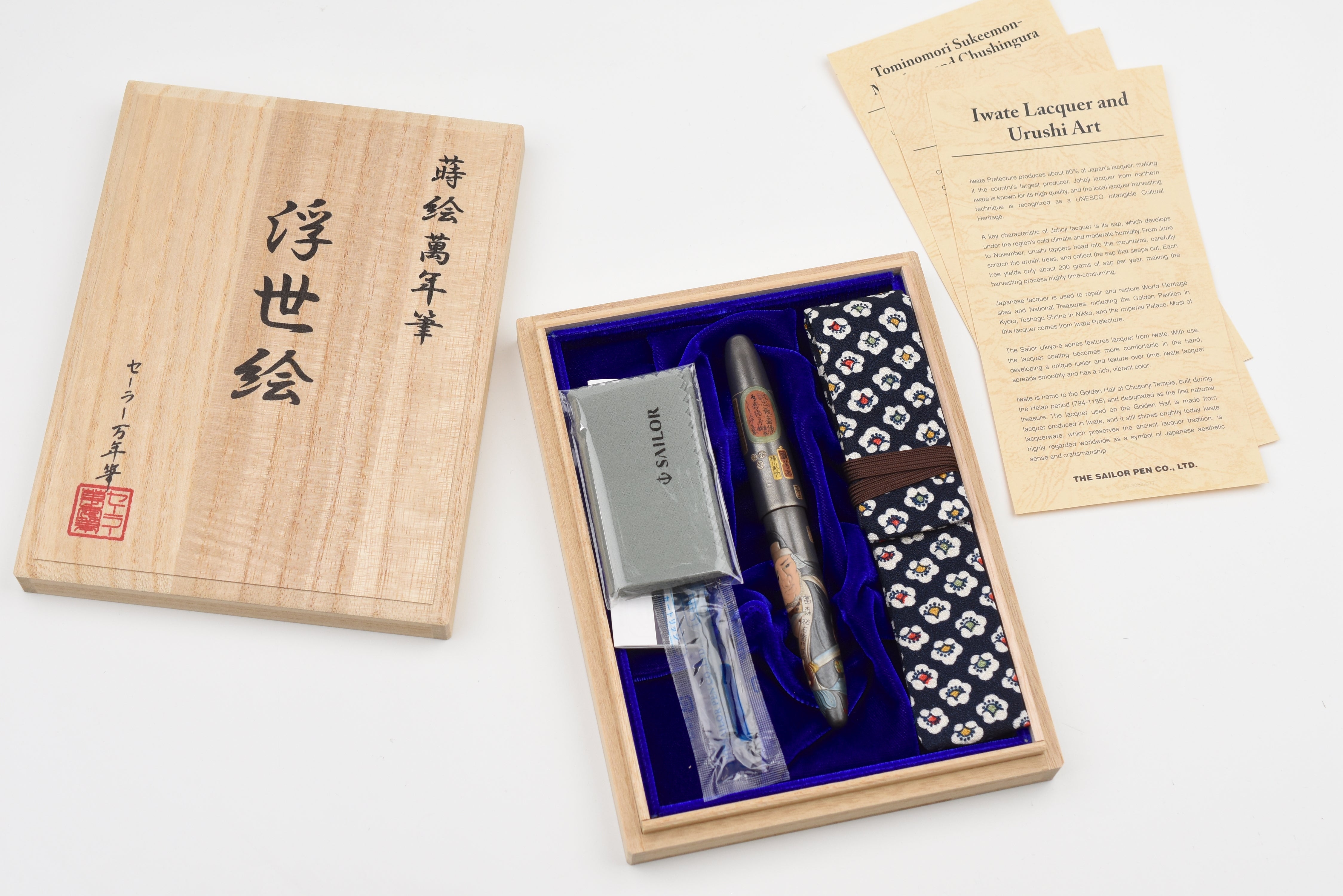 Crafted with exquisite maki-e artistry on an ebonite barrel, this ultra-limited edition—only 30 pieces available worldwide—is paired with a prestigious Sailor King of Pen 21K solid gold bicolor nib, ensuring a smooth and unparalleled writing experience. The texture of the raised maki-e can be felt in the hand, allowing you to experience the artist's expertise up close. Each pen is presented in an elegant Paulownia wooden box, including a fabric pen case, cleaning cloth, converter, cartridges, and informational leaflets for the pen.