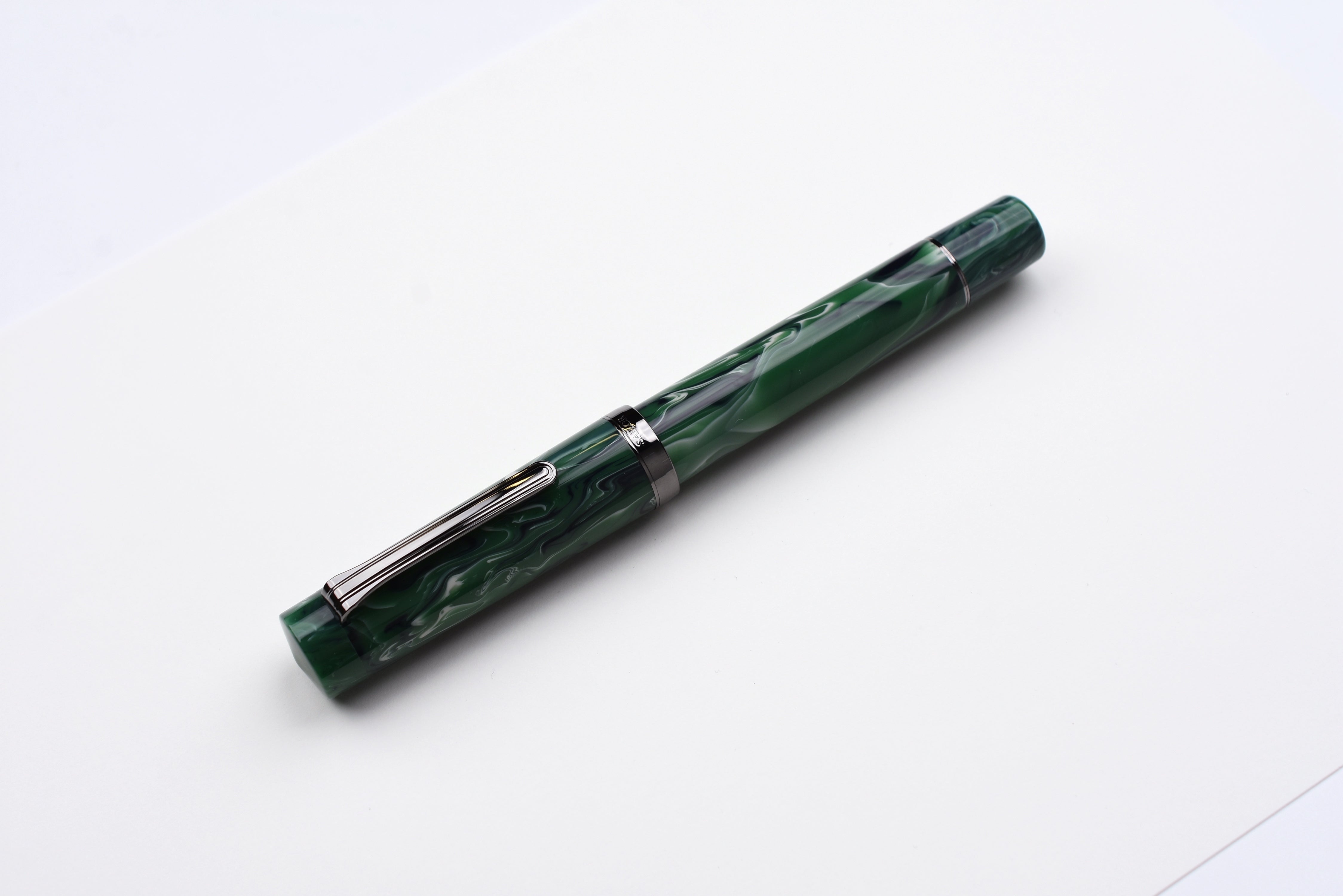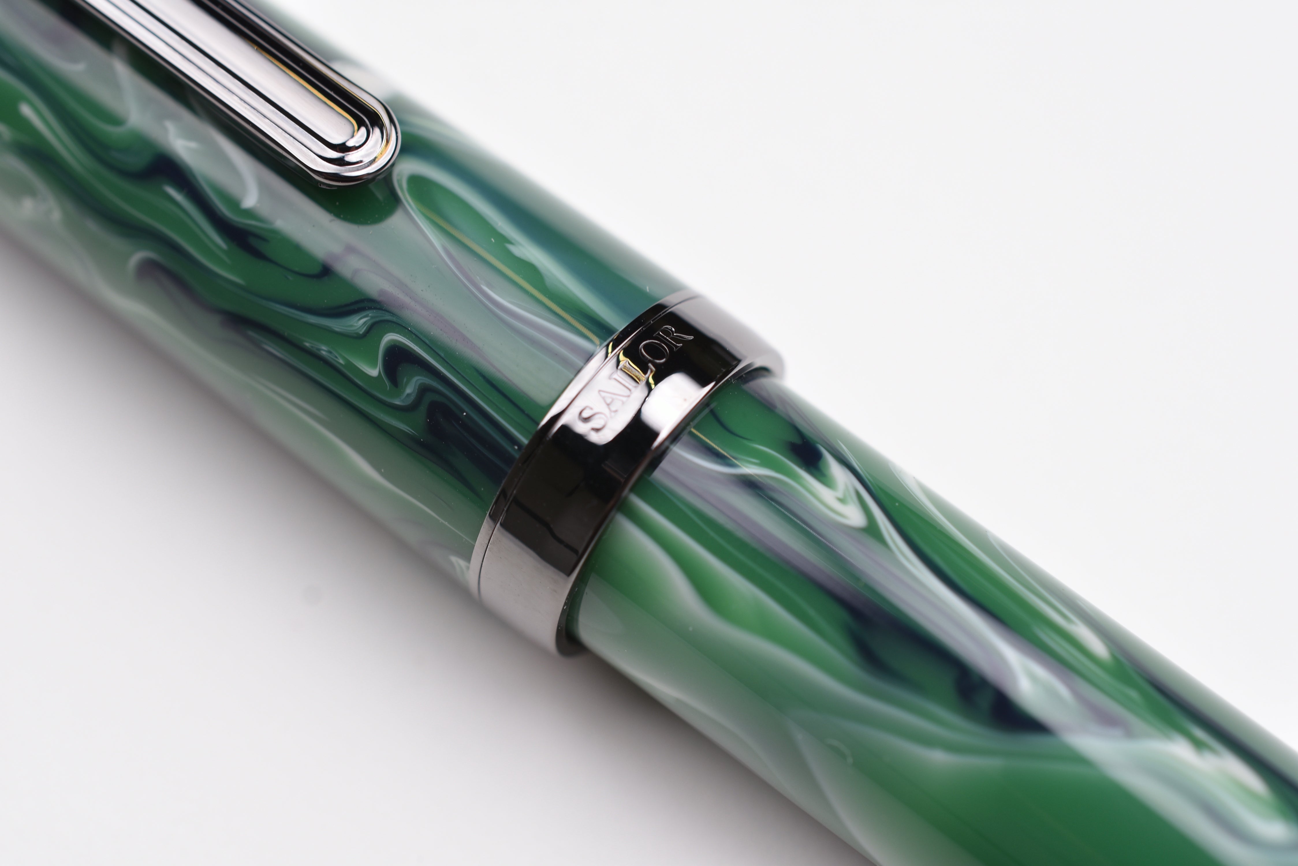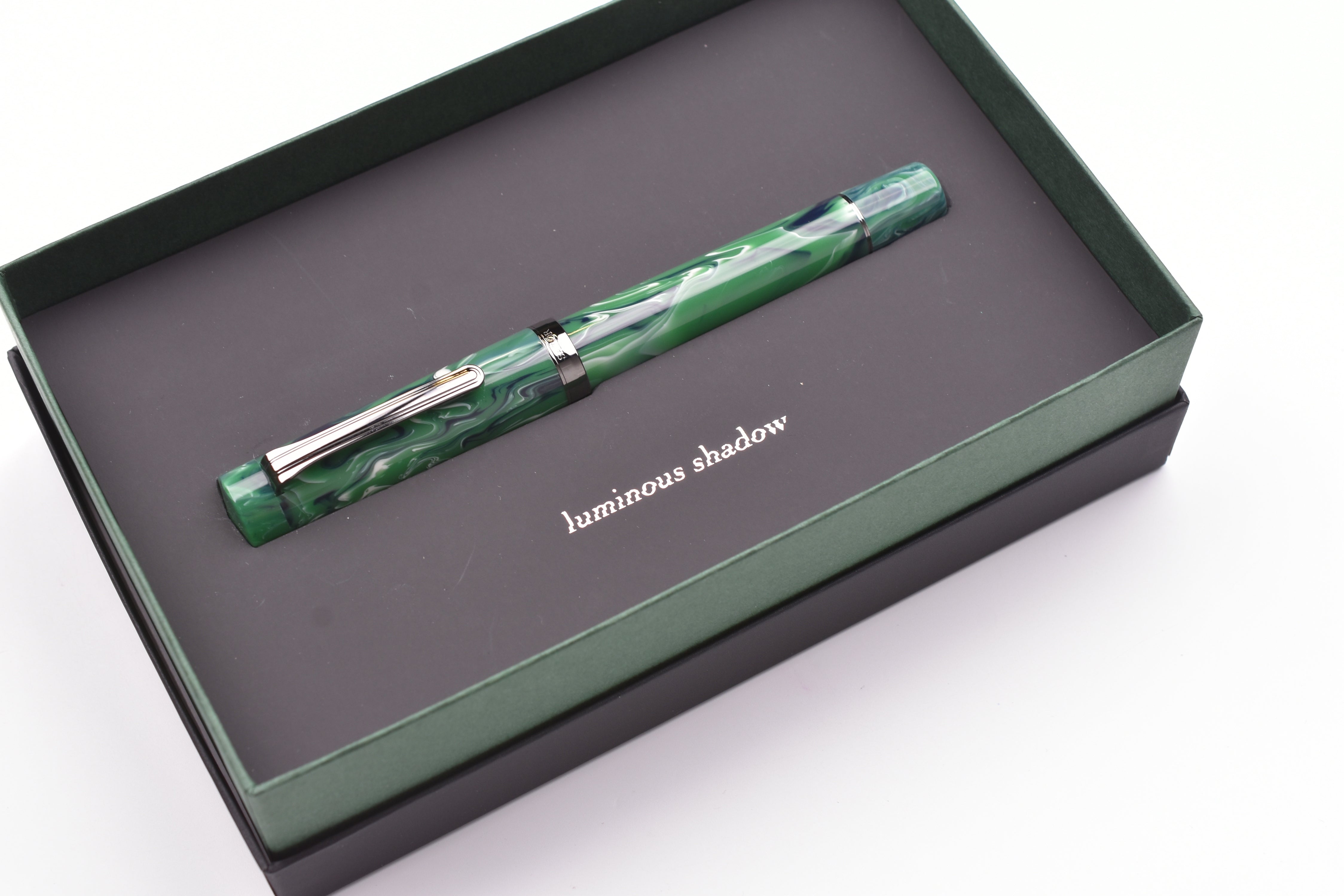 Sailor Luminous Shadow King of Pen Fountain Pen – Grove Green – Limited Edition evokes a dark forest glade shaded by trees with its deep greens and black-ion-plated accents.