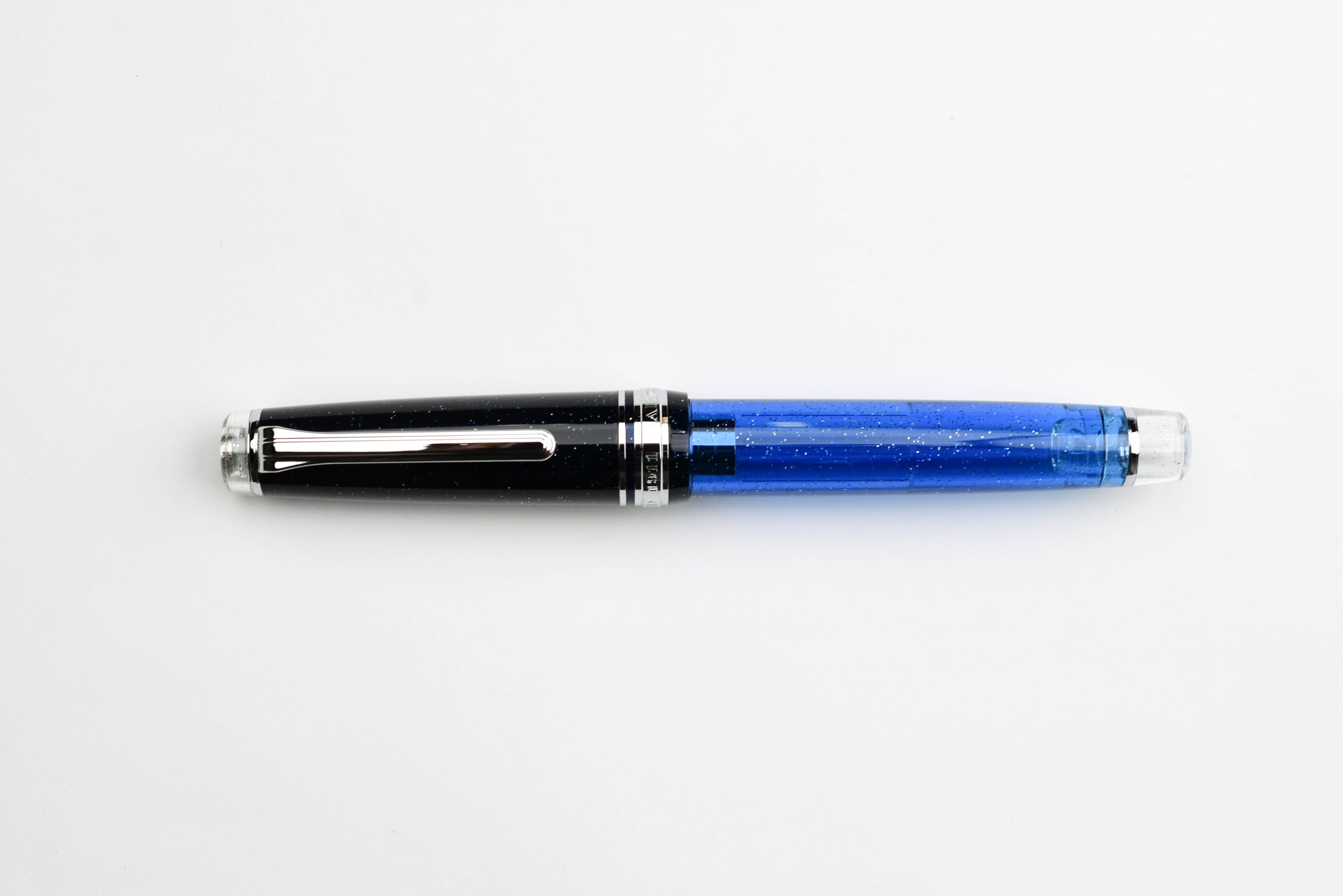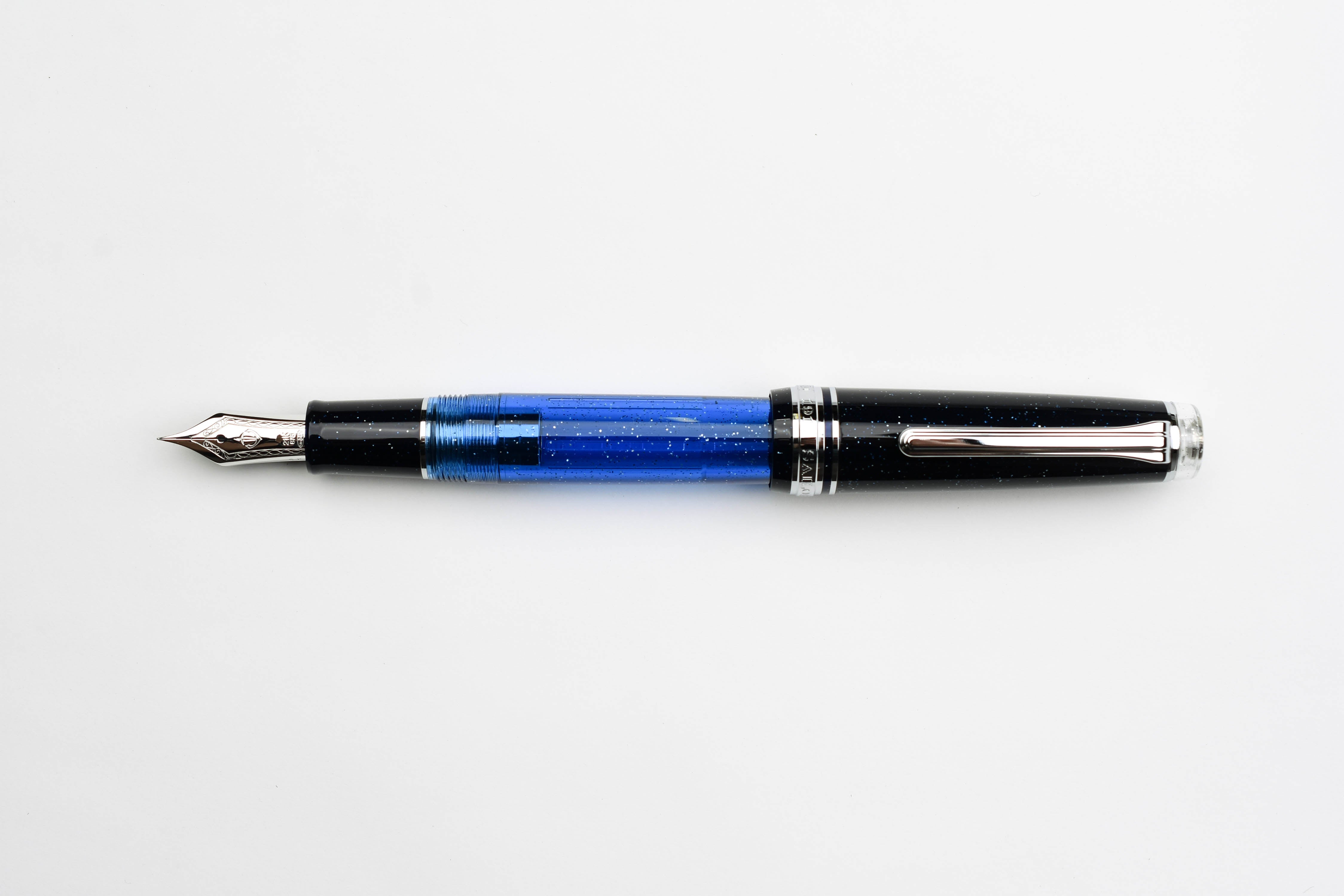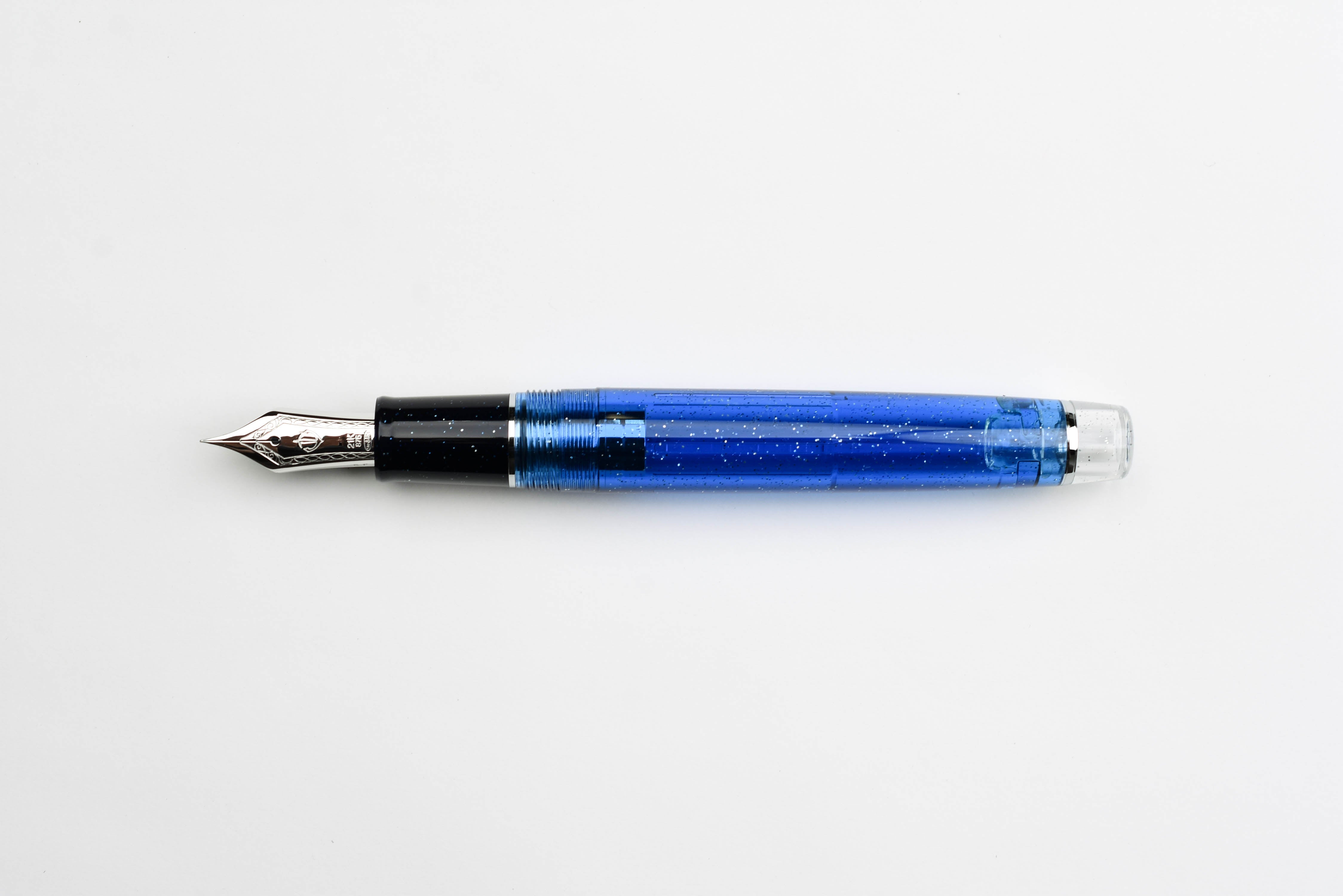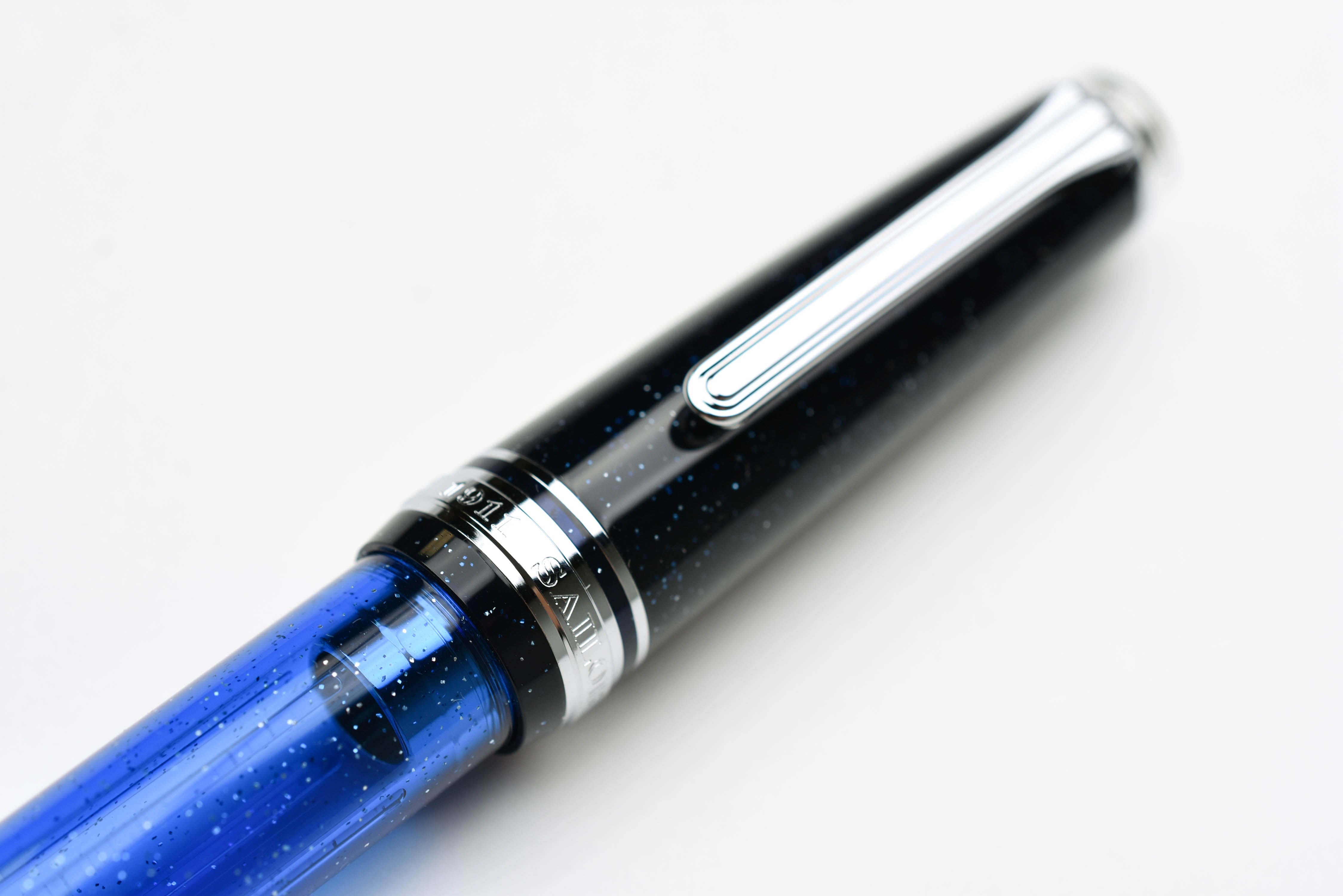 Sailor Pro Gear - Iris Nebula. A new addition to the Sailor Galaxy Series, this pen is named after the Iris Nebula in the Cepheus constellation. Iris Nebula is a cold interstellar cloud of dust and gas that reflects light from nearby stars and looks like a flower blooming in space. The Sailor Pro Gear Iris Nebular takes inspiration from the beautiful clouds of dust and gas that gravitationally converge to form a nebula during the birth of a star. The pen features a semi-translucent blue barrel with a semi-translucent smoky black cap, with silver glitter throughout the body that is reminiscent of the celestial dust within the Iris Nebula.