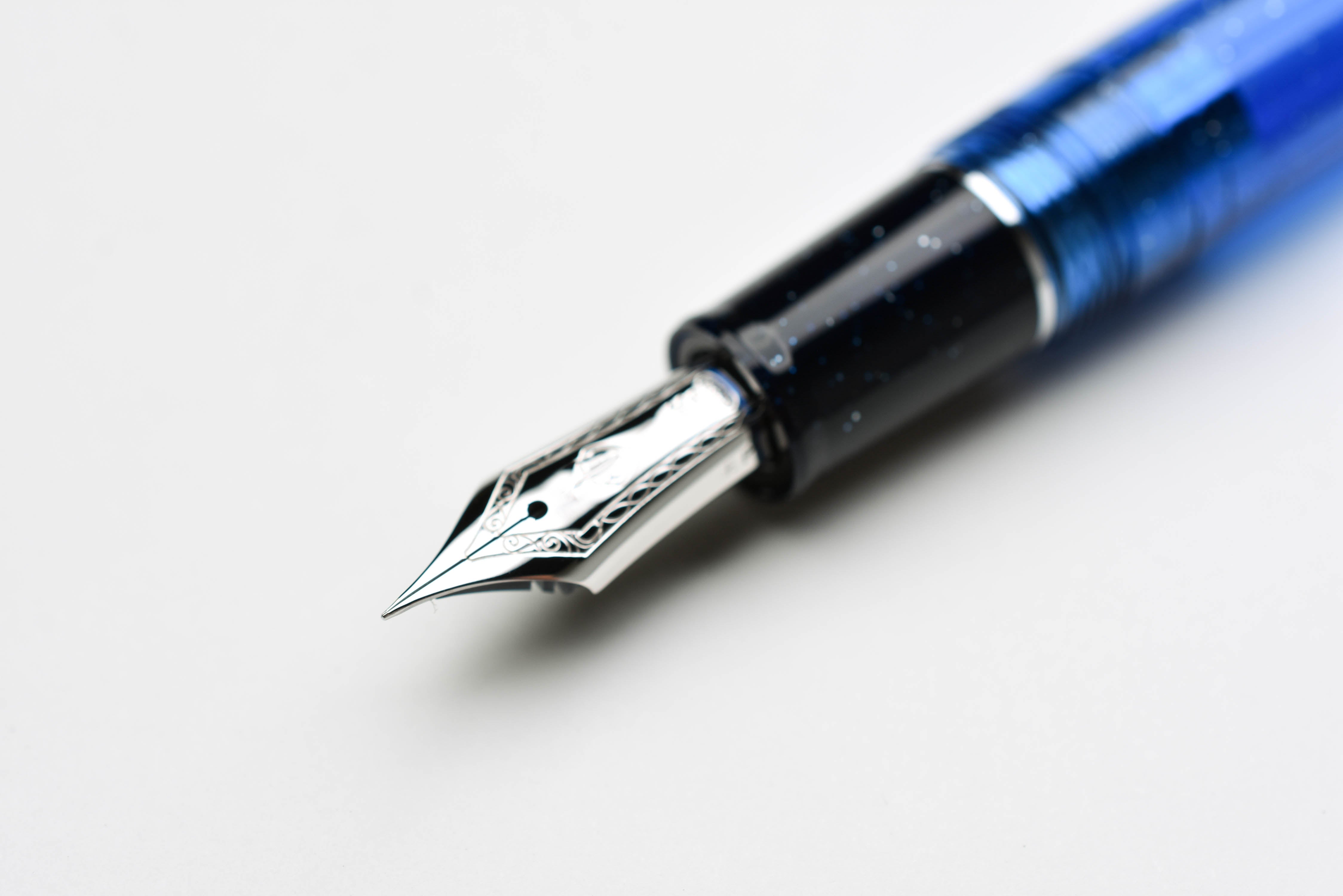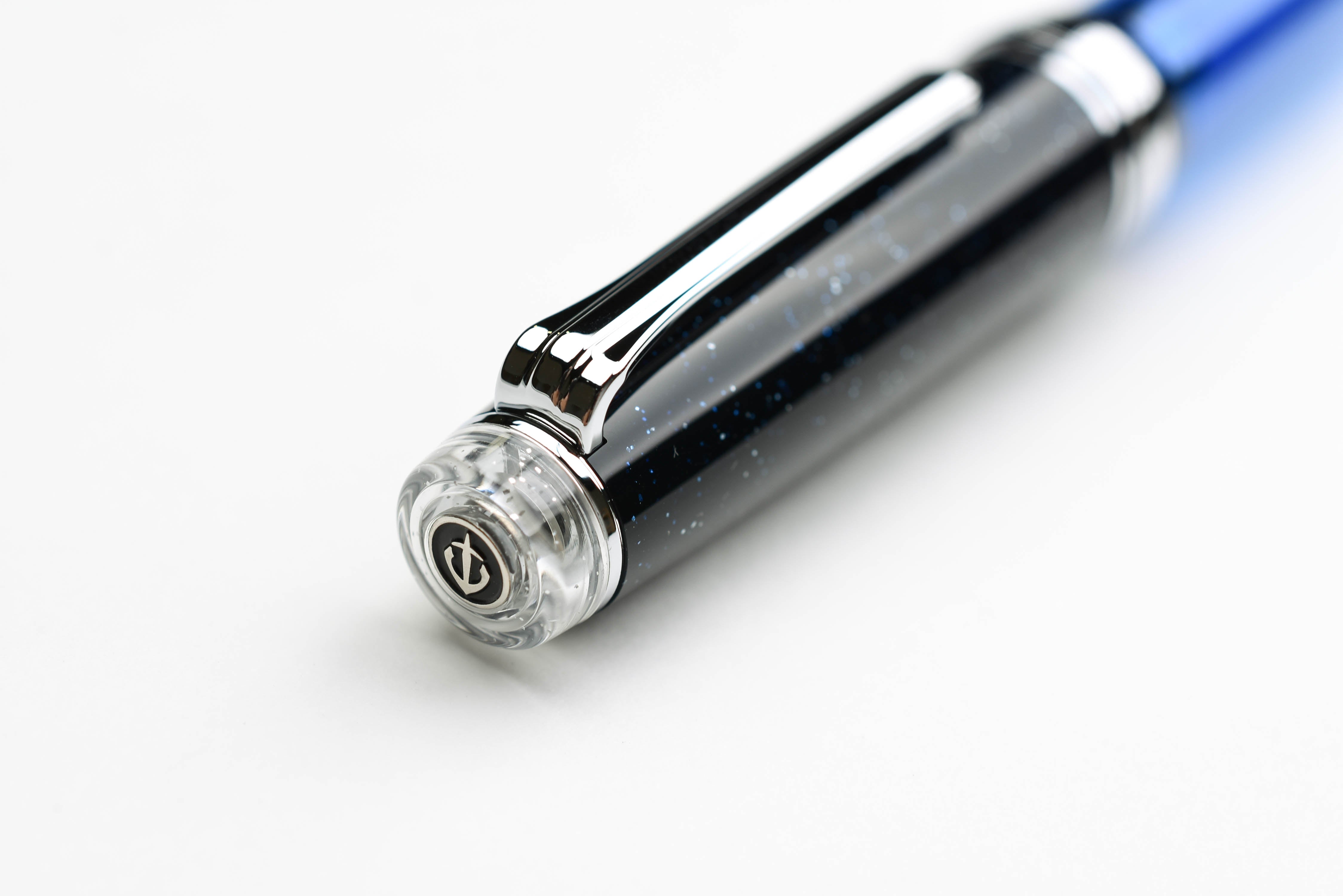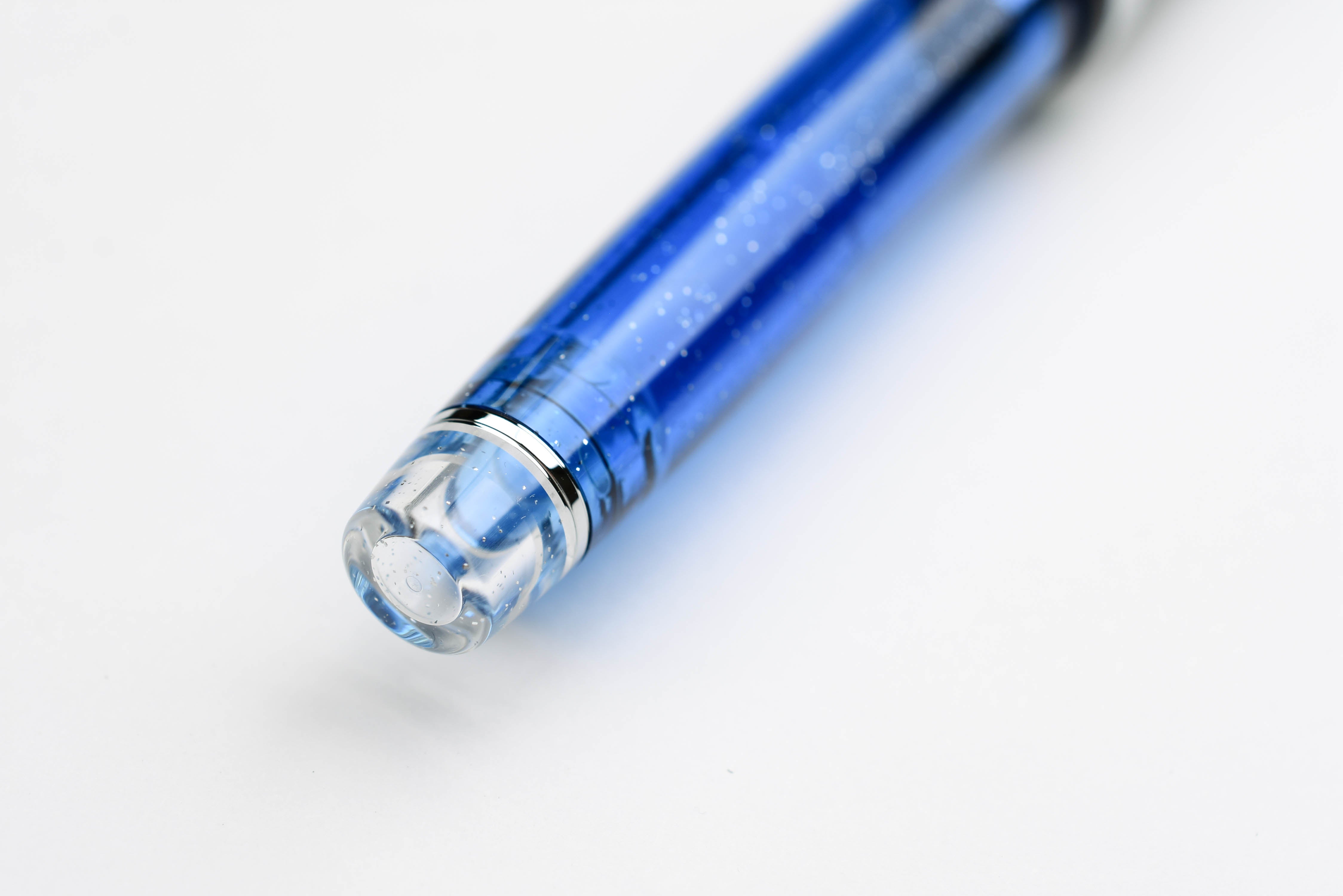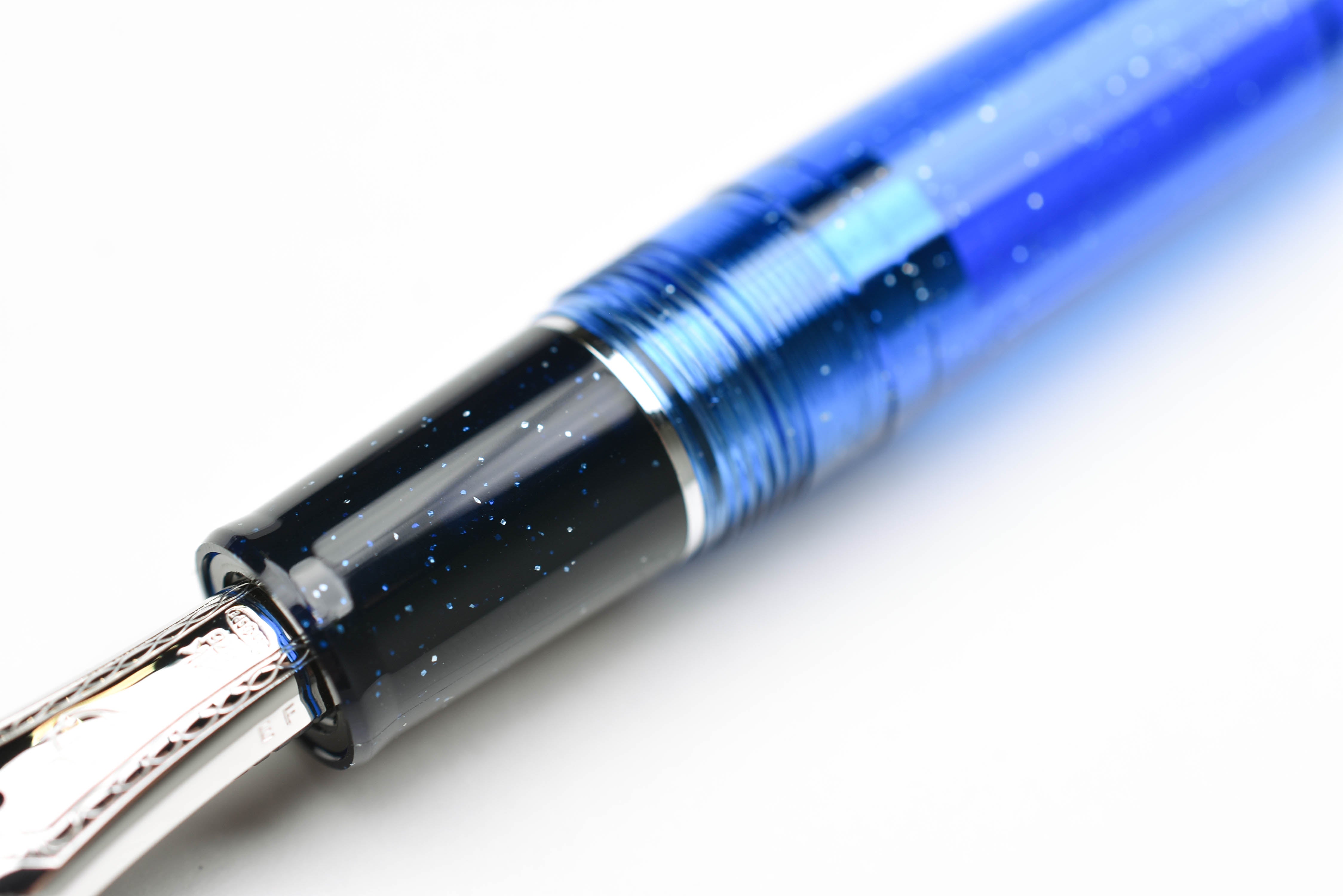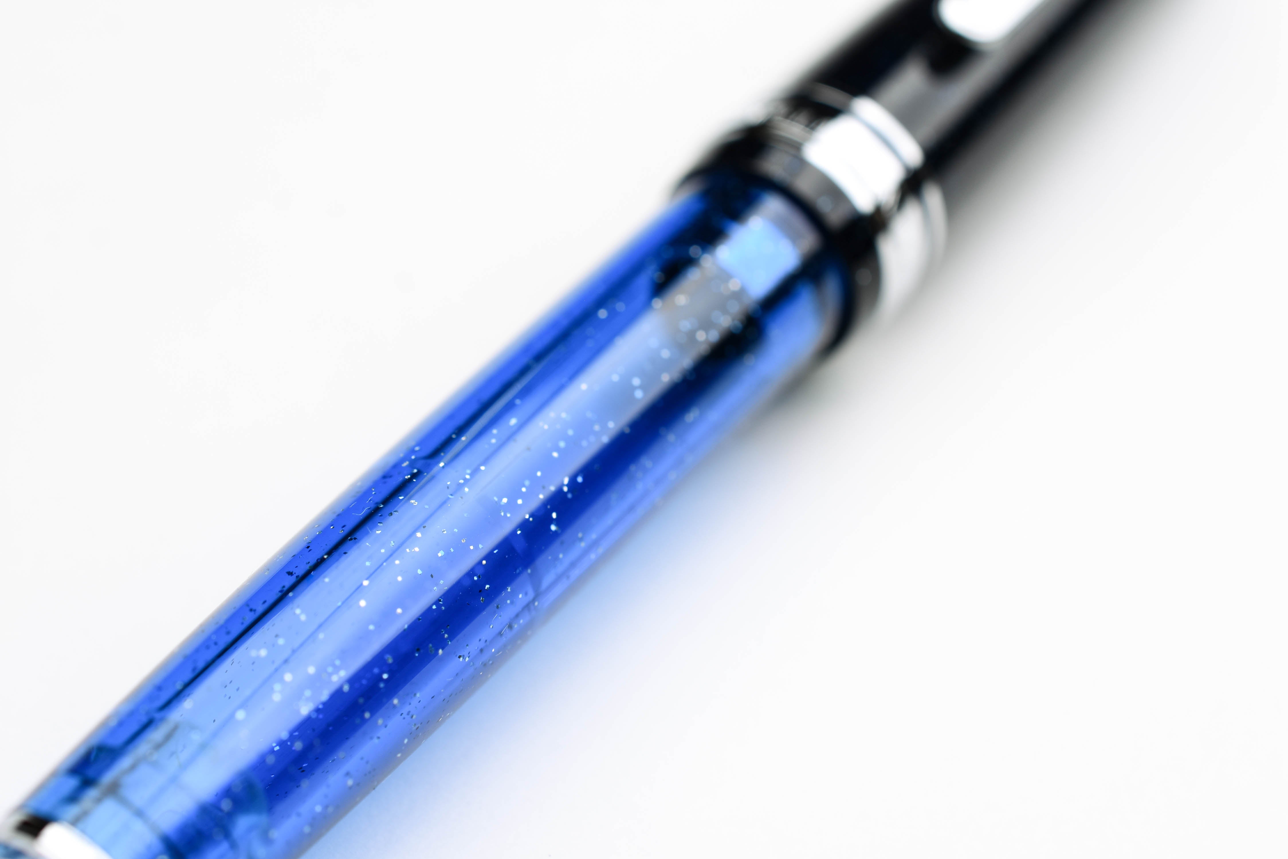 Sailor Pro Gear - Iris Nebula. A new addition to the Sailor Galaxy Series, this pen is named after the Iris Nebula in the Cepheus constellation. Iris Nebula is a cold interstellar cloud of dust and gas that reflects light from nearby stars and looks like a flower blooming in space. The Sailor Pro Gear Iris Nebular takes inspiration from the beautiful clouds of dust and gas that gravitationally converge to form a nebula during the birth of a star. The pen features a semi-translucent blue barrel with a semi-translucent smoky black cap, with silver glitter throughout the body that is reminiscent of the celestial dust within the Iris Nebula.