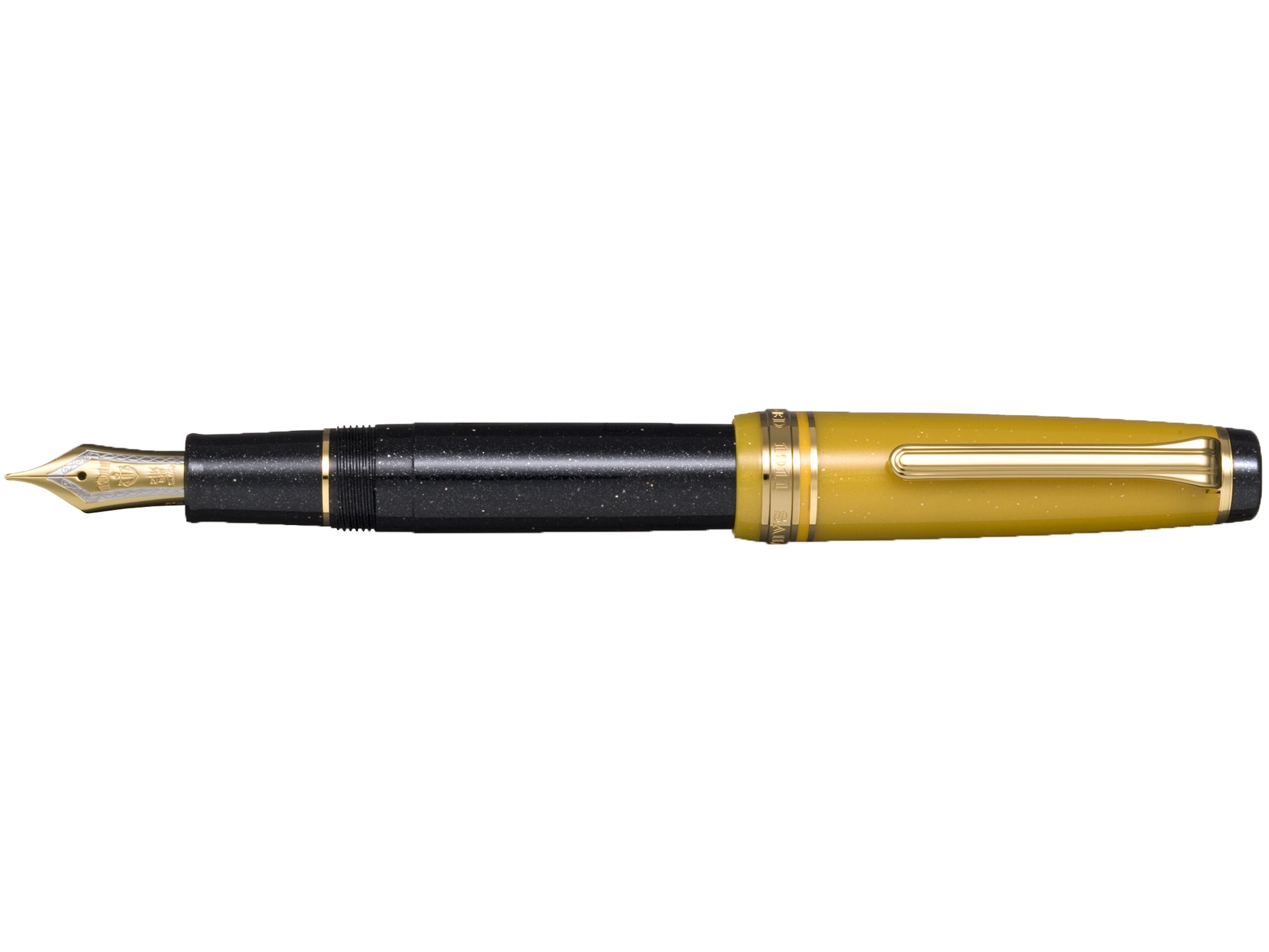 Sailor Pro Gear Fountain Pen - Stellar Black Hole. The new Sailor Stellar Black Hole is inspired by and named after a phenomenon that creates widespread wonder and fascination: the Black Hole. The body and finial are space black with various speckles like an explosion of extraterrestrial dust, while the cap is a warm golden yellow with golden glitter like stars spread across the surface. Stellar Black Hole by Sailor is a Pro Gear Standard size that features golden accents and a bicolor 21K gold nib that offers an effortlessly smooth writing experience.