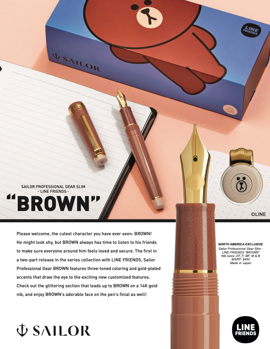 Sailor Pro Gear Slim - LINE FRIENDS - BROWN. Please welcome, the cutest character you have ever seen: BROWN! He might look shy, but BROWN always has time to listen to his friends to make sure everyone around him feels loved and secure. Sailor Professional Gear BROWN features three-toned coloring and gold-plated accents that draw the eye to the exciting new customized features. Check out the glittering section that leads up to BROWN on a 14K gold nib, and enjoy BROWN's adorable face on the pen's finial as well!
