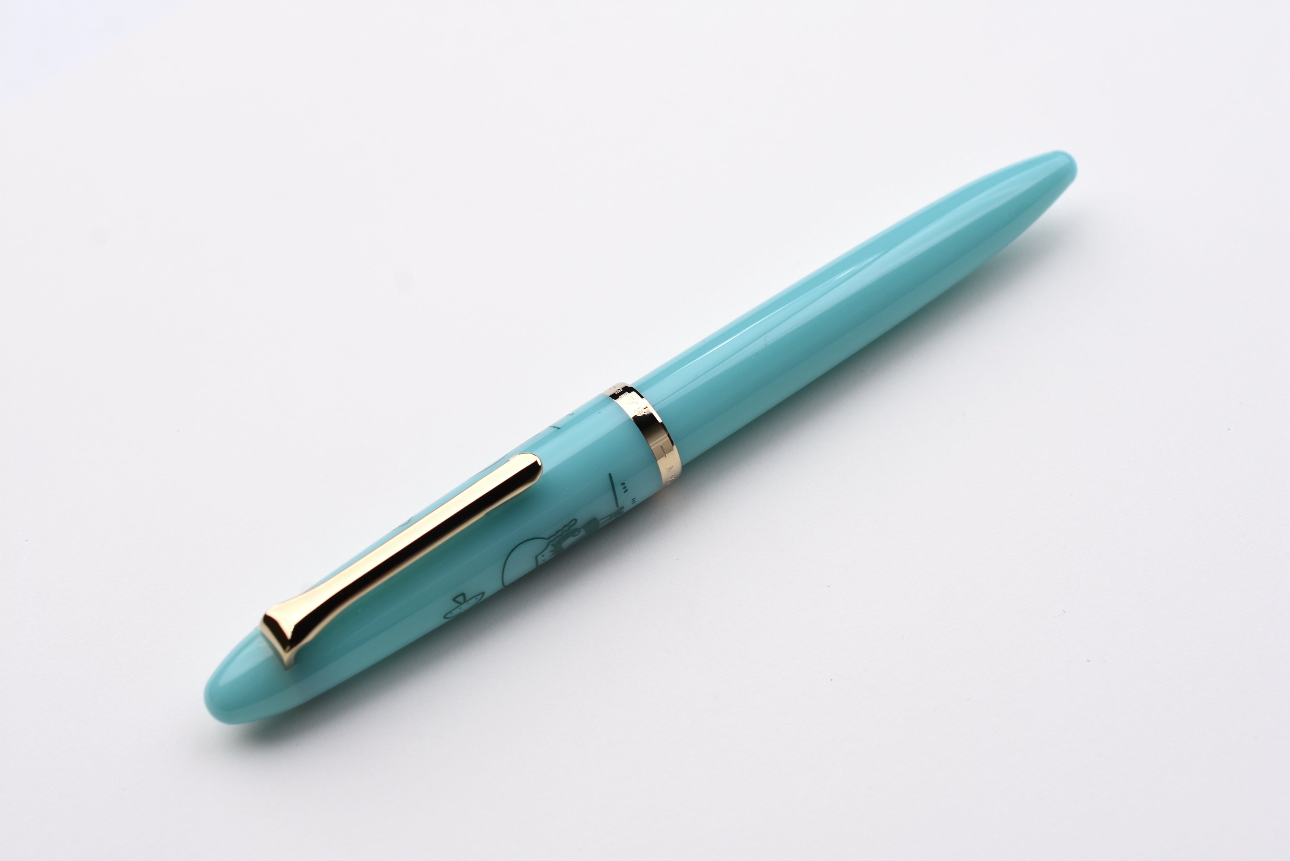 This limited-edition version of Sailor's Profit Junior fountain pen is a collaboration with the popular illustrator mizutama. It comes in three different colors, each with a different illustration printed on the cap, with a matching ink and converter in the box. This version is a bright sky blue and the illustration features a girl with a book and a bird flying overhead.