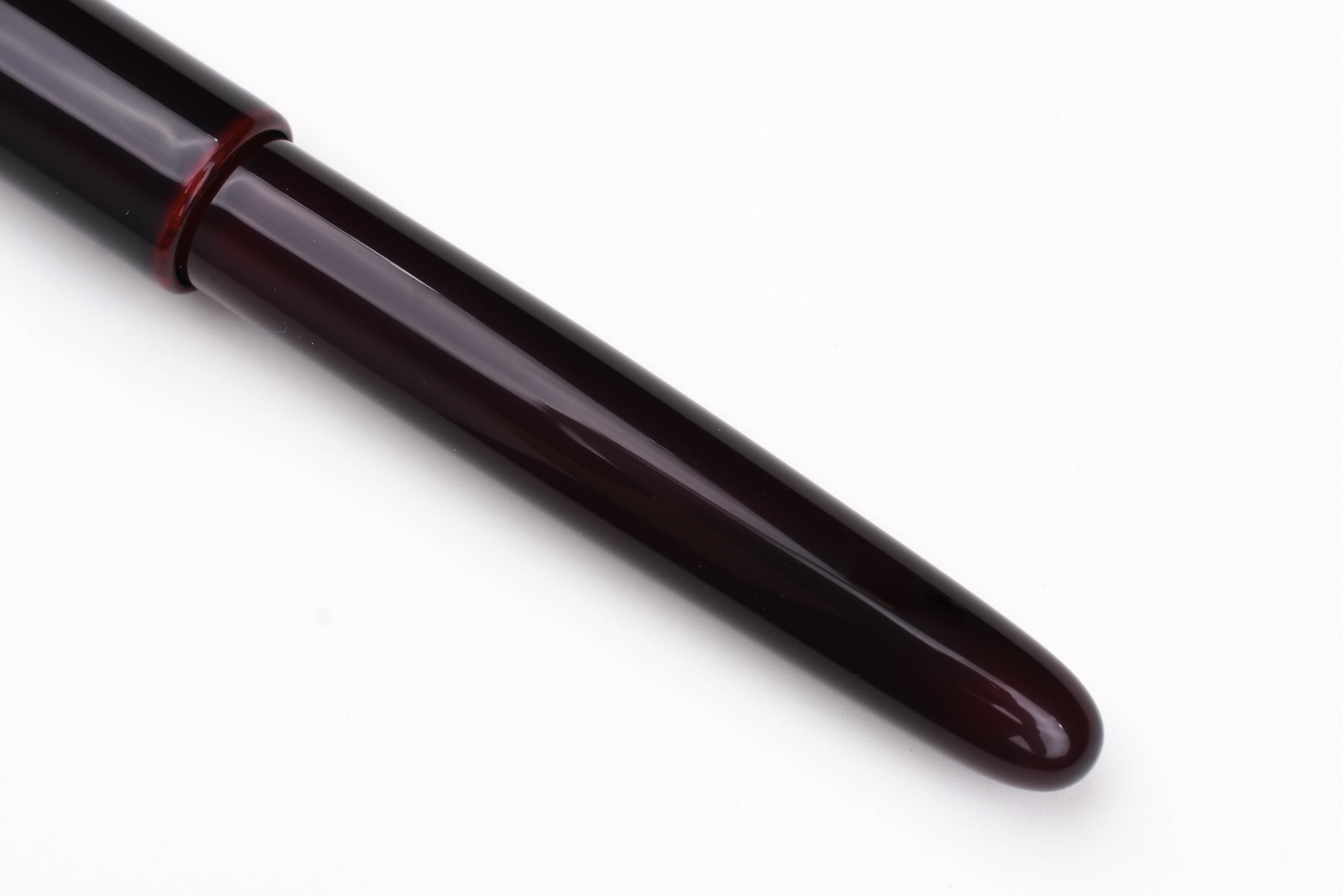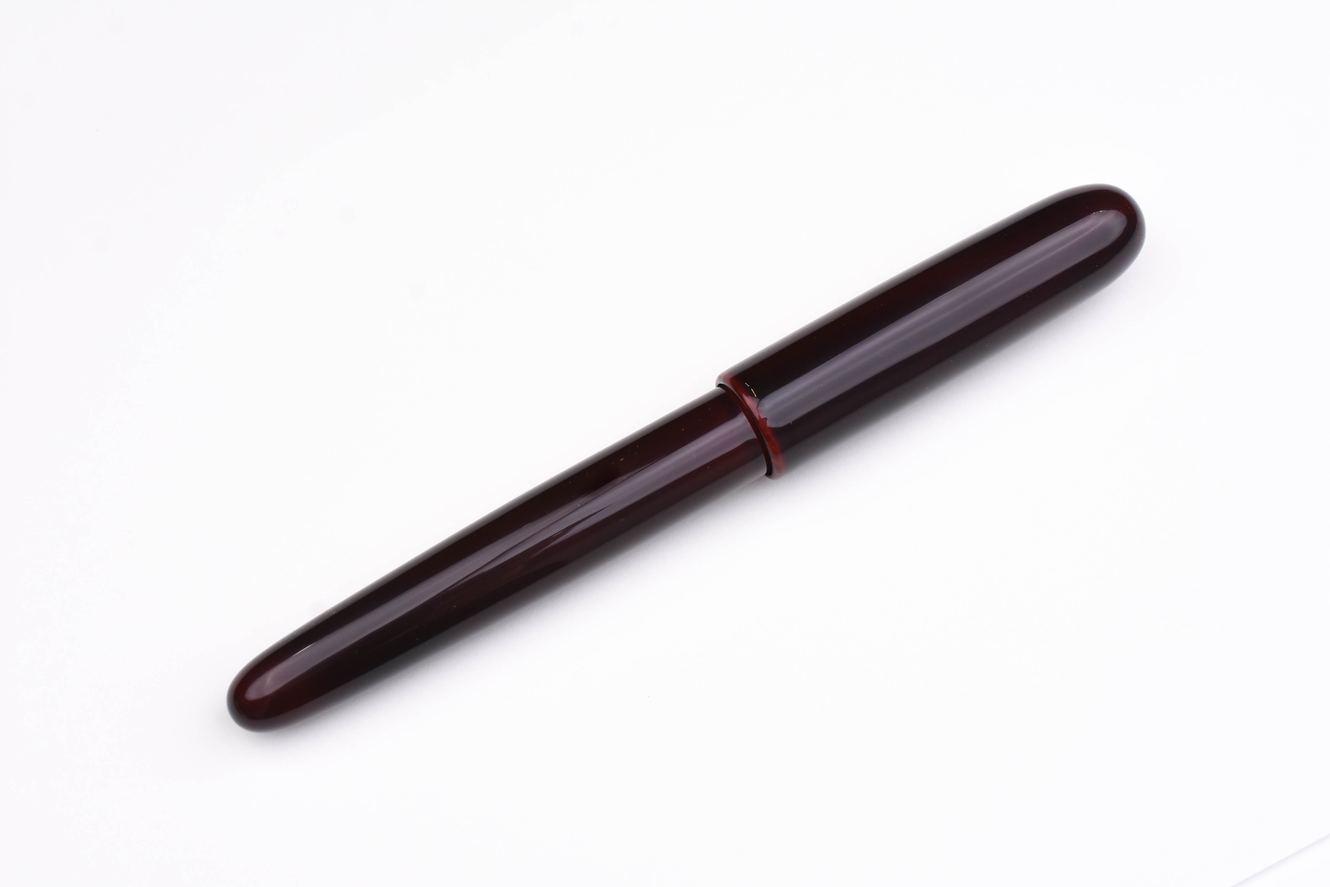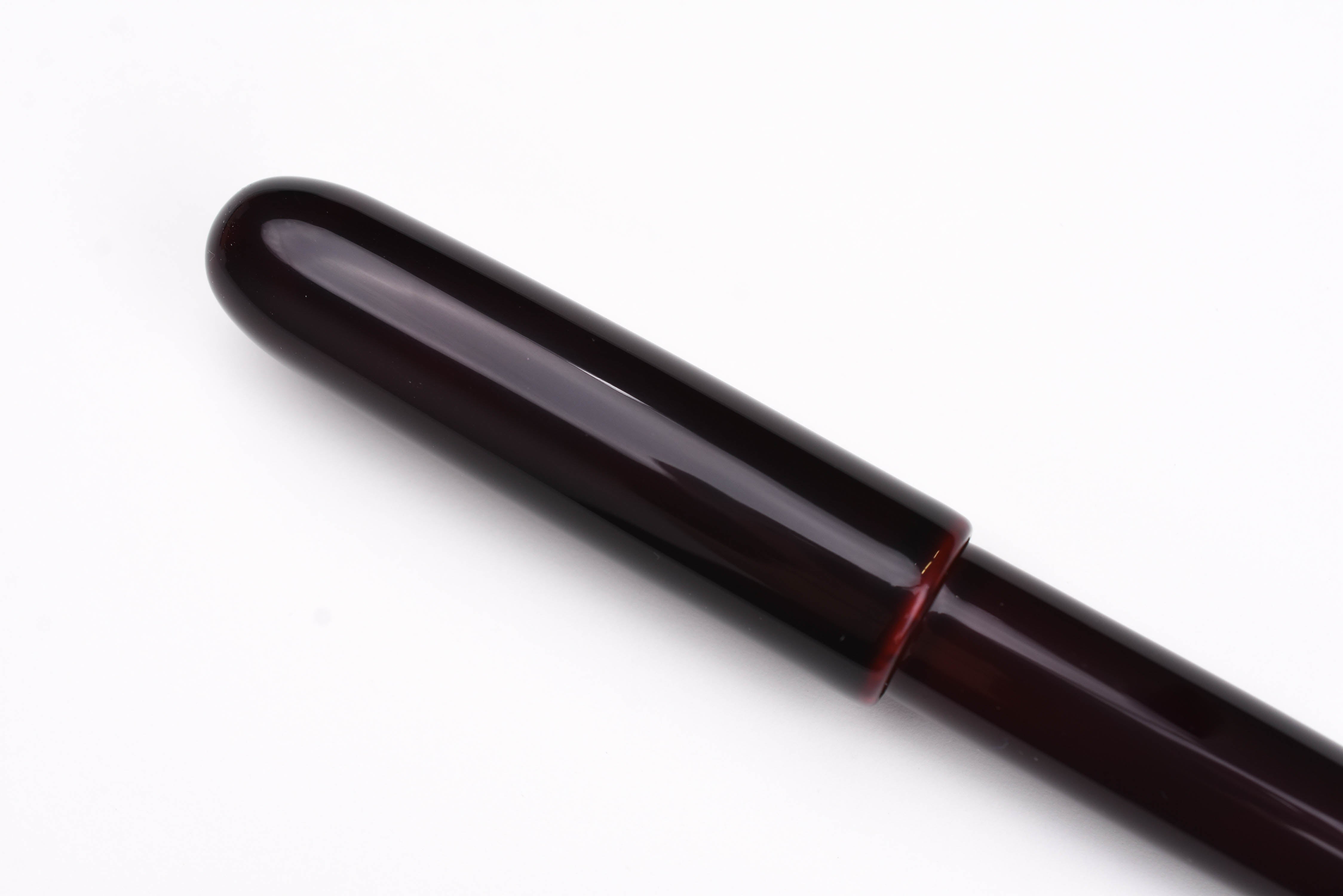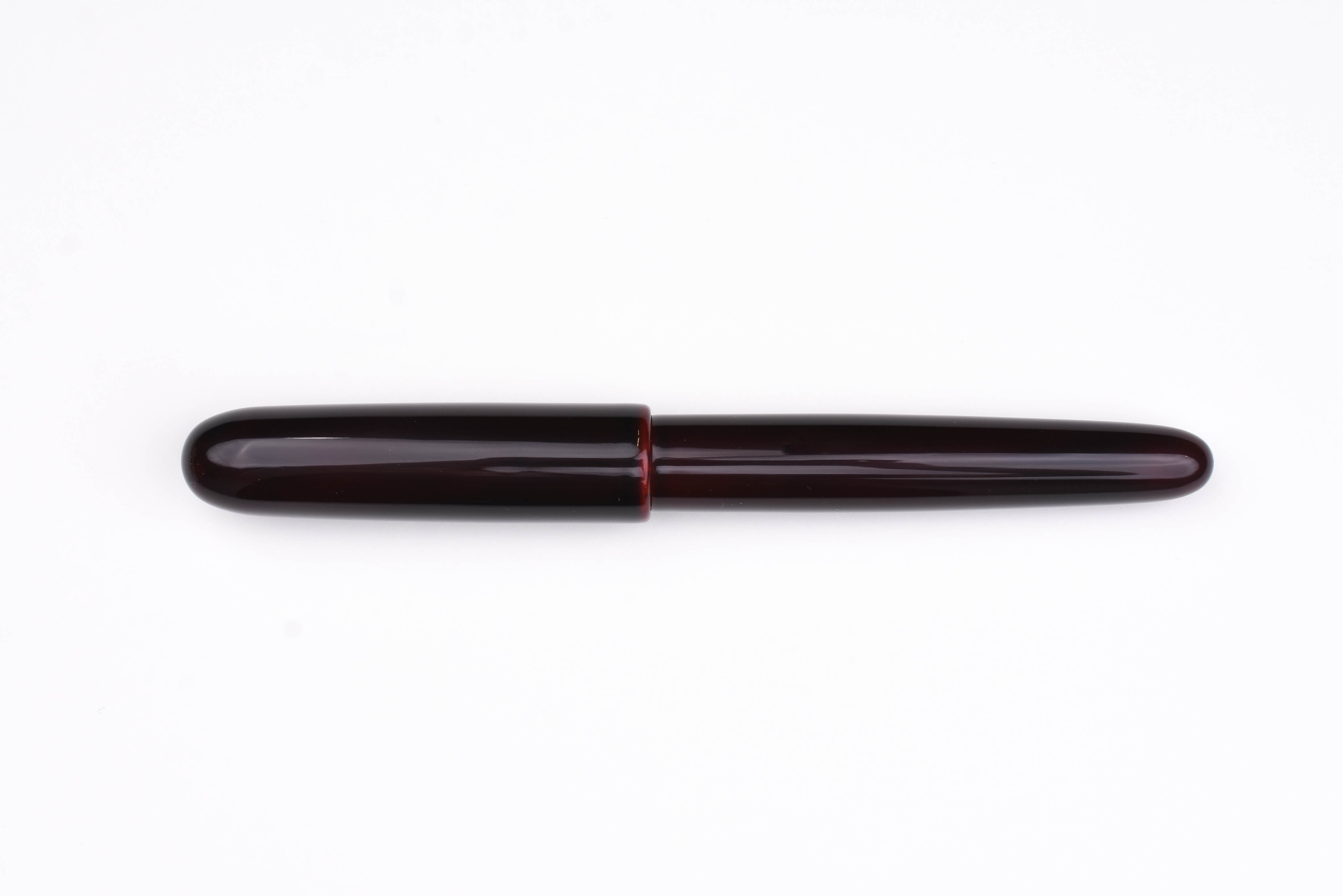 This pen, made by lacquer artist Masanora Sumi, uses the Tame-nuri urushi lacquer technique. Tame-nuri involves layering clear lacquer over a colored urushi lacquer base, creating depth and adding gloss; the result is a complex, subdued, deep red.