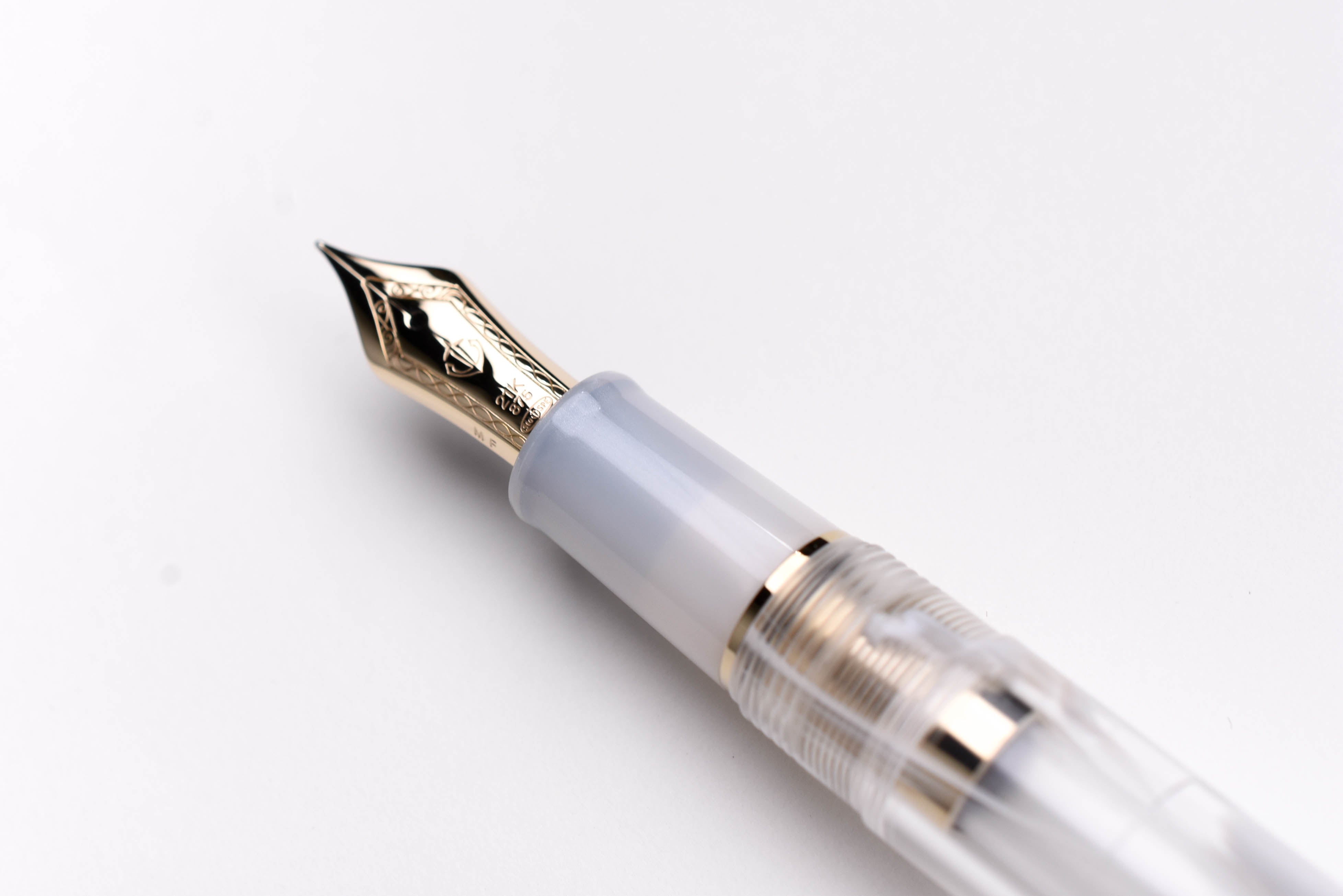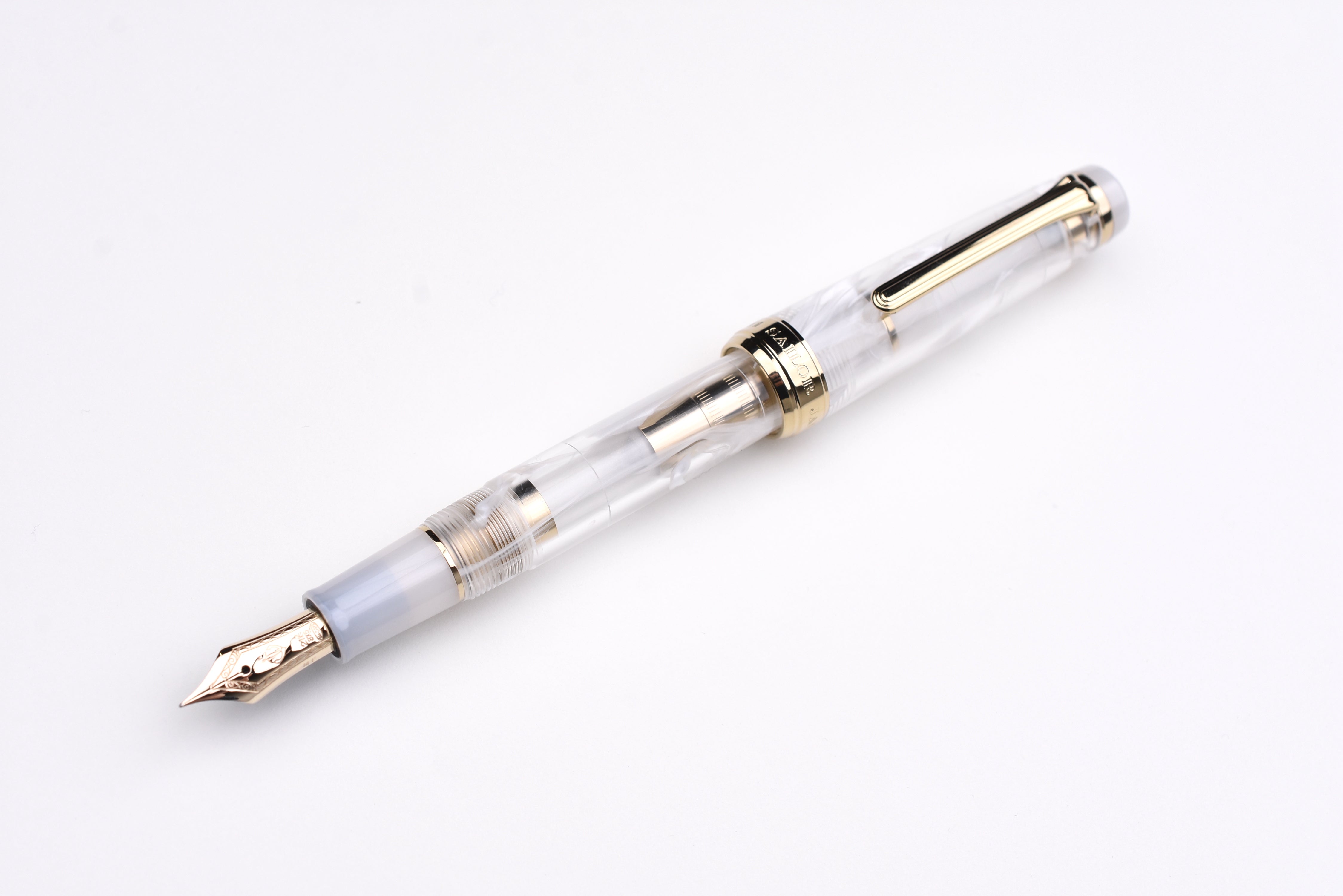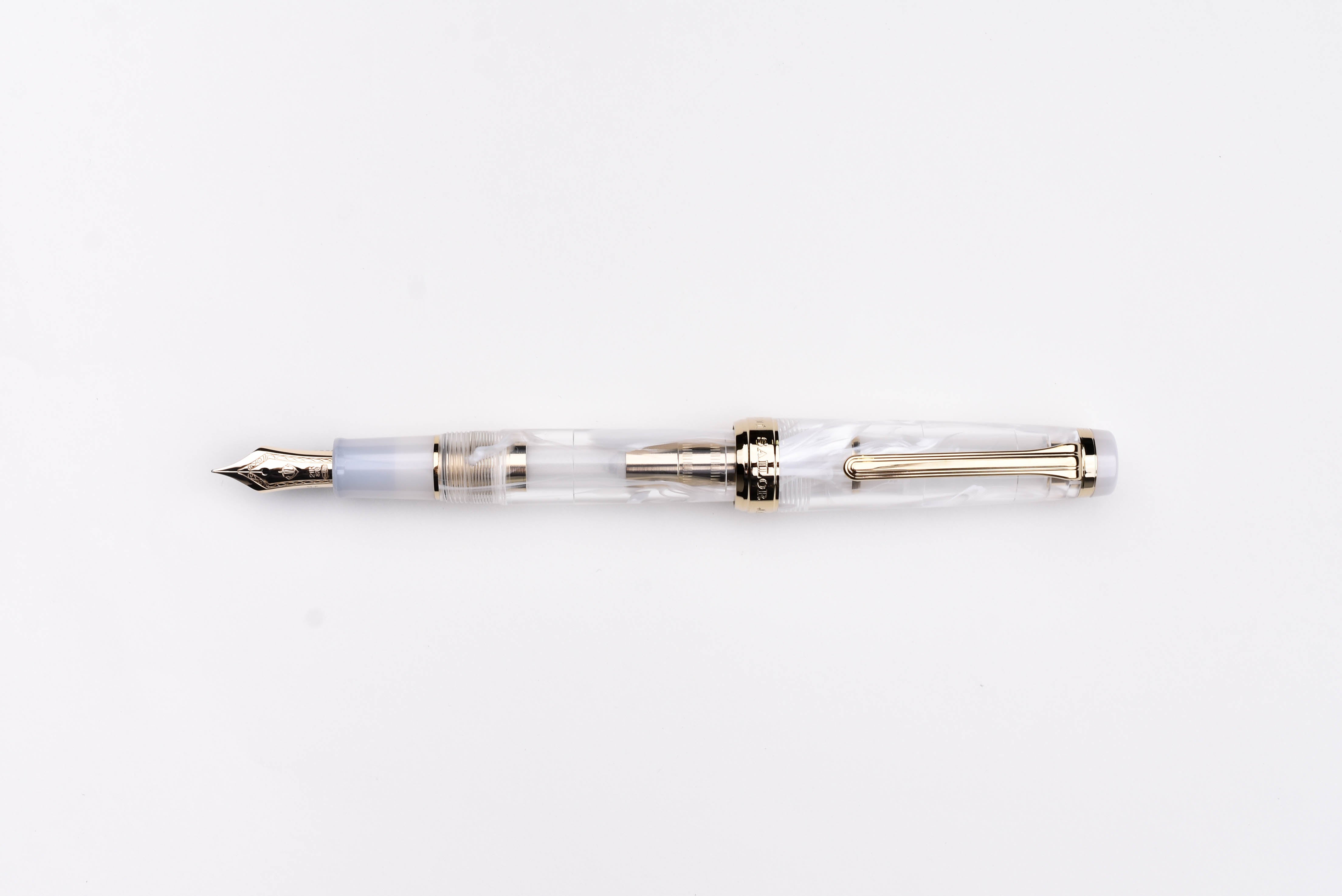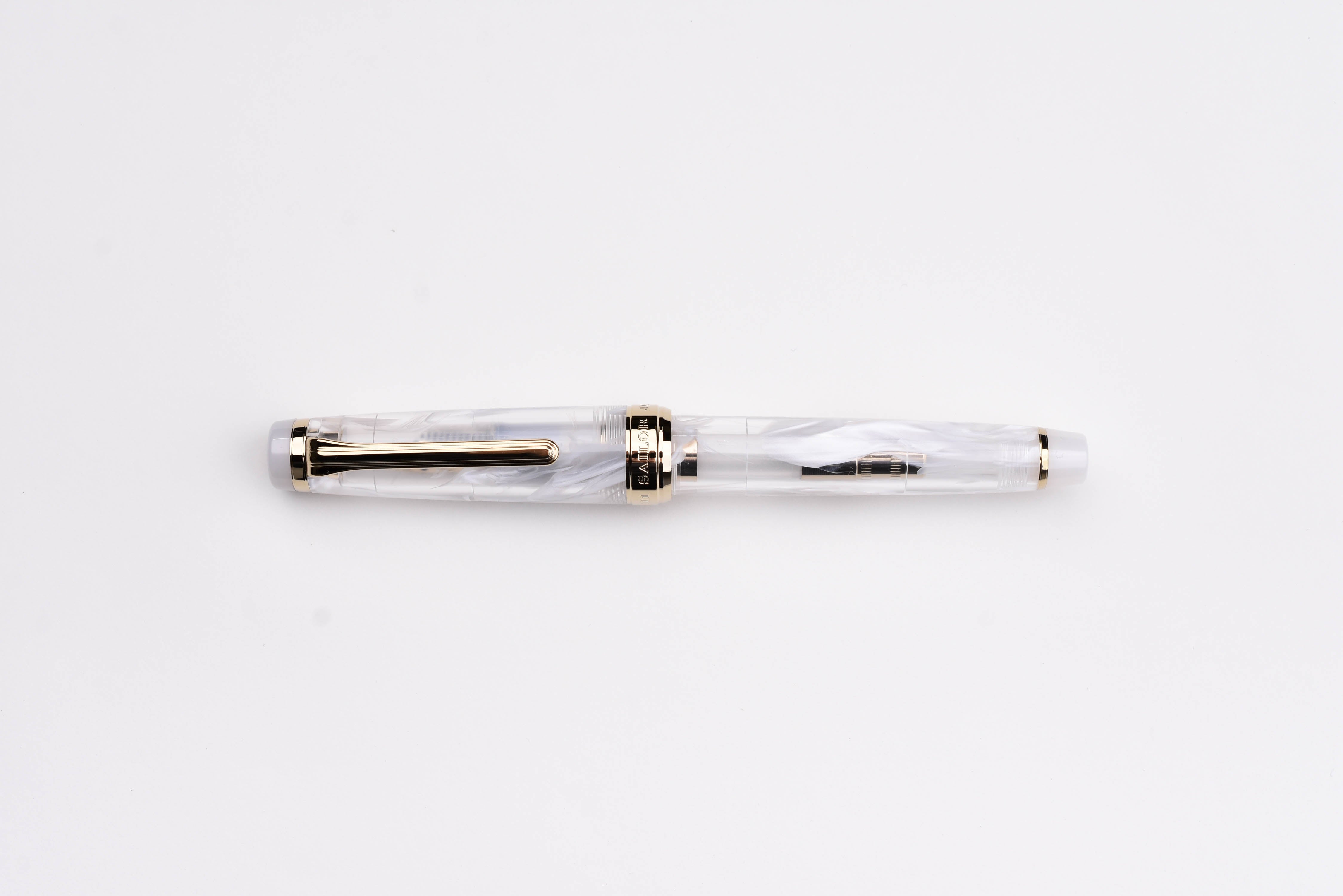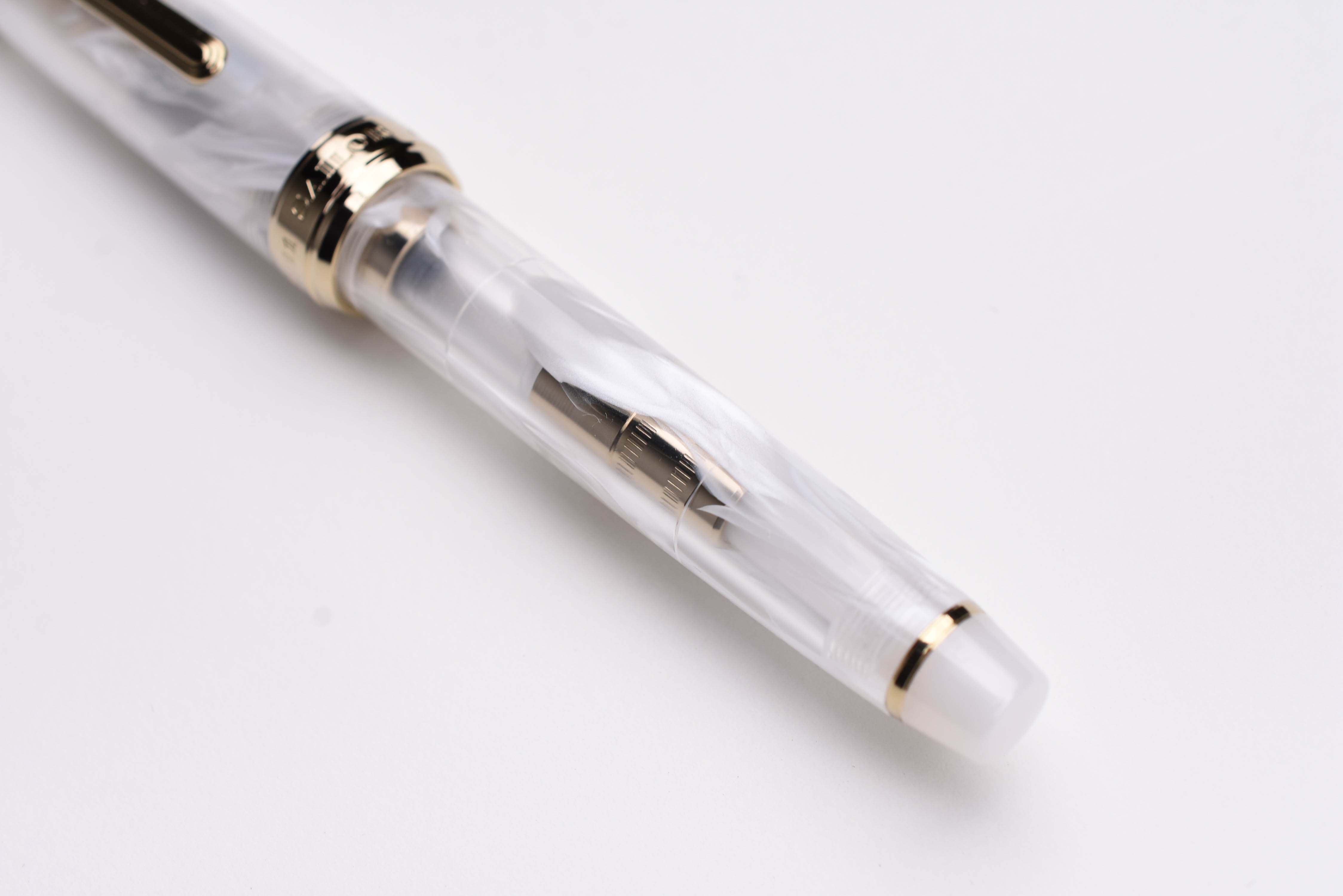 Sailor Veilio Fountain Pen - Pearl White. The swirling white design on the transparent body calls to mind a bridal veil or flowing curtains and is paired with a shining white grip section and finials. The gold interior detailing shines through the transparent body.