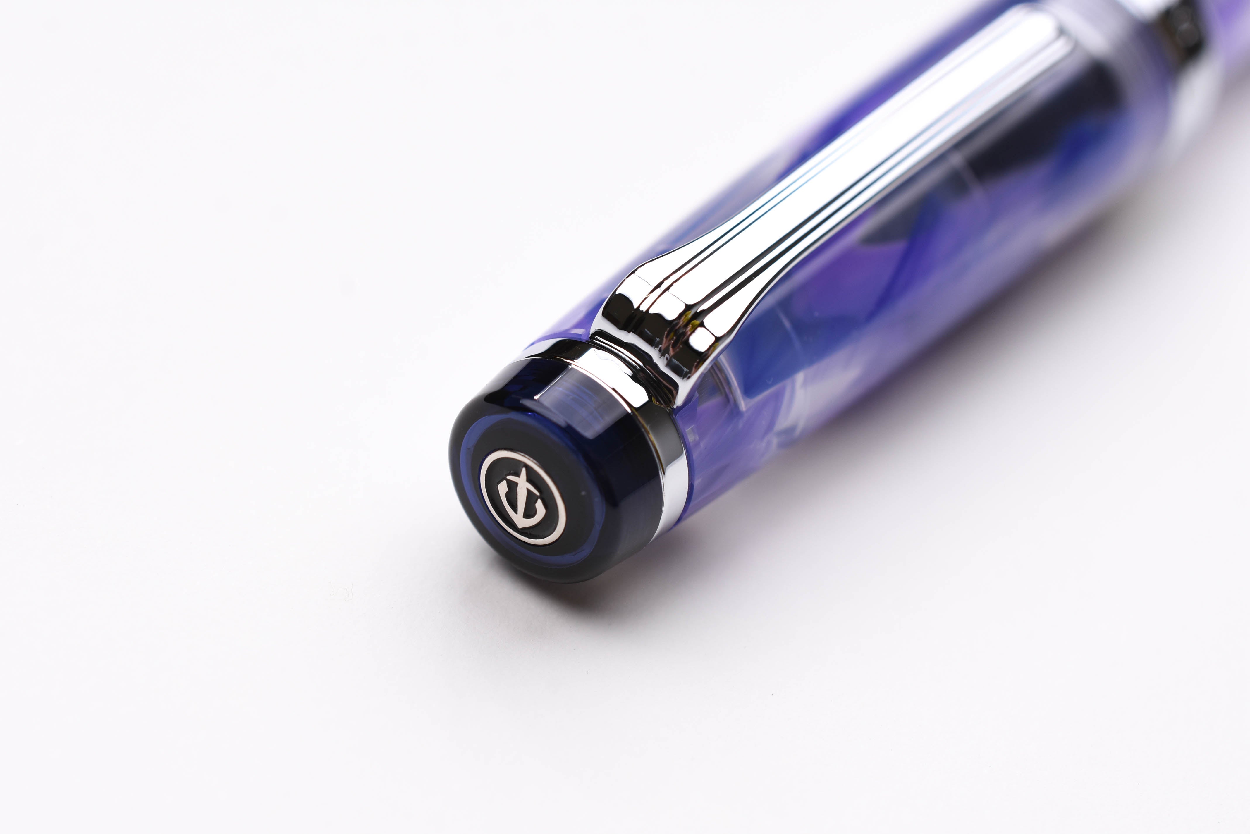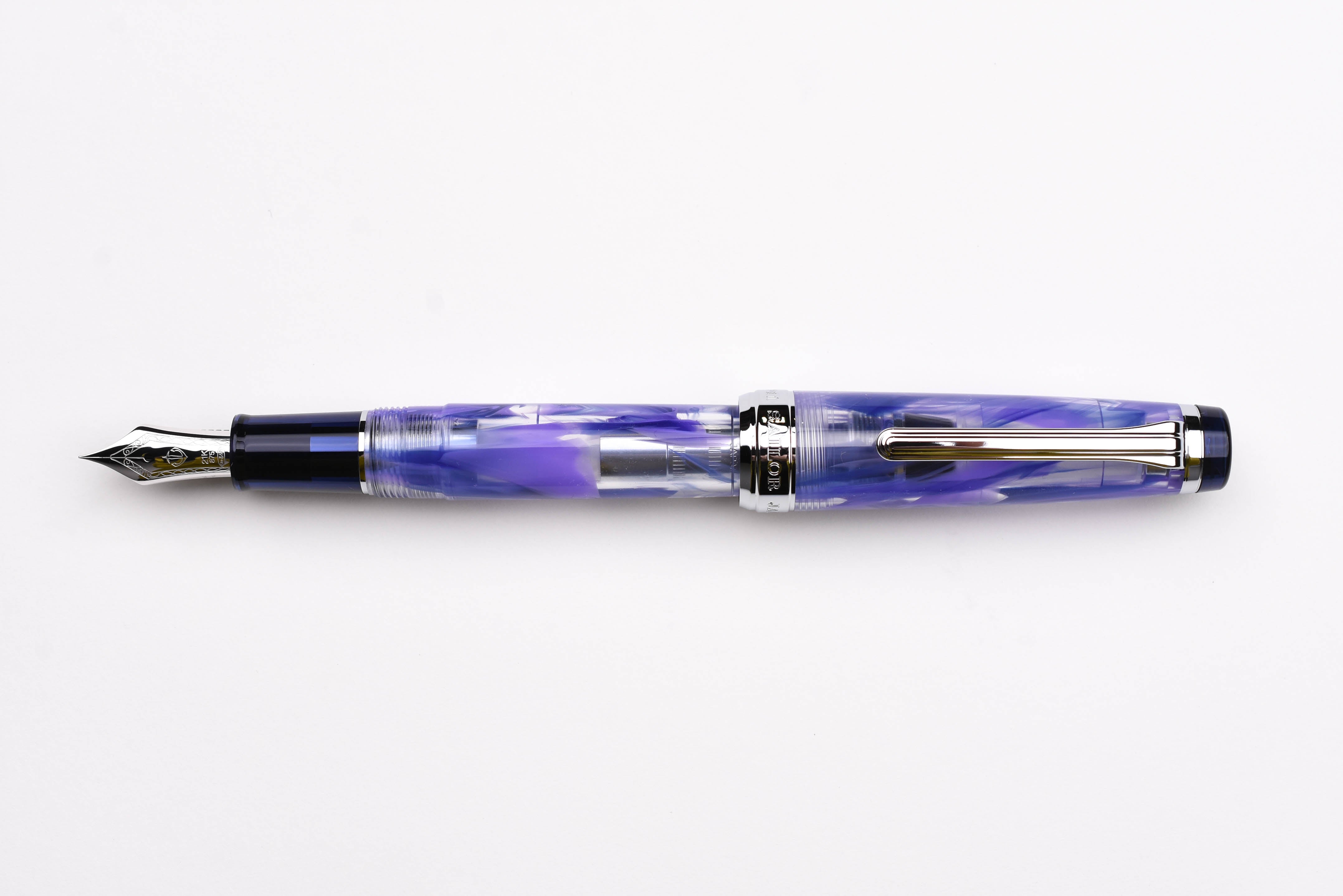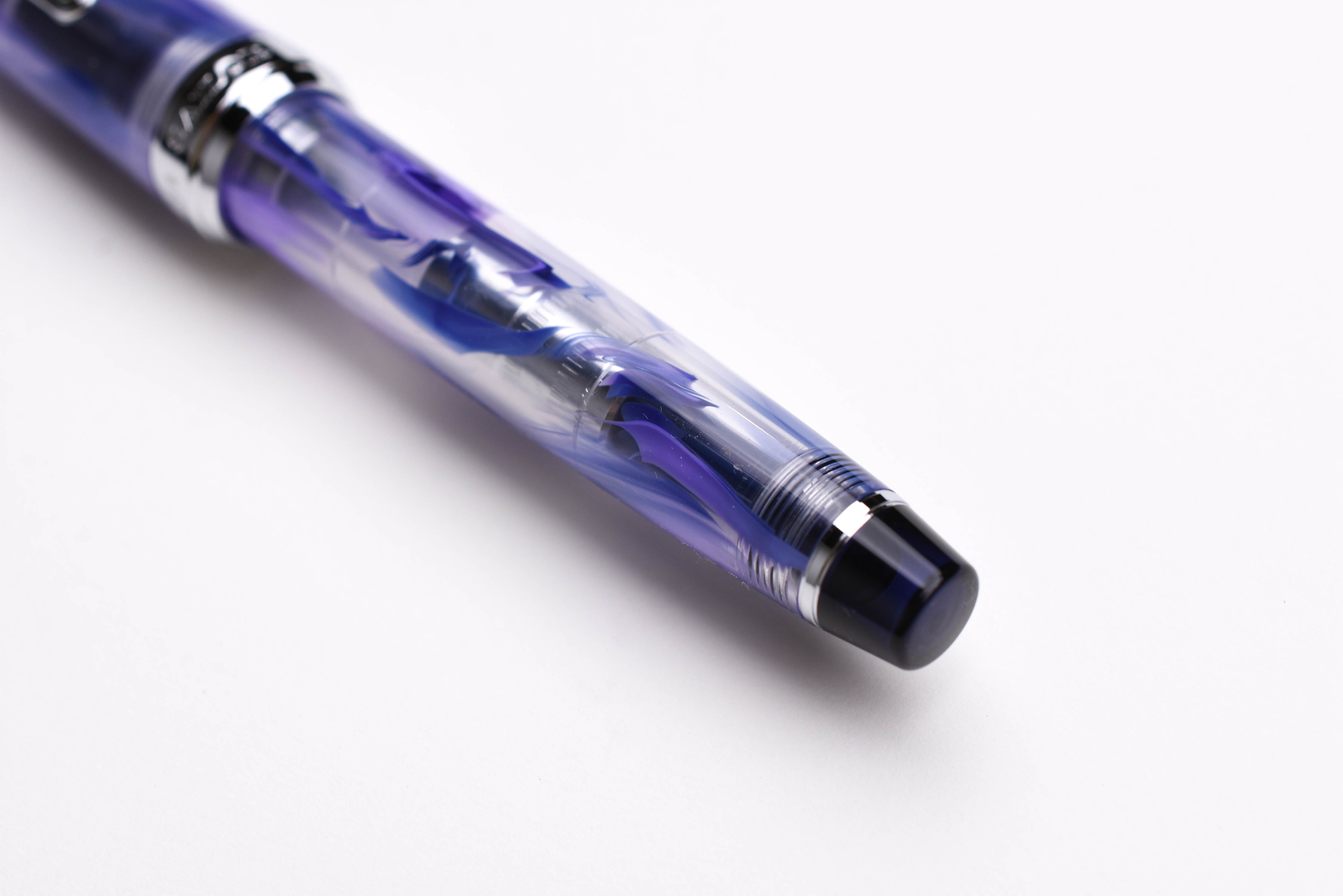 Sailor Veilio Fountain Pen - Violet. Sailor Veilio Violet features a deep, saturated purple section and finials; lighter violet swirls form a marbled pattern on the transparent body, with silver interior detailing peeking through.