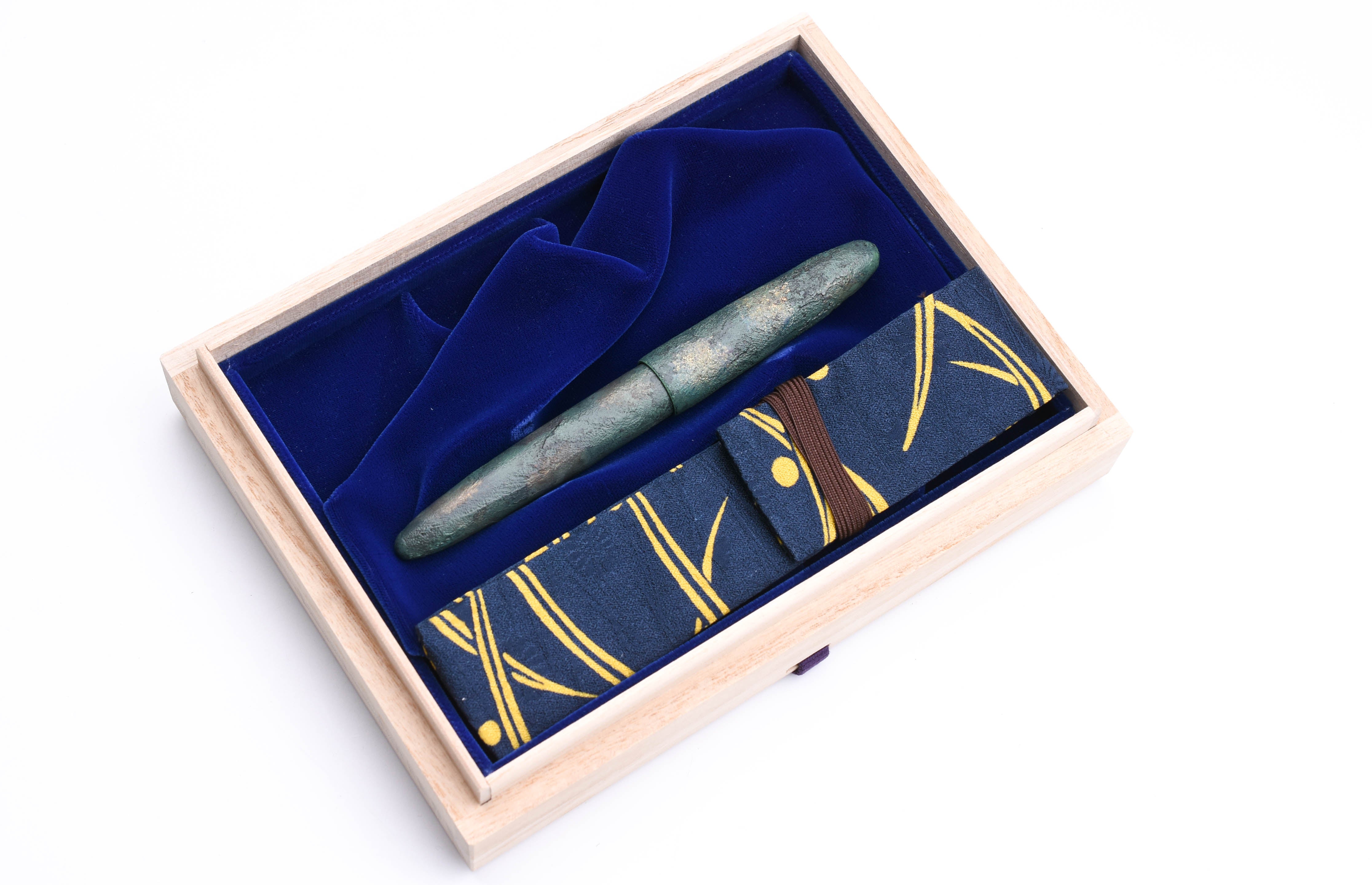 Sailor's Wabi Sabi fountain pens feature a large King of Pen–size body and 21k gold nib; the barrels are made of ebonite, which is lightweight yet durable and warms to the touch. The unique finish is created using a technique called Irogasane Sabinuri, created by urushi artist Wayo Shimamori; it involves the application of urushi lacquer along with polishing powder to build up a textured, organic surface. Finally, various layers of colored lacquer and metallic powder are applied to complete the design. (Note that these pens are designed not to be posted to protect the Sabinuri urushi lacquer.)