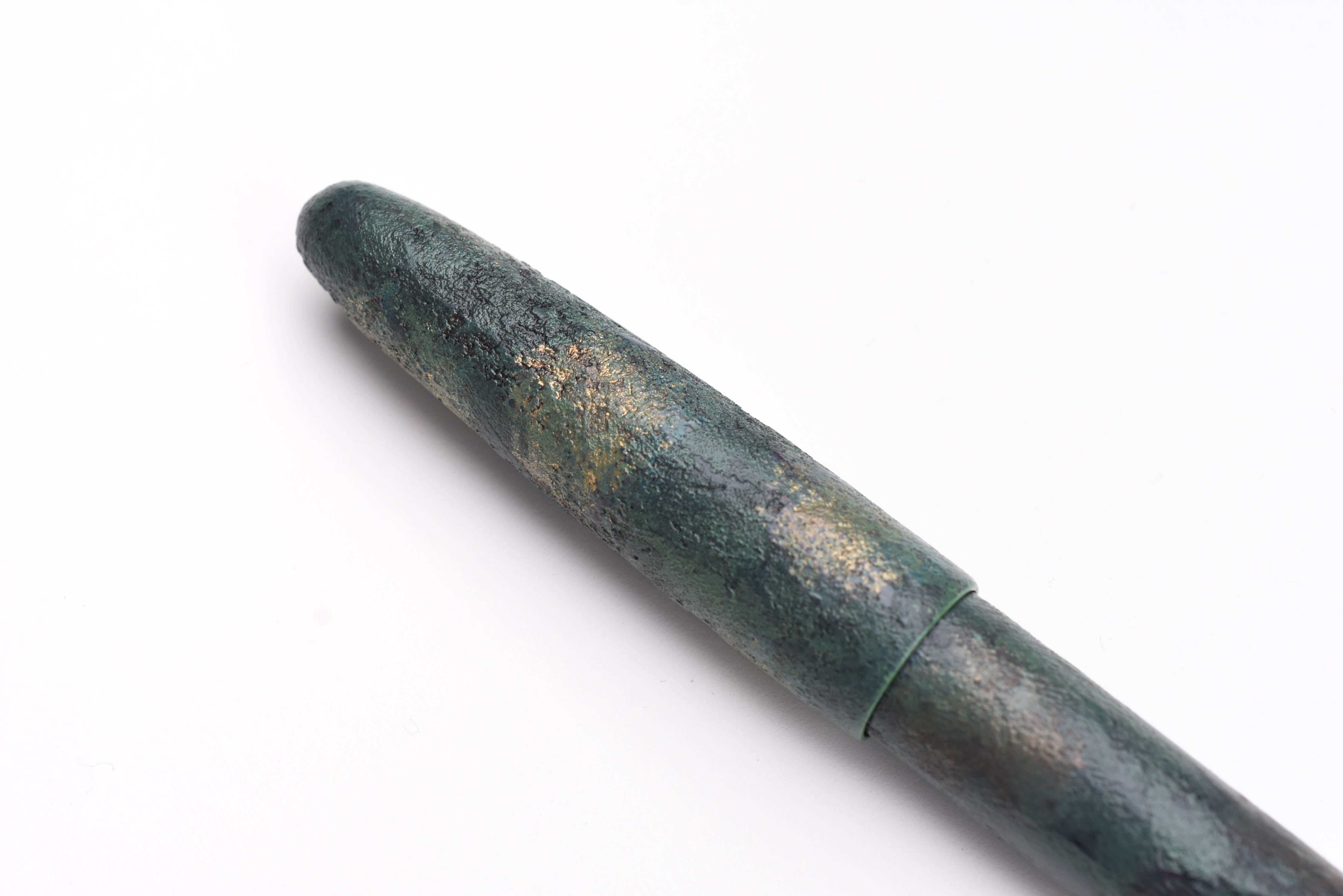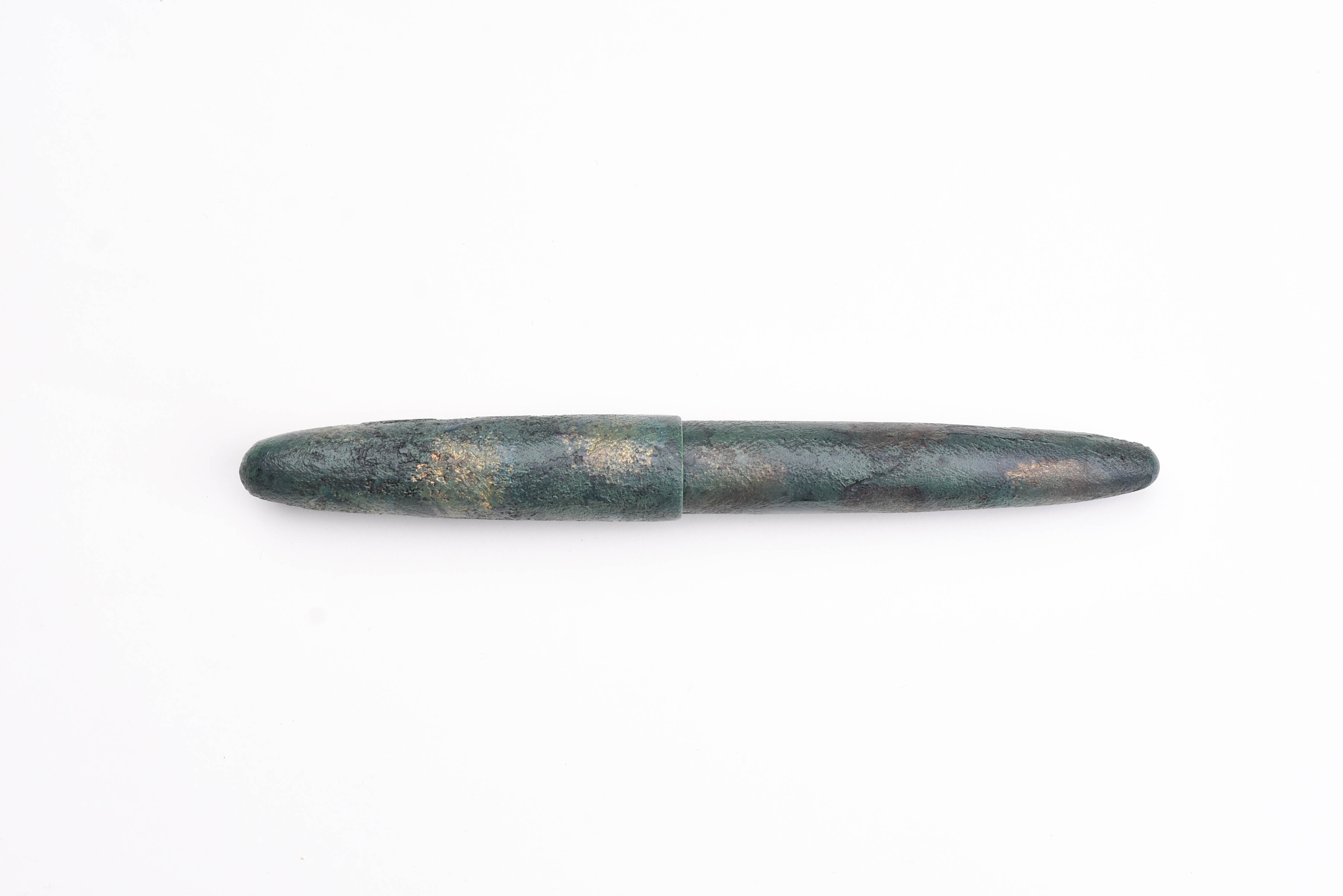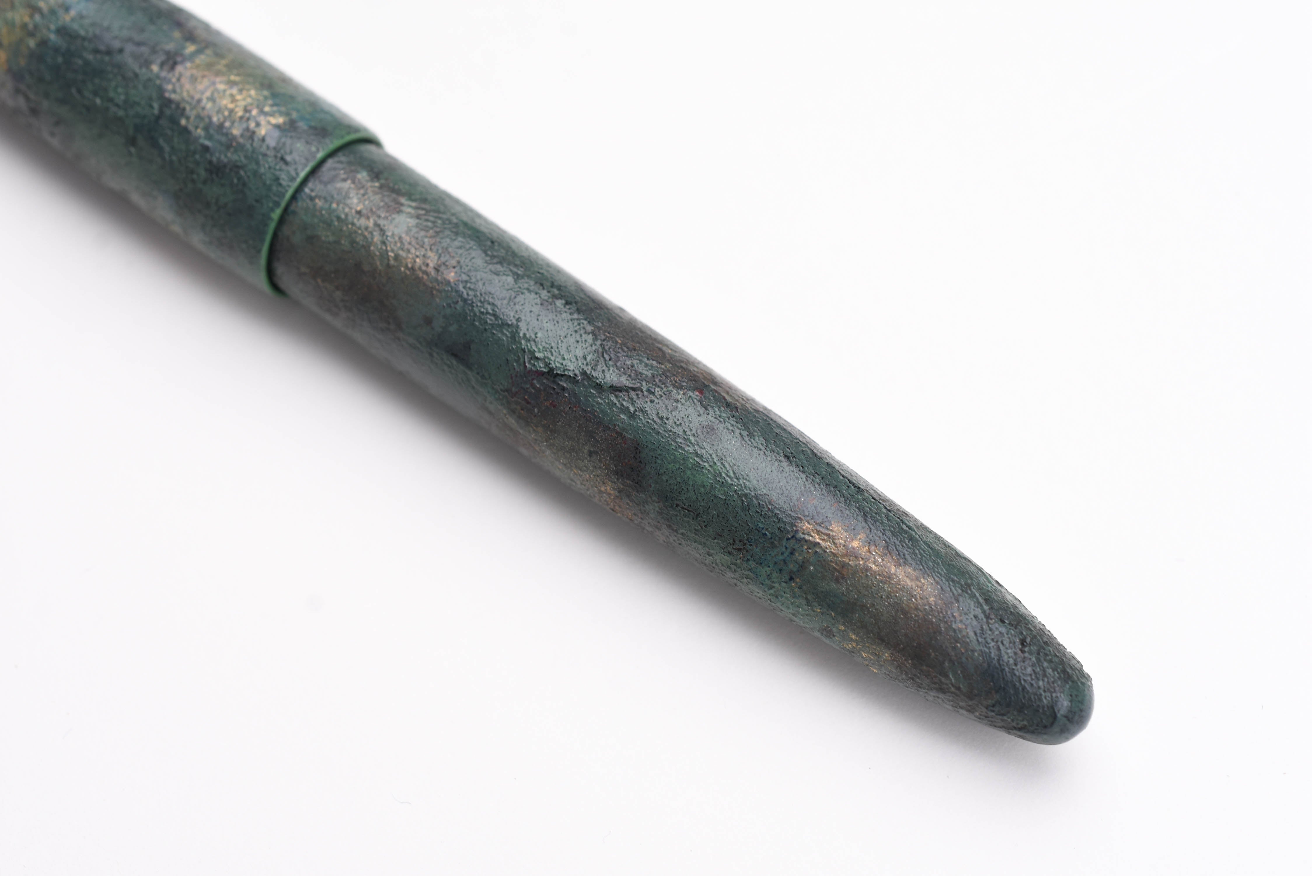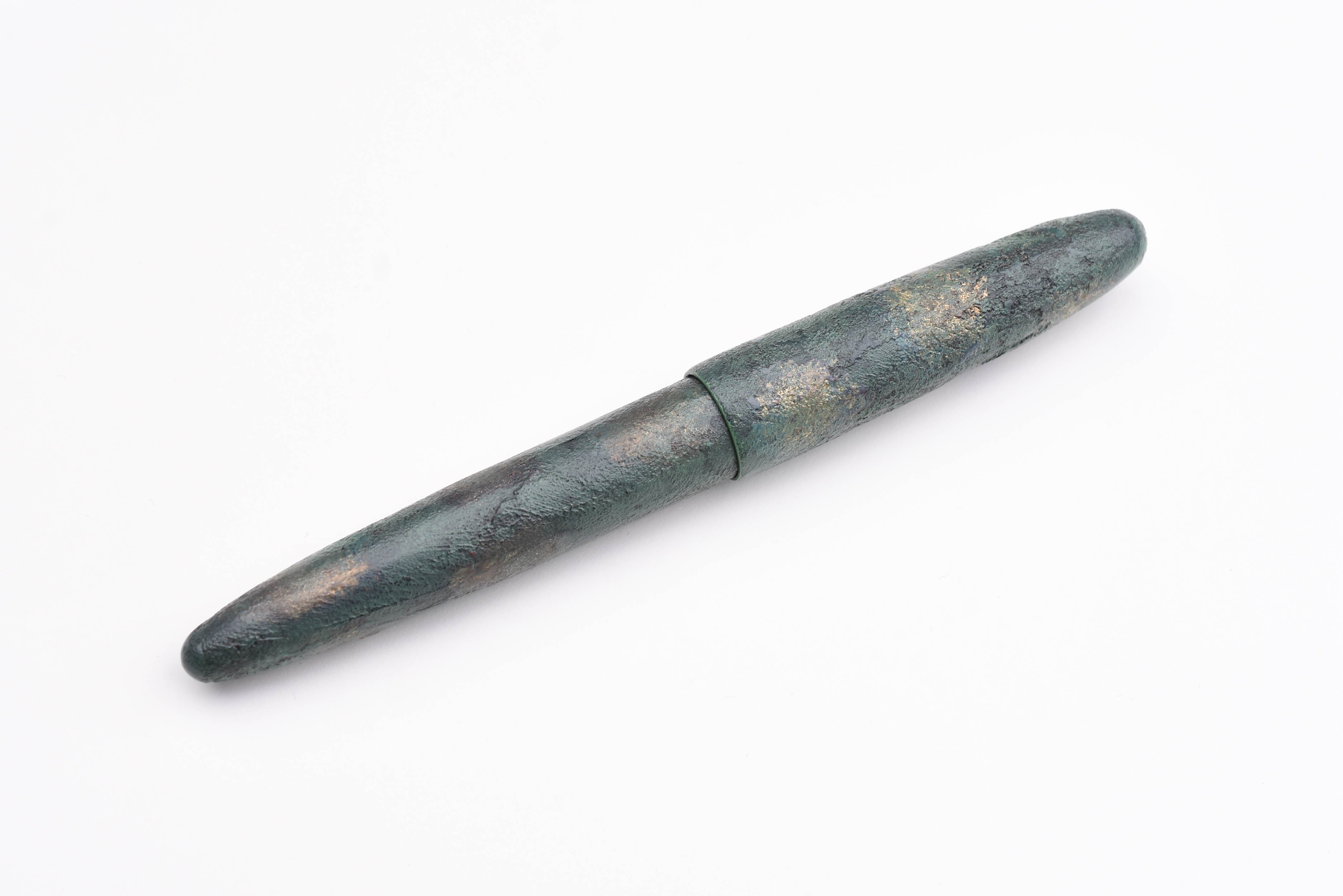 Sailor's Wabi Sabi fountain pens feature a large King of Pen–size body and 21k gold nib; the barrels are made of ebonite, which is lightweight yet durable and warms to the touch. The unique finish is created using a technique called Irogasane Sabinuri, created by urushi artist Wayo Shimamori; it involves the application of urushi lacquer along with polishing powder to build up a textured, organic surface. Finally, various layers of colored lacquer and metallic powder are applied to complete the design. (Note that these pens are designed not to be posted to protect the Sabinuri urushi lacquer.)