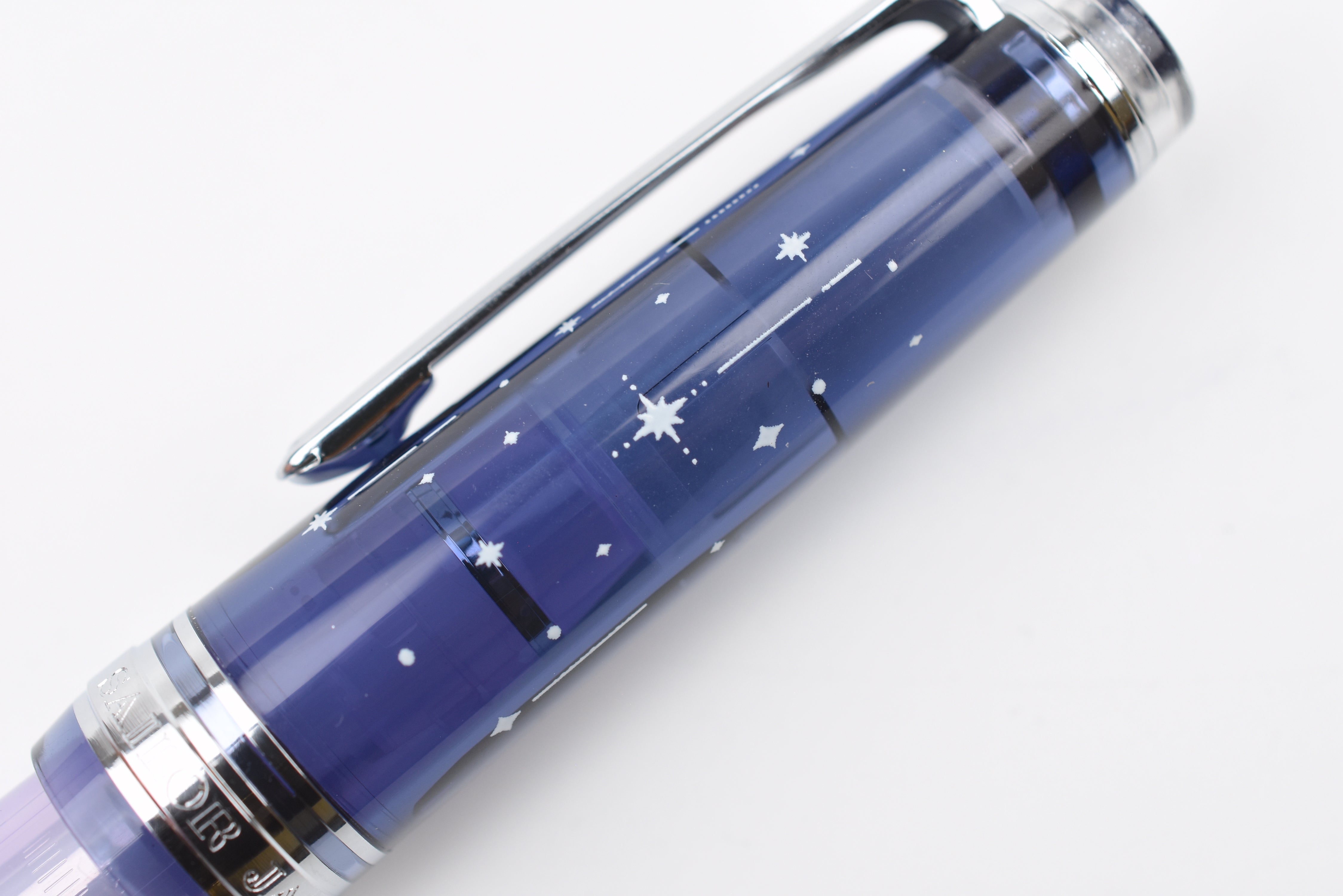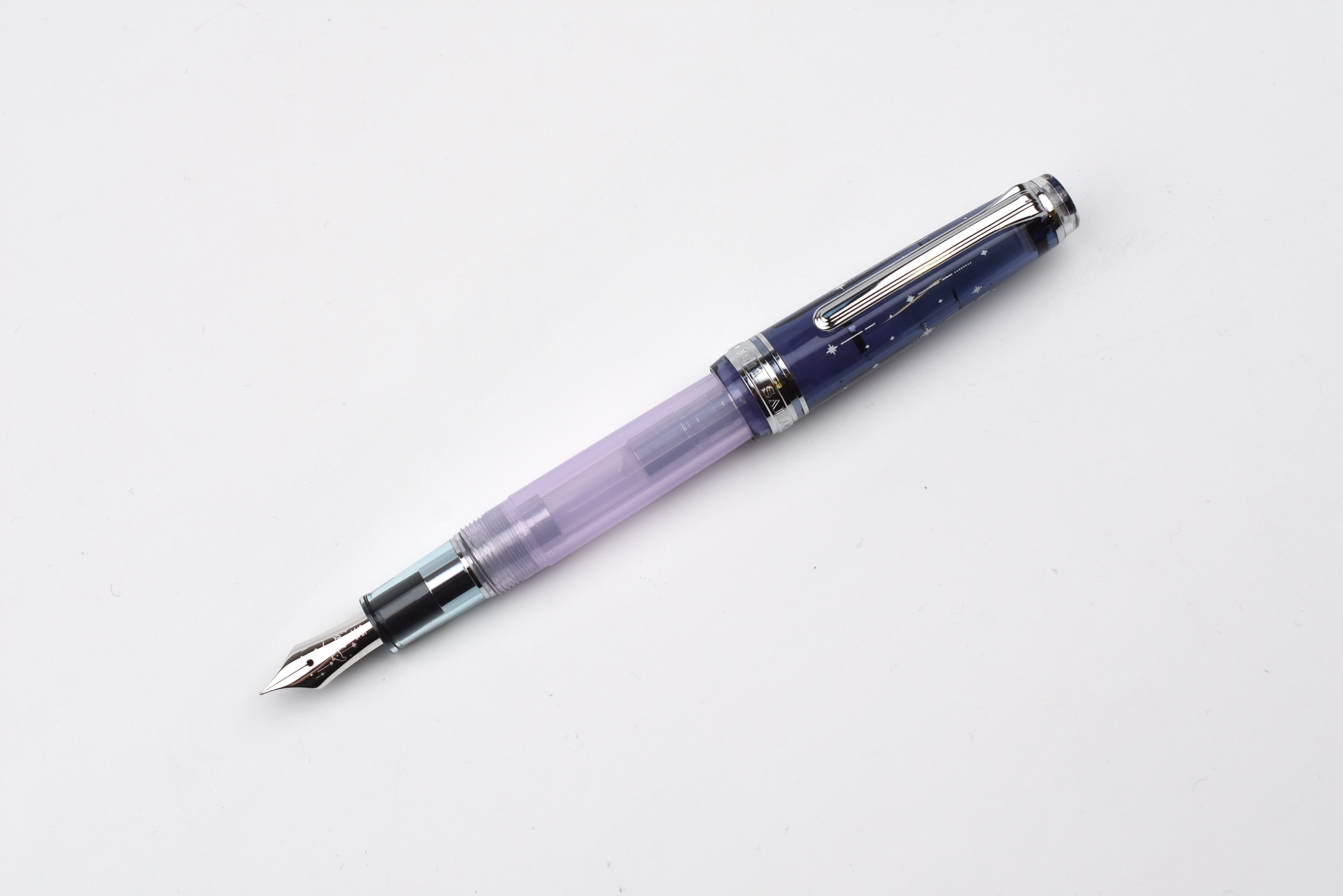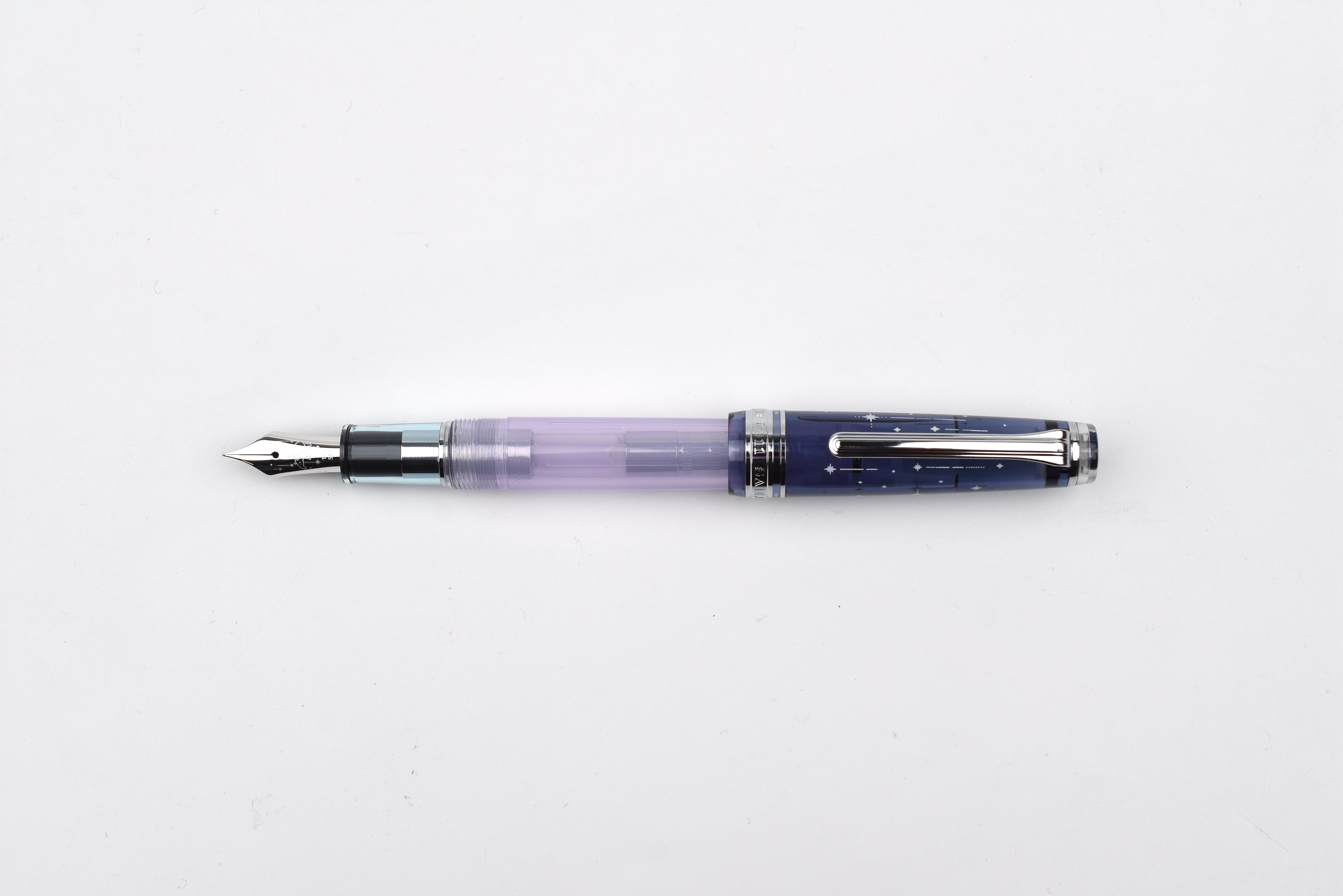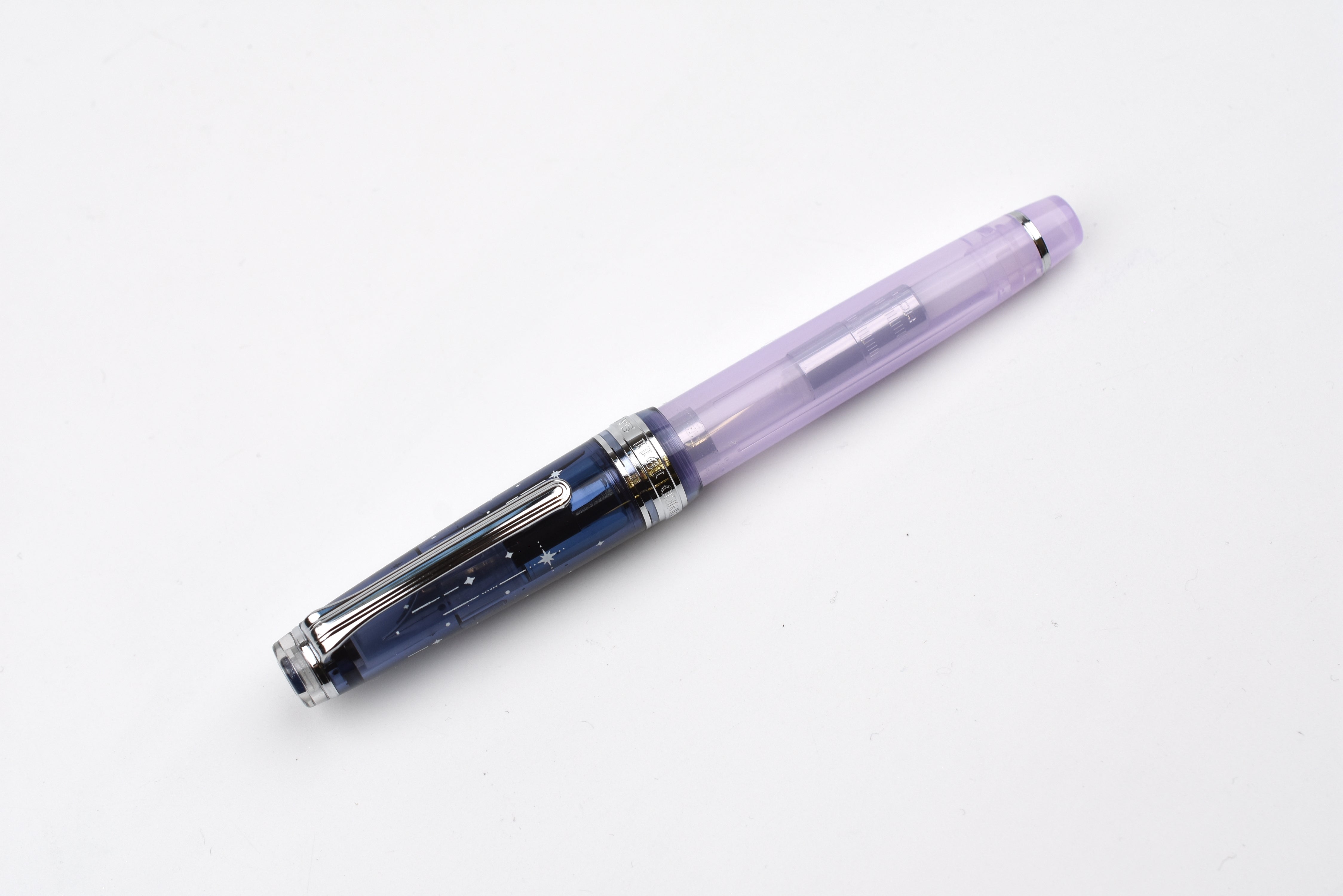 The pen features a captivating clear navy-purple translucent resin that allows light to pass through, revealing deep, mysterious tones reminiscent of twilight just before the stars appear. Accented with rhodium-plated metal parts that perfectly complement its cool color palette, this Pro Gear Slim model balances refined elegance with a quiet, dreamlike atmosphere, making it a striking and evocative writing instrument.