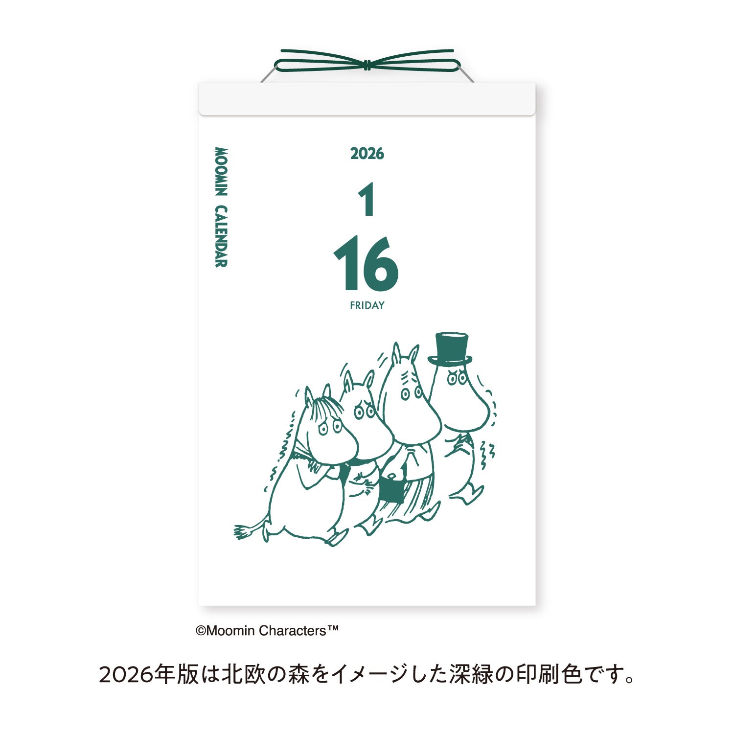 This daily calendar features a Moomin motif one page at a time for 365 days of the year. You can tear away each page to reveal the next day with a new Moomin illustration. This year’s daily illustrations are printed in a beautiful forest green ink, and the calendar can be hung on your wall, letting you enjoy Moomin all through the year.