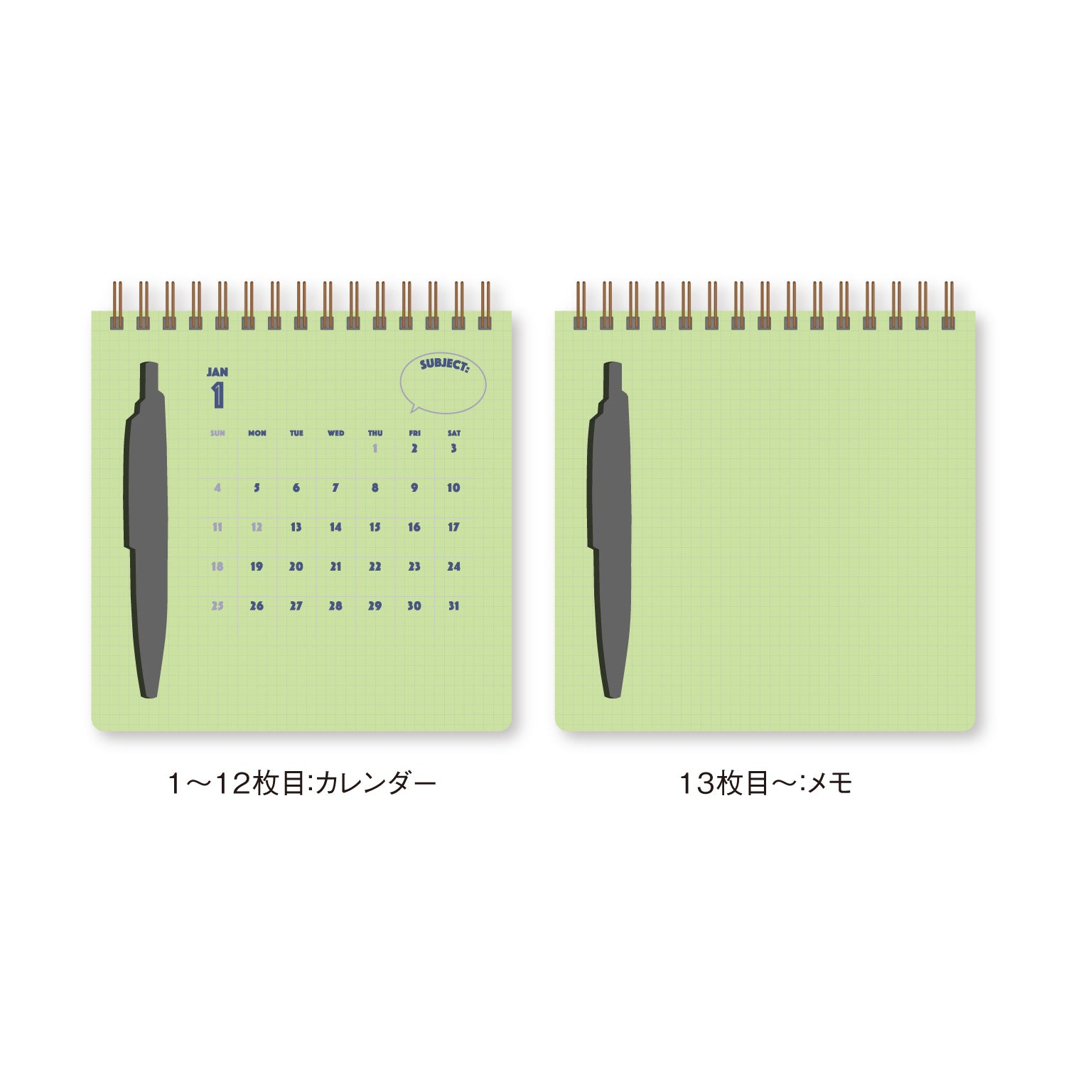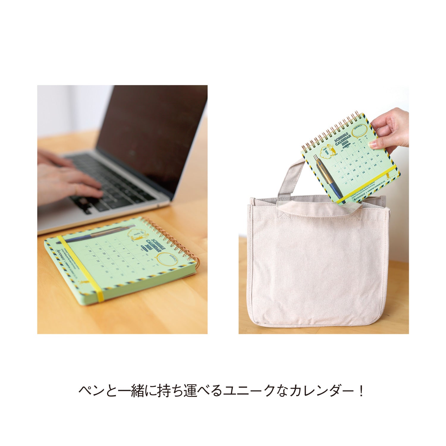 A portable desktop calendar with a pen, created in collaboration with the stationery brand Anterique. Designed for everyday use, it features adorable Anterique characters and playful illustrations that appear when the protective cover and calendar pages are layered together. It includes both monthly calendar layouts and blank grid pages for notes, sketches, or daily scribbles. Compact and functional, it’s a fun and creative companion for any desk or workspace.