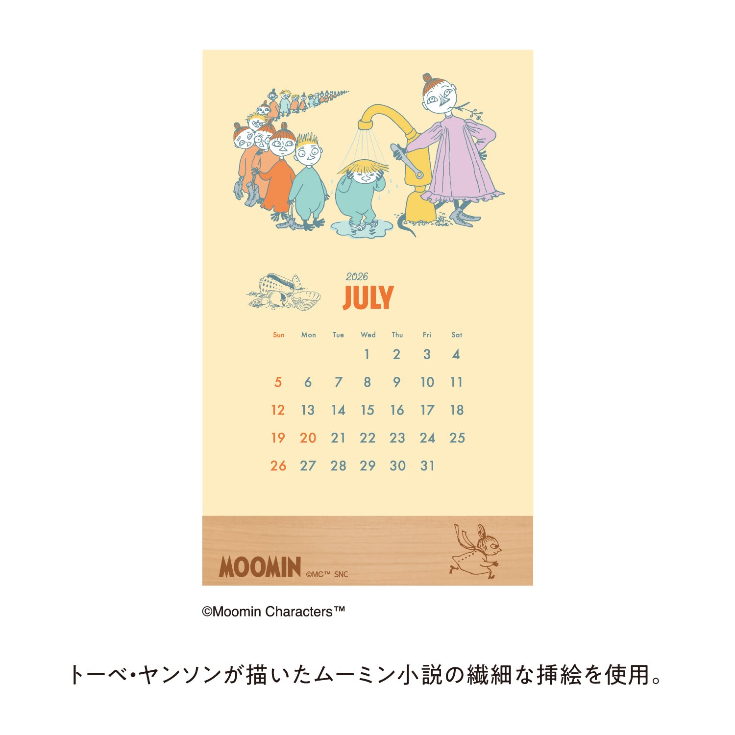 A desktop calendar with a natural wooden stand featuring the charming world of Moomin created by Tove Jansson. Each page showcases elegant illustrations from the beloved Moomin novels in a refined, timeless design. The wooden stand is printed with the popular character Little My, adding a playful touch to your desk.