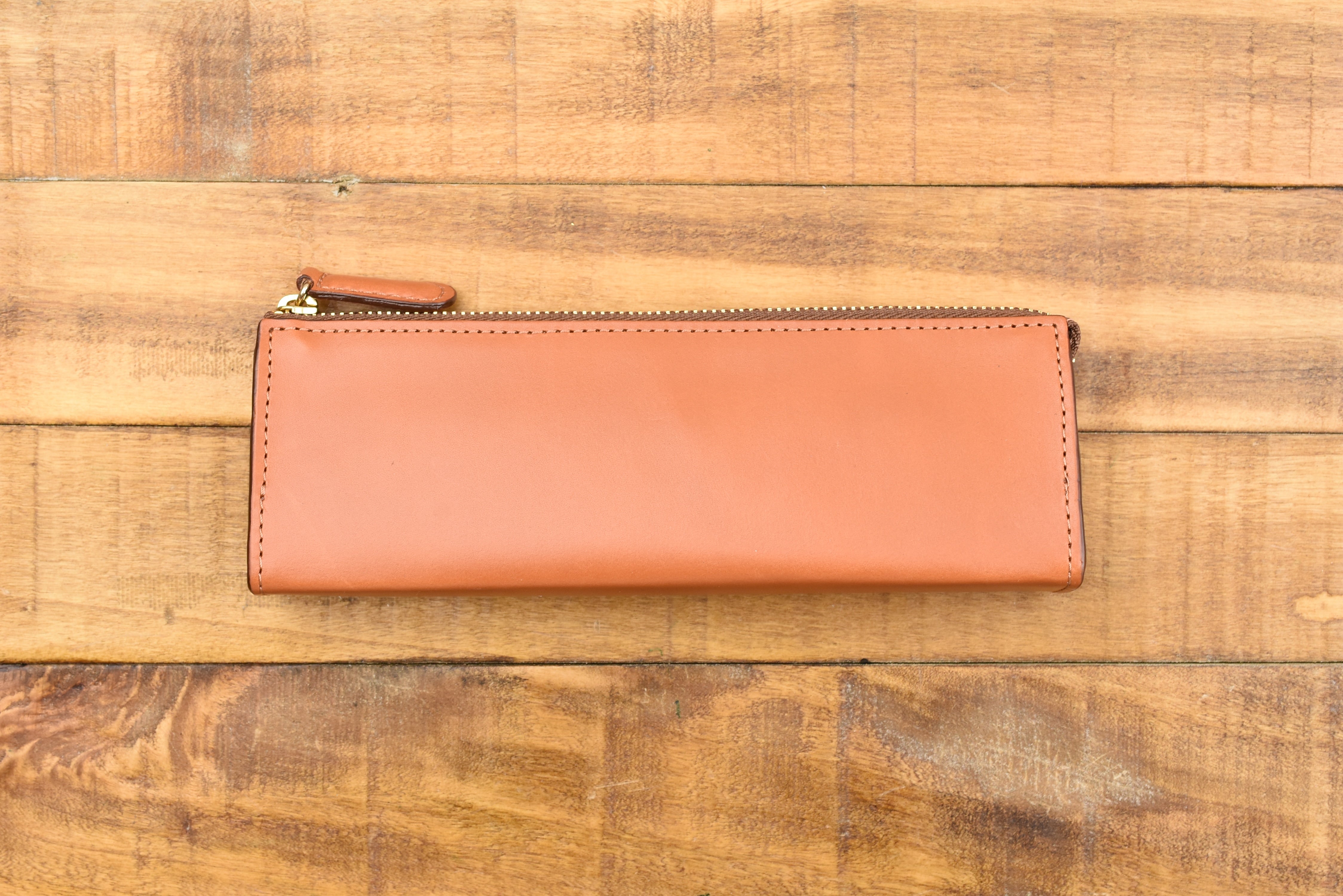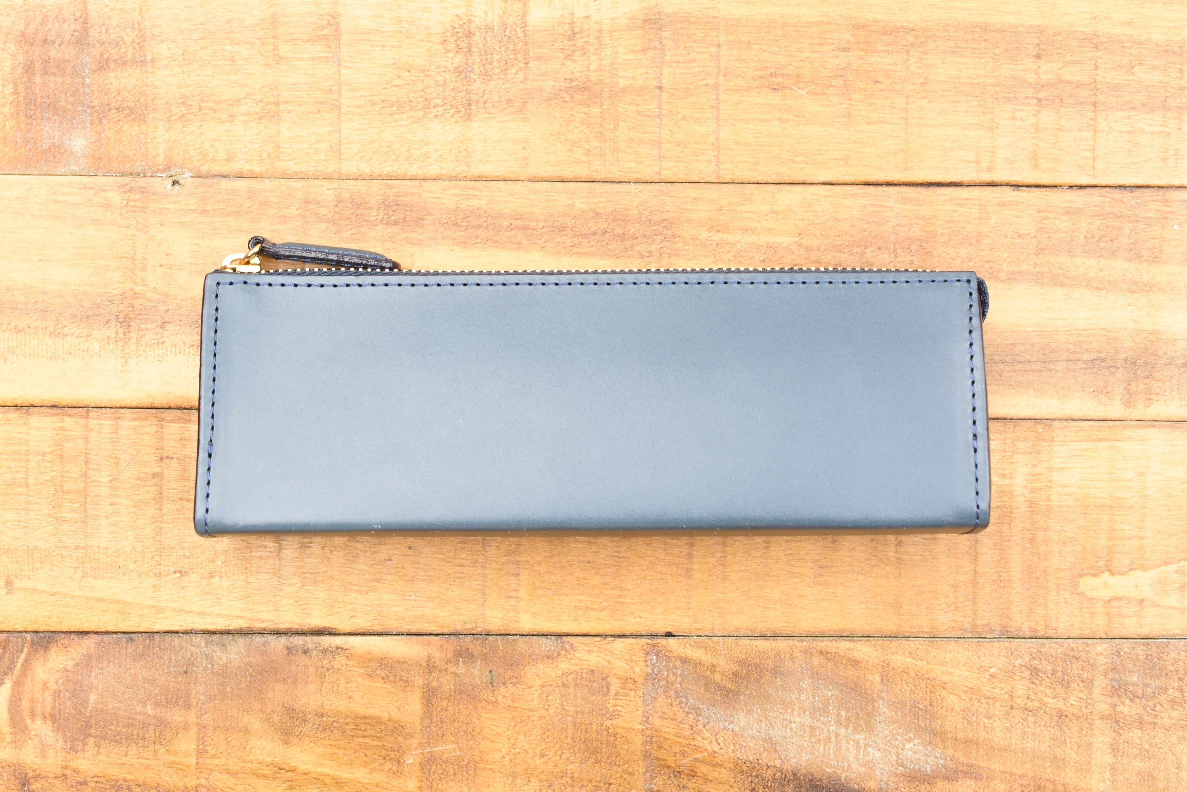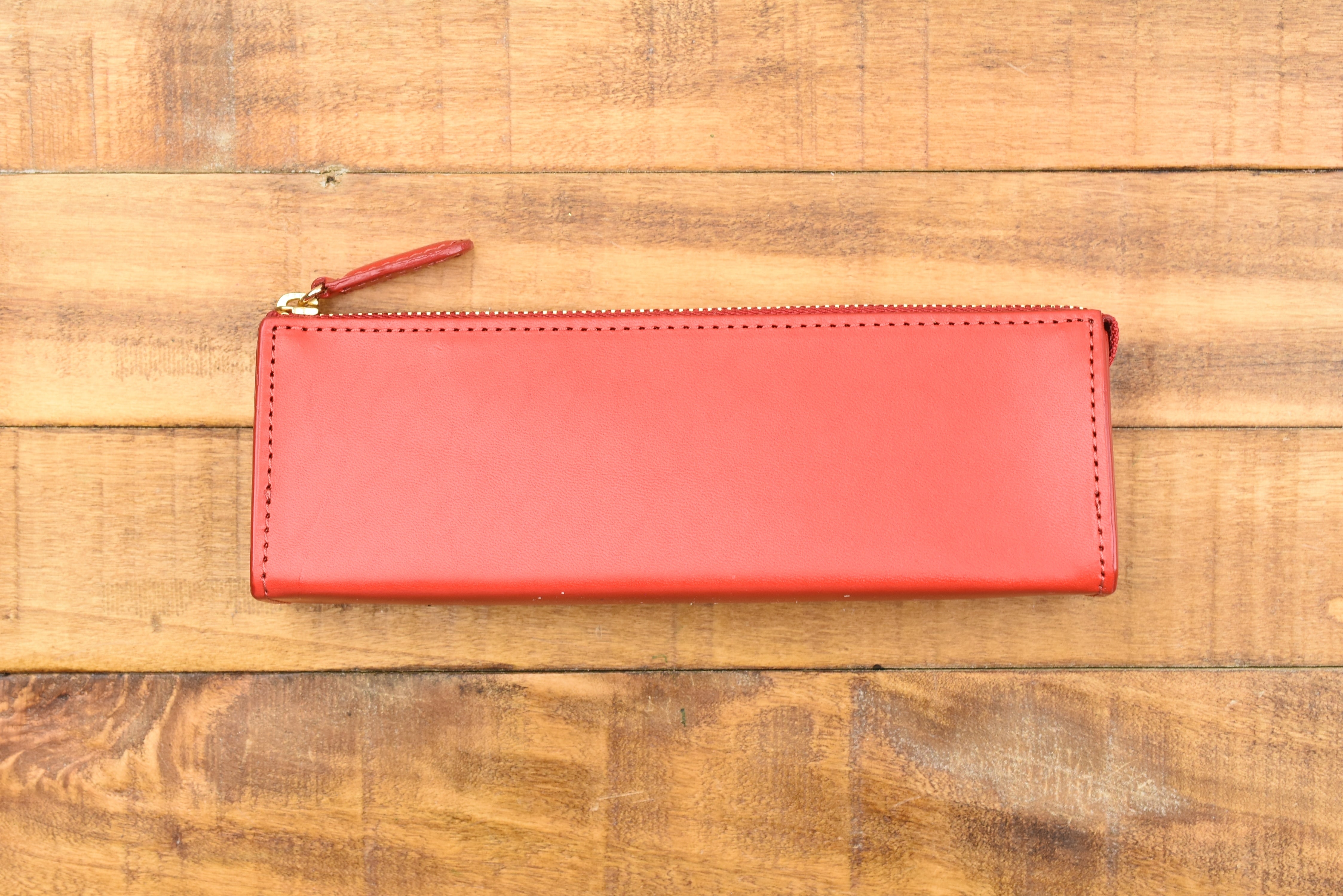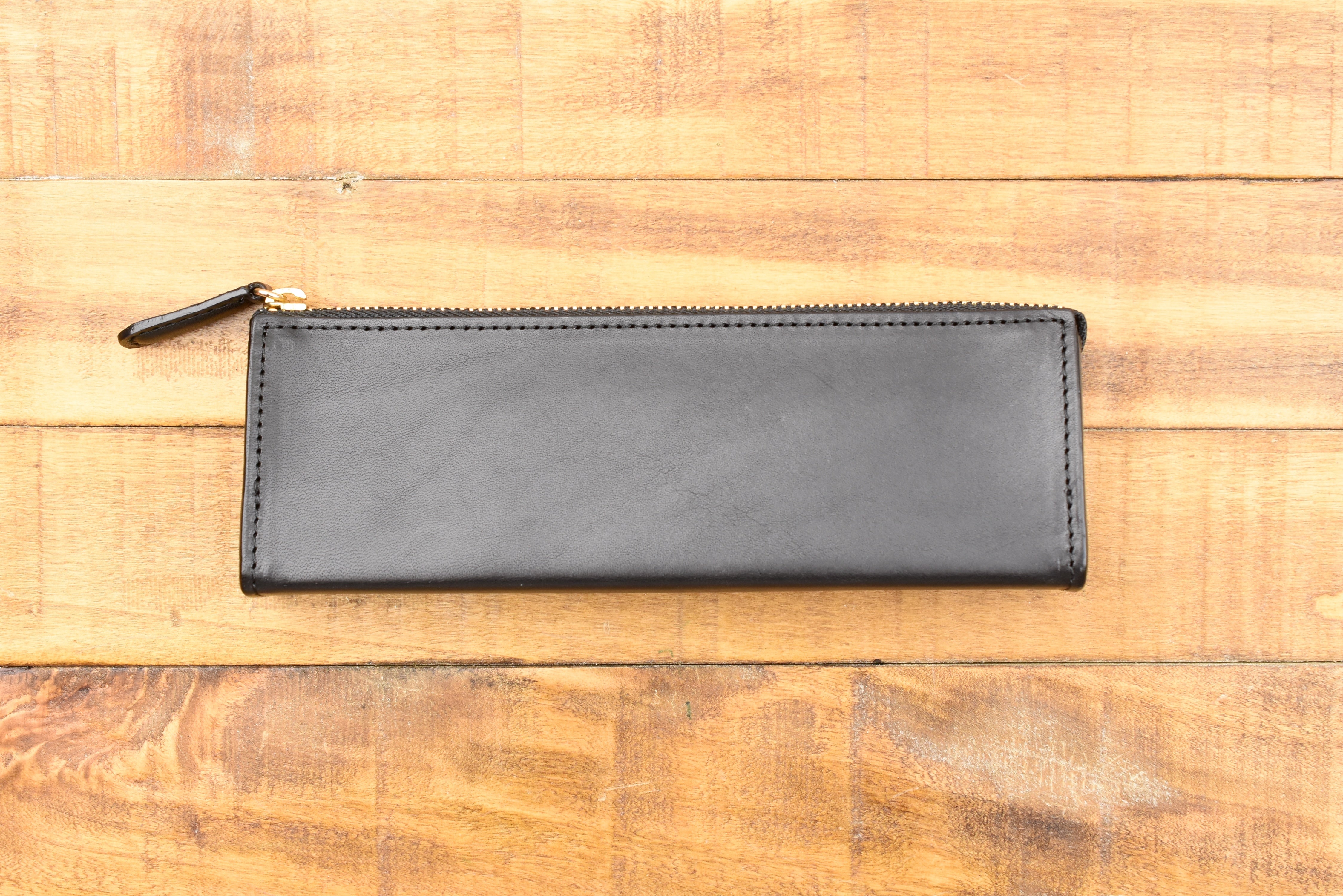 This pen pouch is made of a beautiful stiff and fragrant leather, which allows it to hold its compact and elegant triangular shape whether it is holding just one pen or packed to its capacity. The zipper glides across the top as you zip to open and close the pouch. It is a straightforward pouch with simple but classic details.