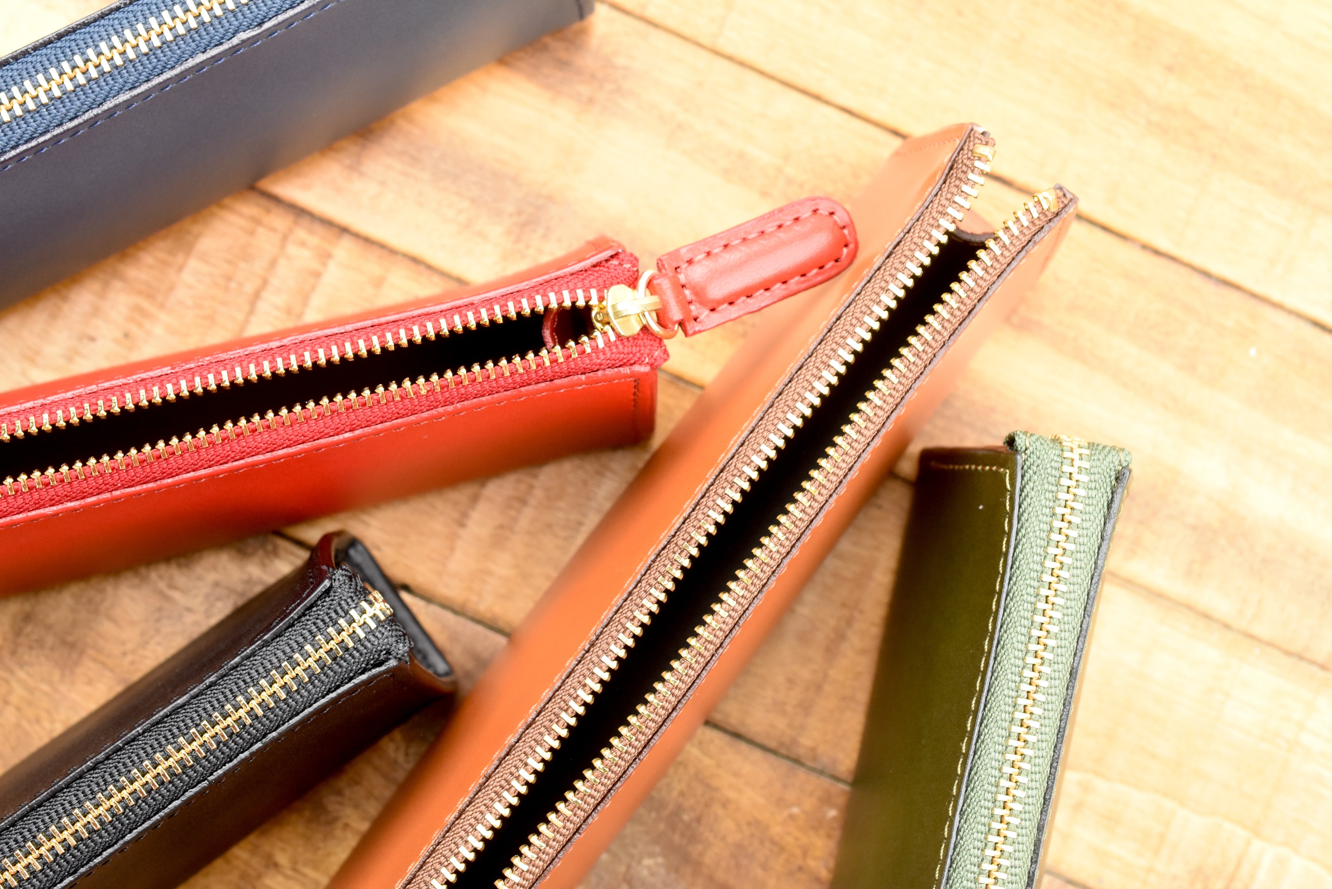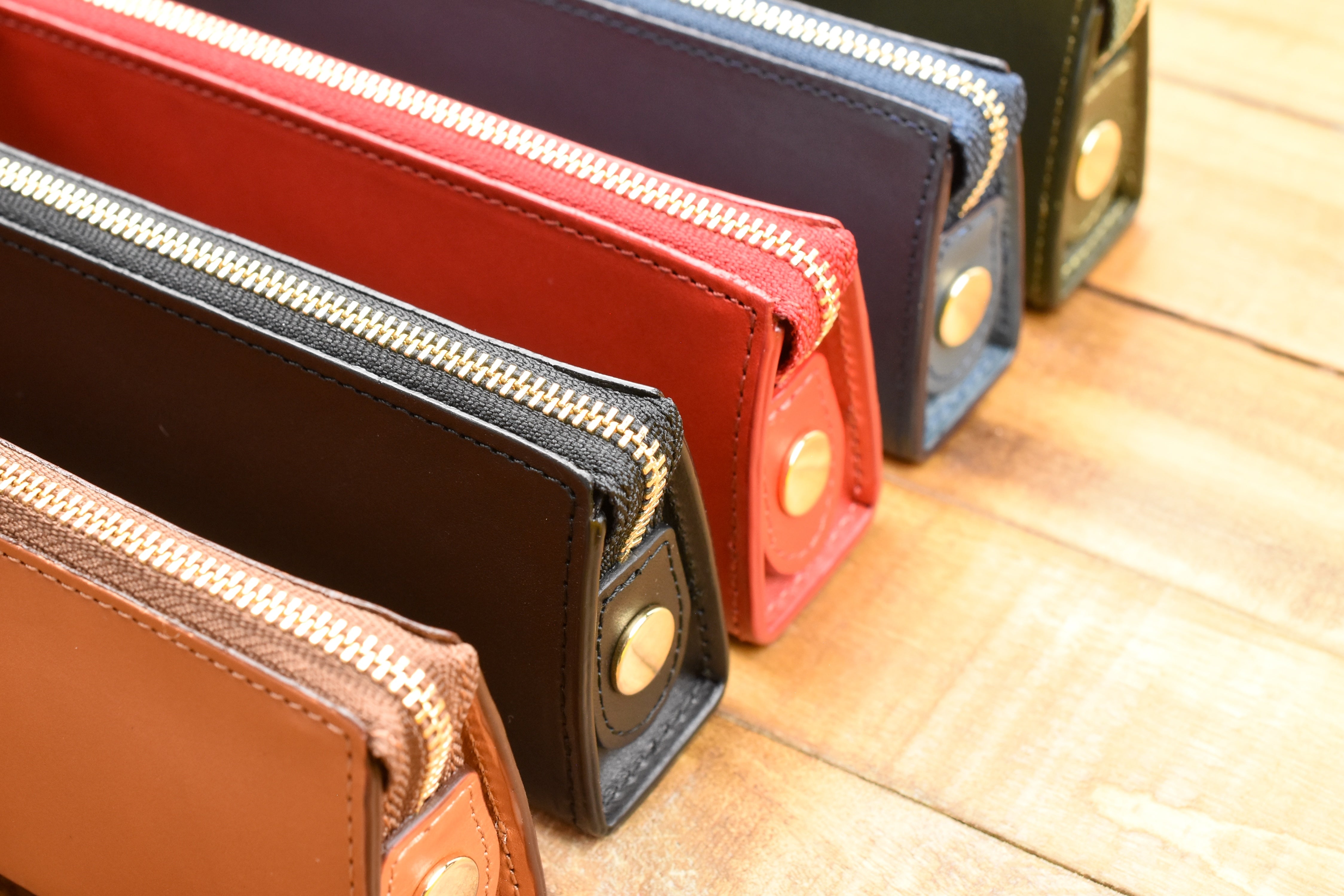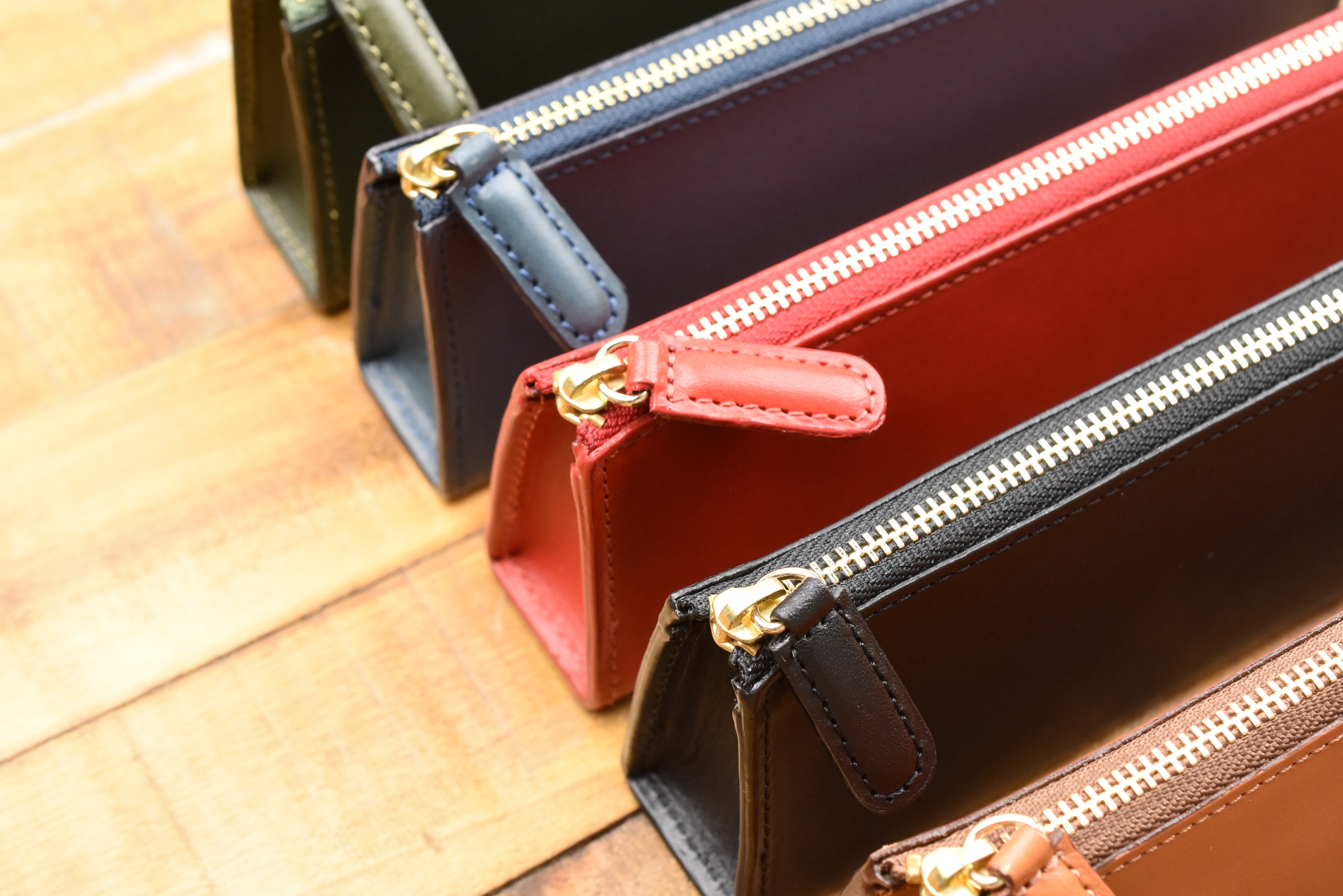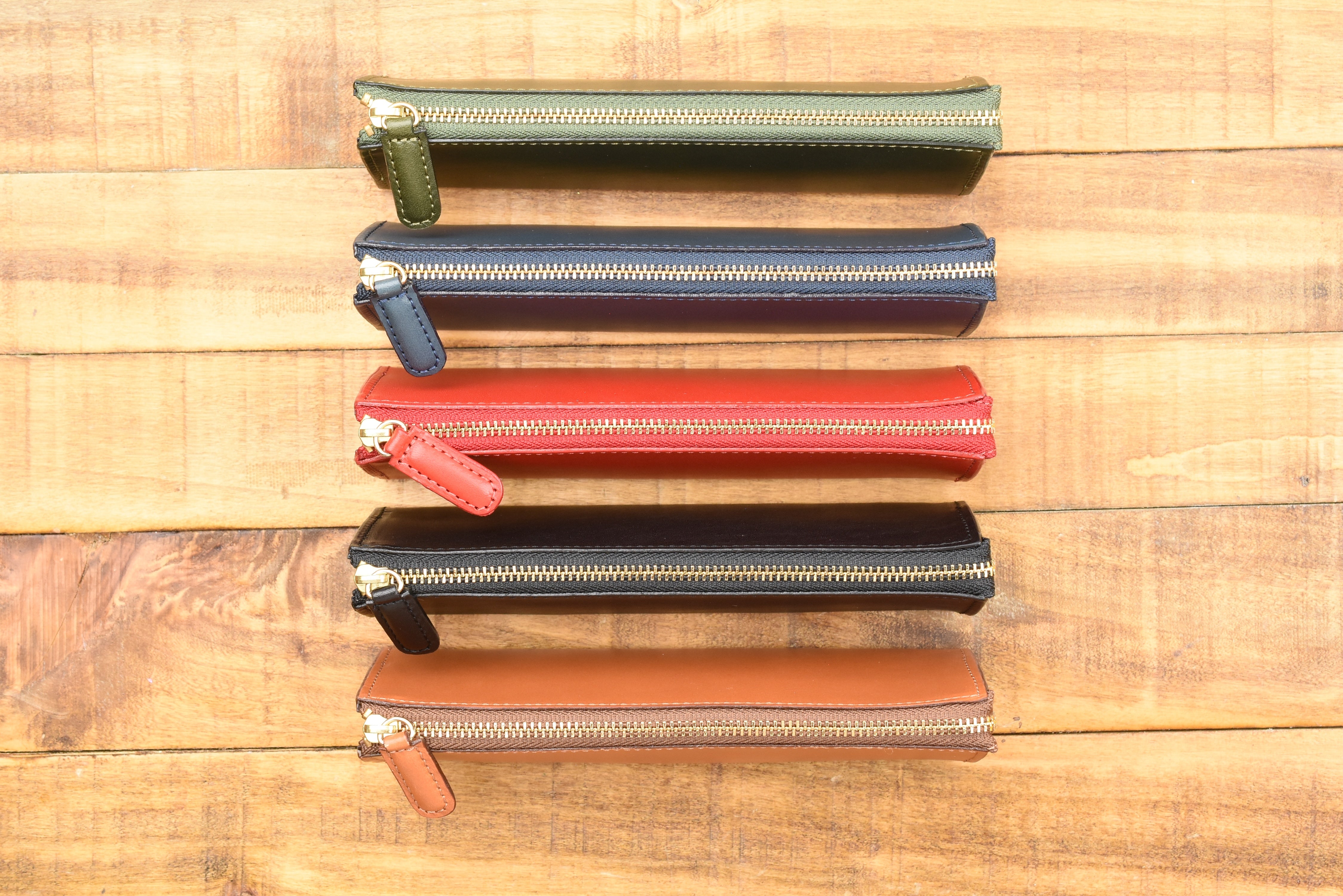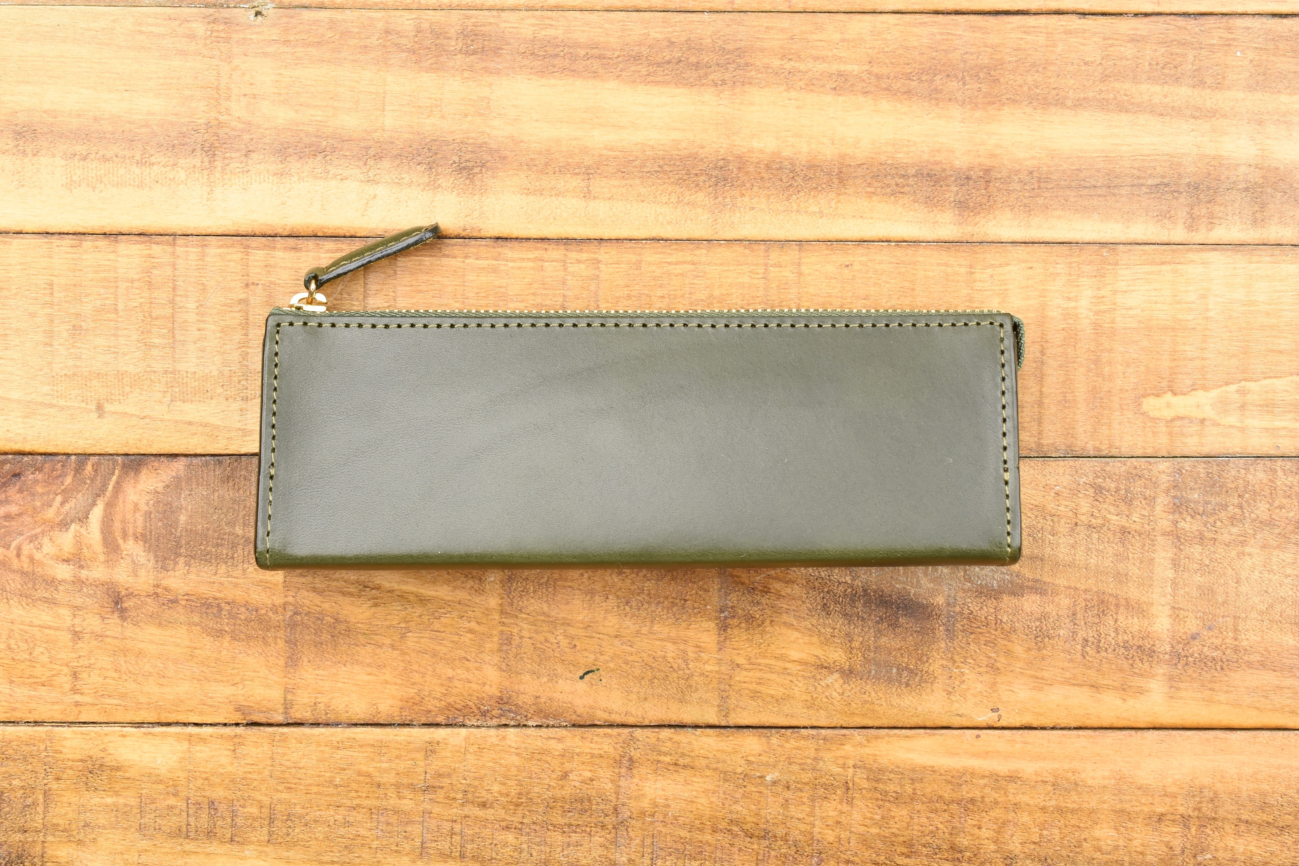 This pen pouch is made of a beautiful stiff and fragrant leather, which allows it to hold its compact and elegant triangular shape whether it is holding just one pen or packed to its capacity. The zipper glides across the top as you zip to open and close the pouch. It is a straightforward pouch with simple but classic details.
