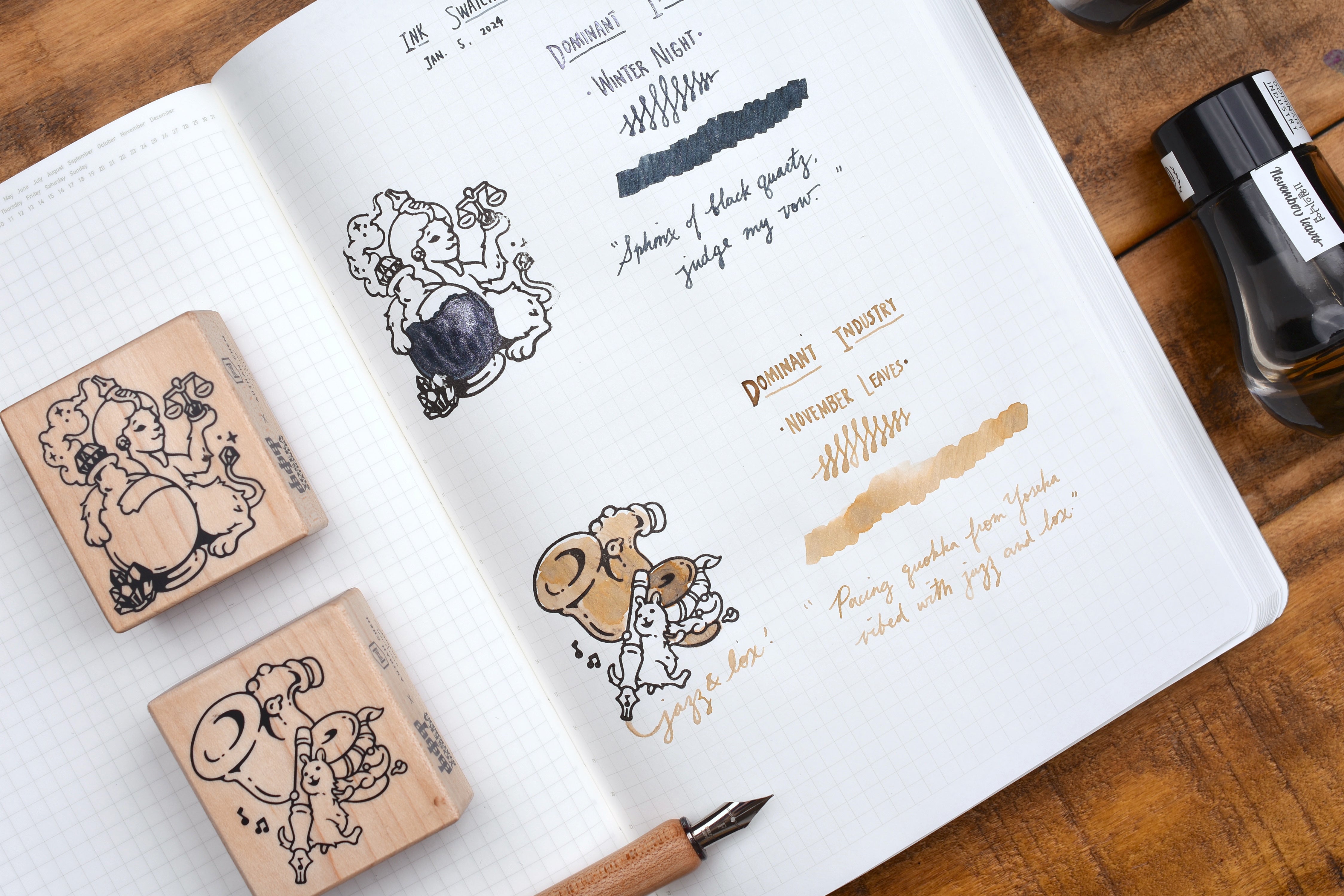 "Pacing quokka from Yoseka vibed with jazz and lox" is a brand new pangram (a short phrase that contains all 26 letters of the English alphabet) created to perfectly match with the Yoseka Stationery Zoo concept and a touch of some NYC vibes. You'll see the world's merriest animal walking around with its music nib fountain pen, accompanied by a saxophone-shaped ink bottle and a lox bagel that will remind you of New York City. This rubber stamp can be used with an oil-based ink pad, wait until the imprint fully dries, and you can swatch your ink colors inside the saxophone. This design will add a fun touch next to your Quick Brown Fox and Lazy Dog ink swatches too!