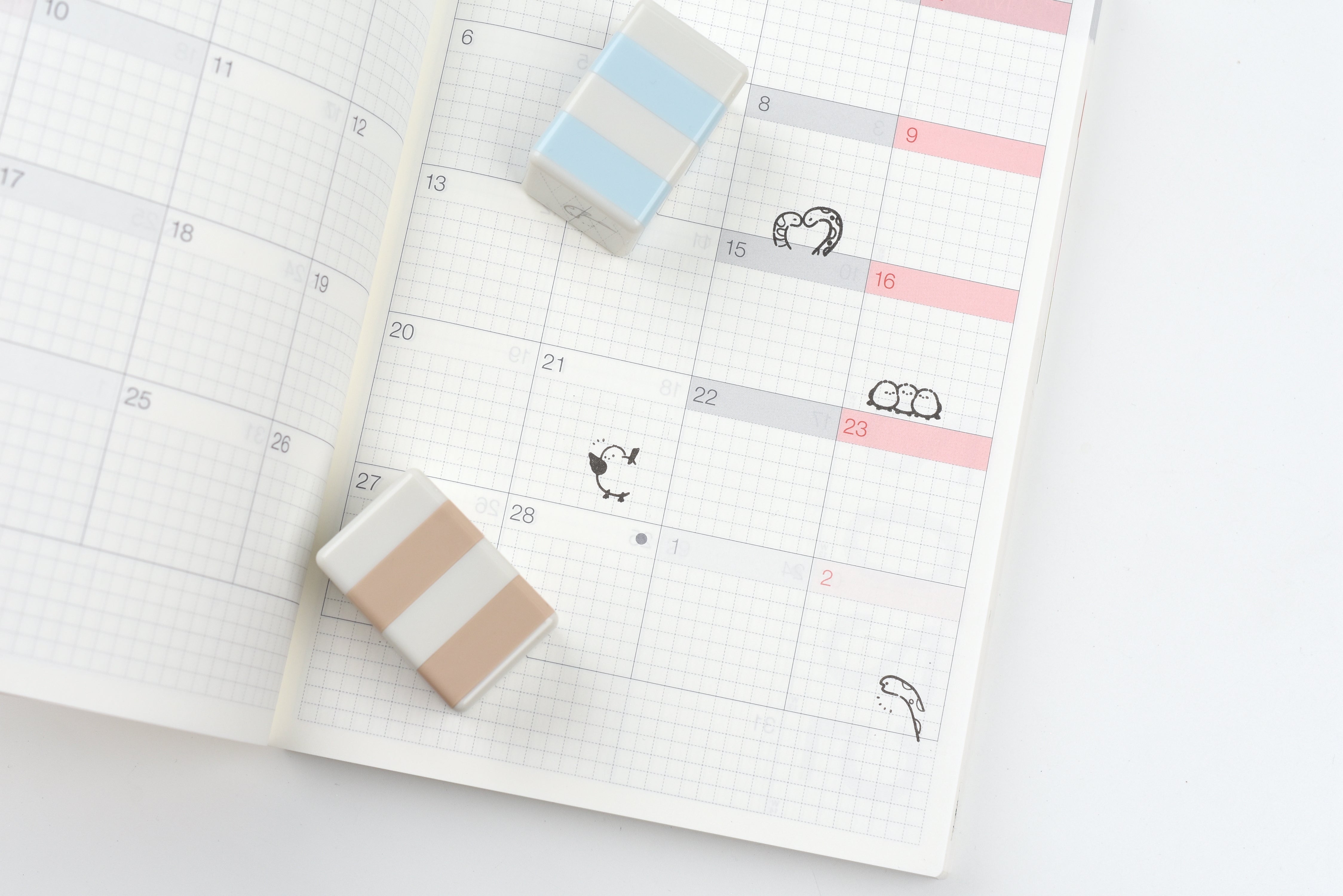 This stamp set features 3 different animal poses that peek out of any page in your journal! It also comes with very useful guidelines to line up your stamp for the perfect press. This stamp is oil-permeable, so painting or drawing on top of the stamp won't be a problem. The second volume of this stacking stamp features an alternating pastel body color, as well as 6 new animal designs: Squirrel, Penguin, Seal, Shimaenaga (Long Tailed Tit), Axolotl, and Striped Garden Eel
