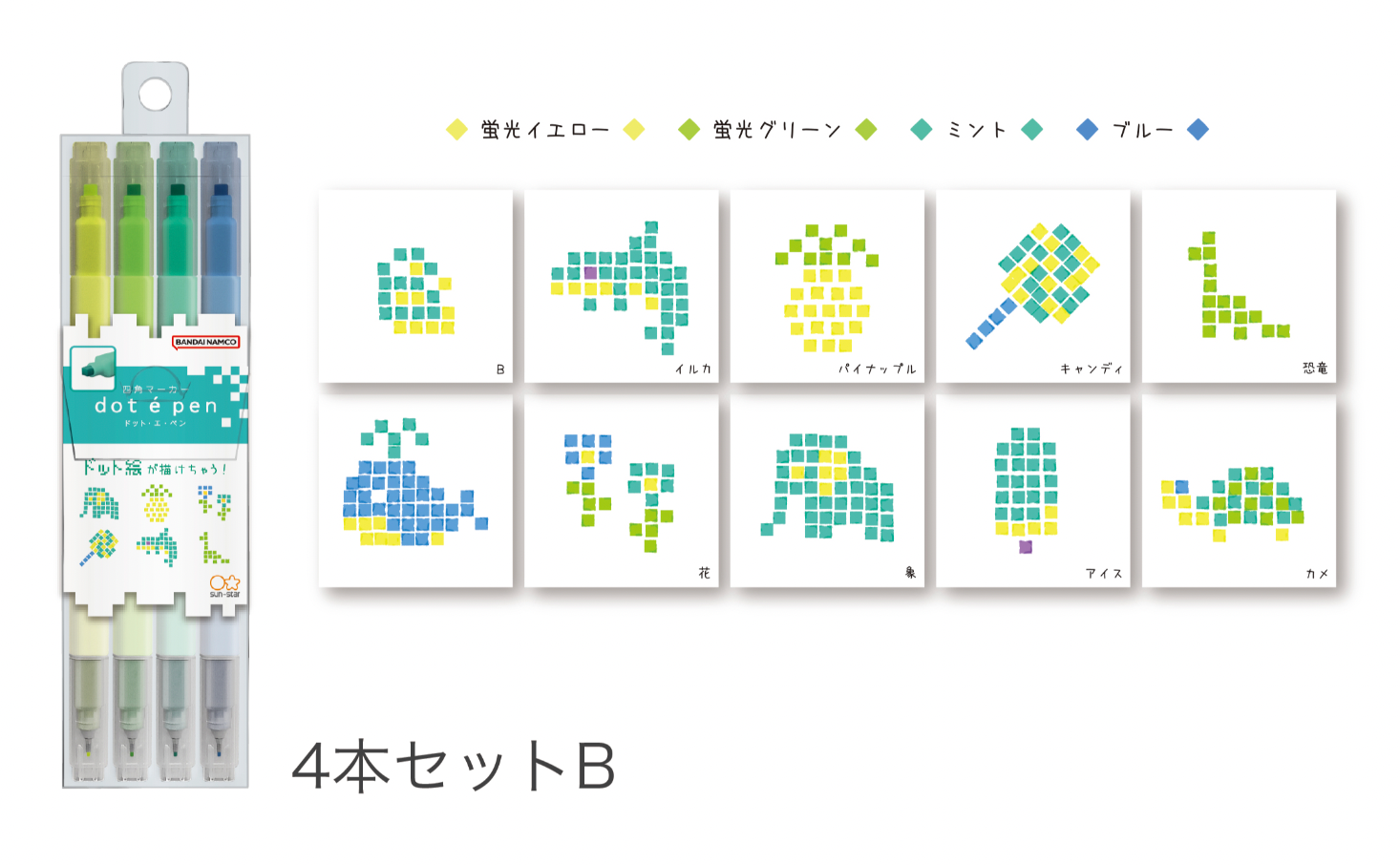 - Set B: Fluorescent Yellow, Fluorescent Green, Mint, Blue