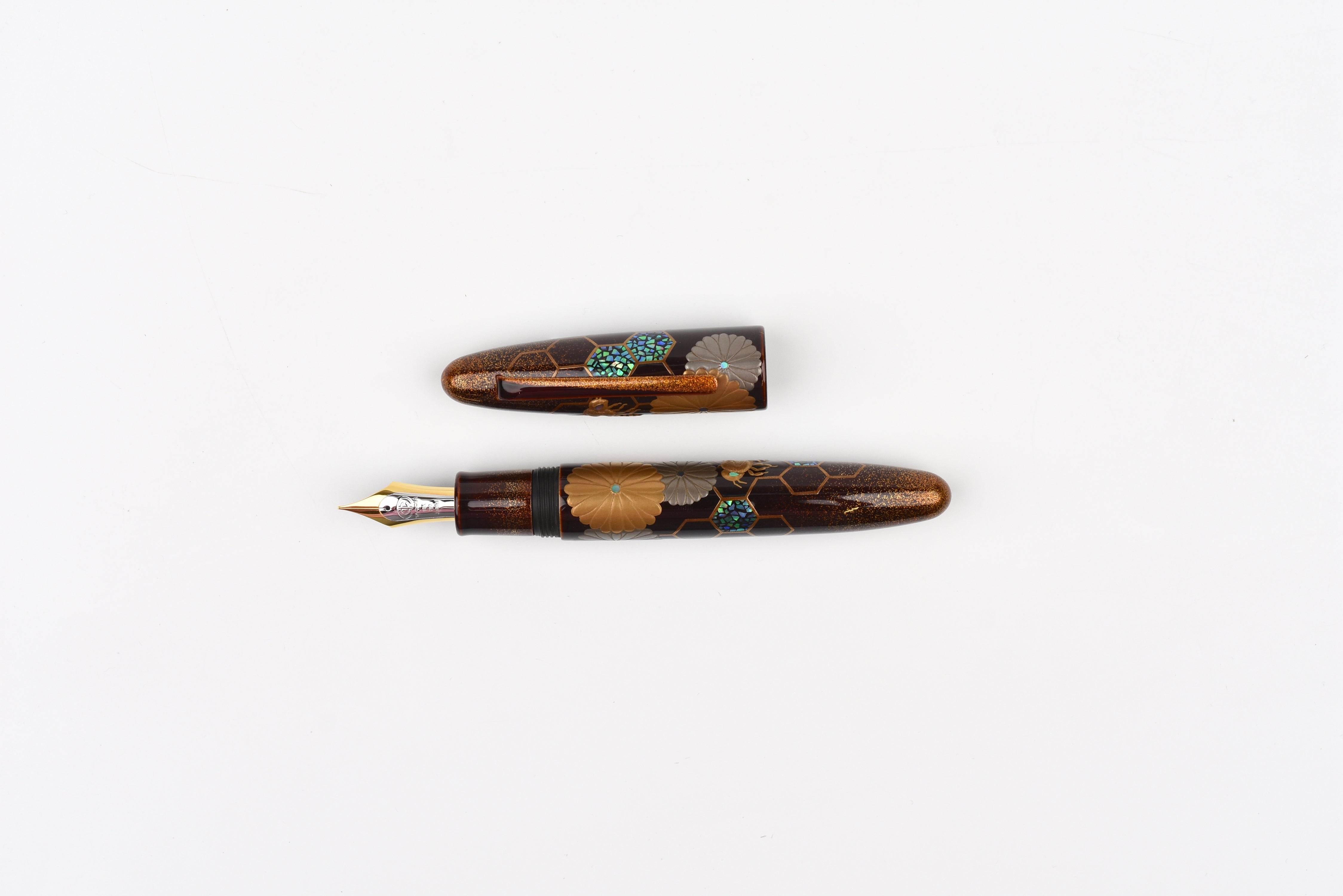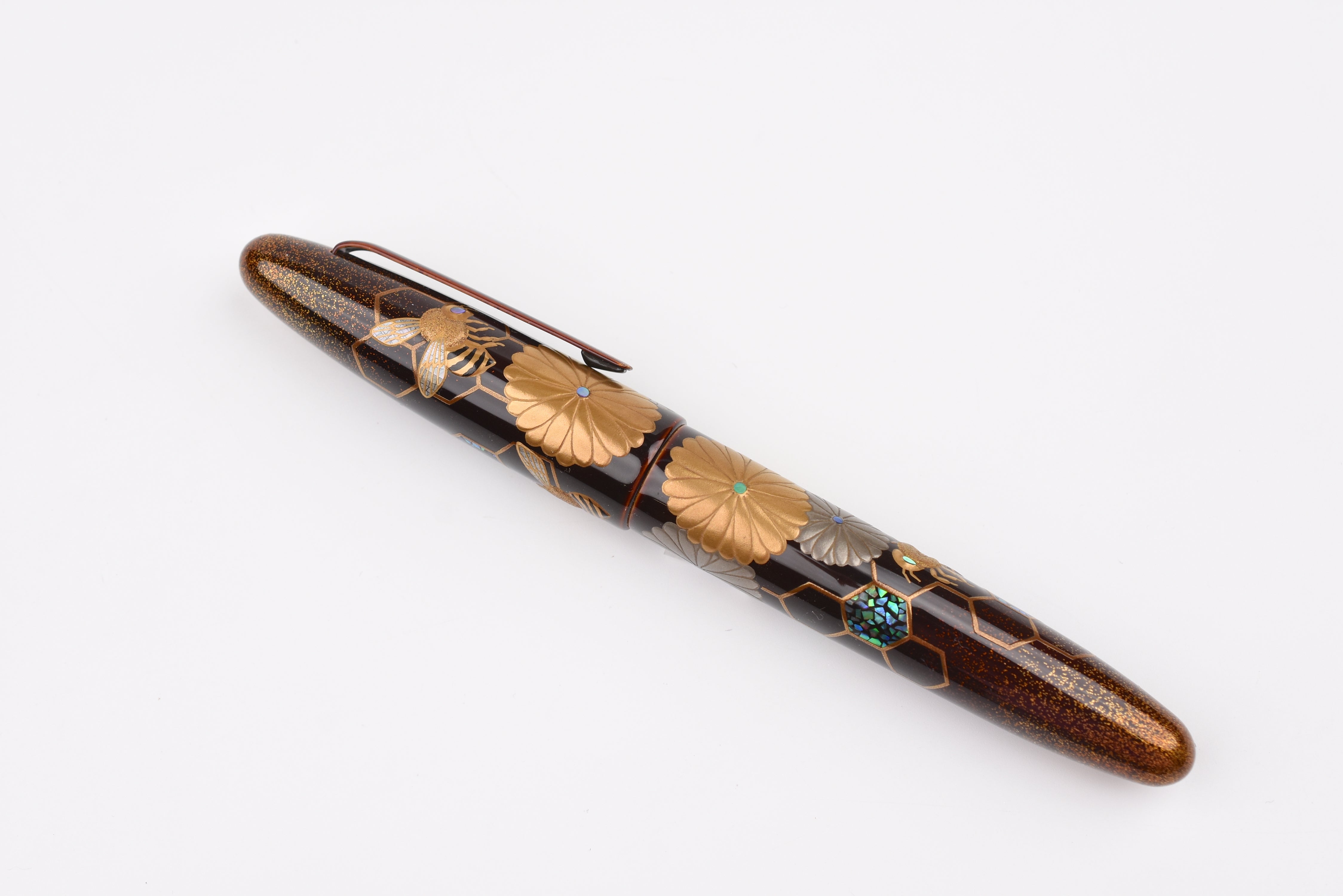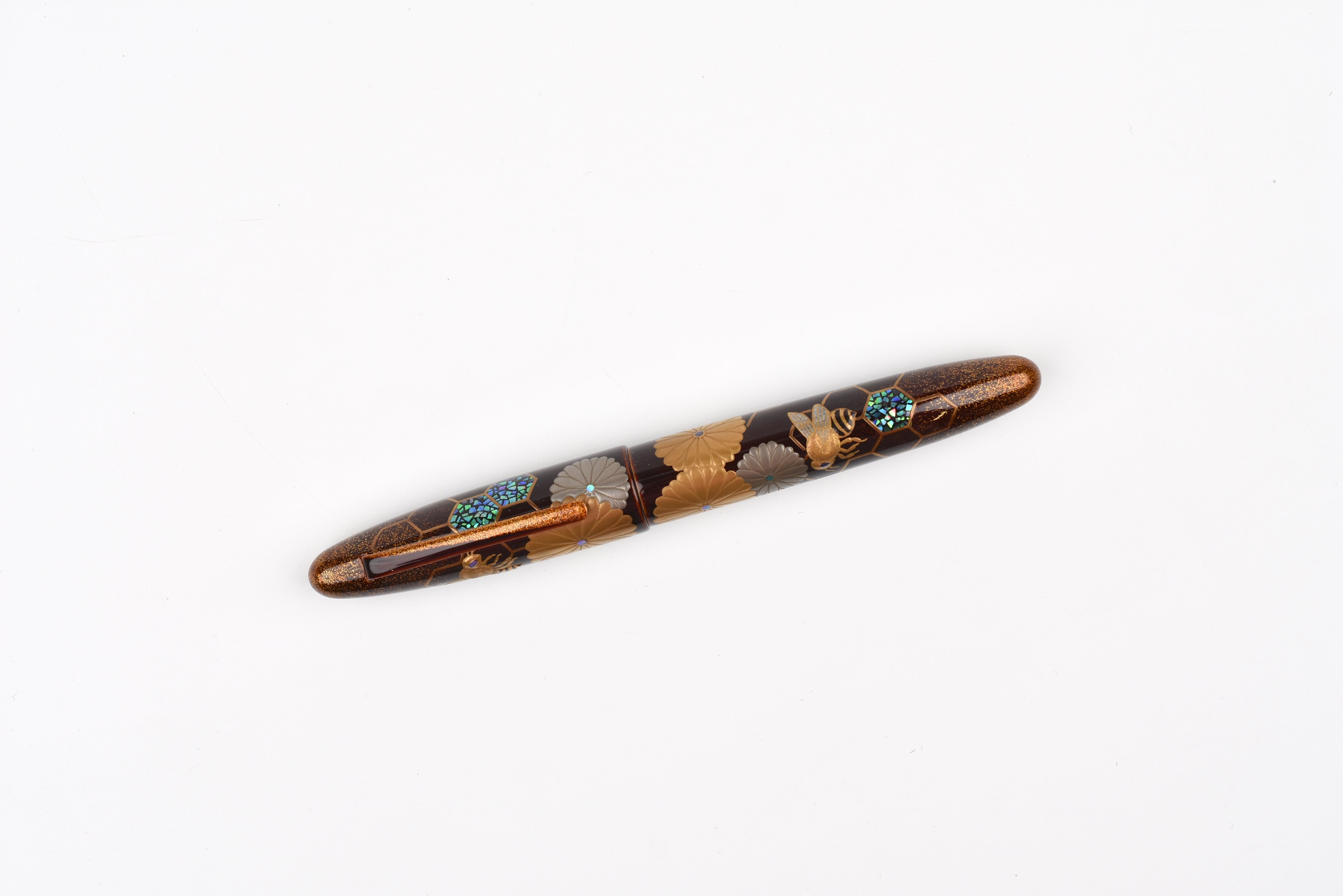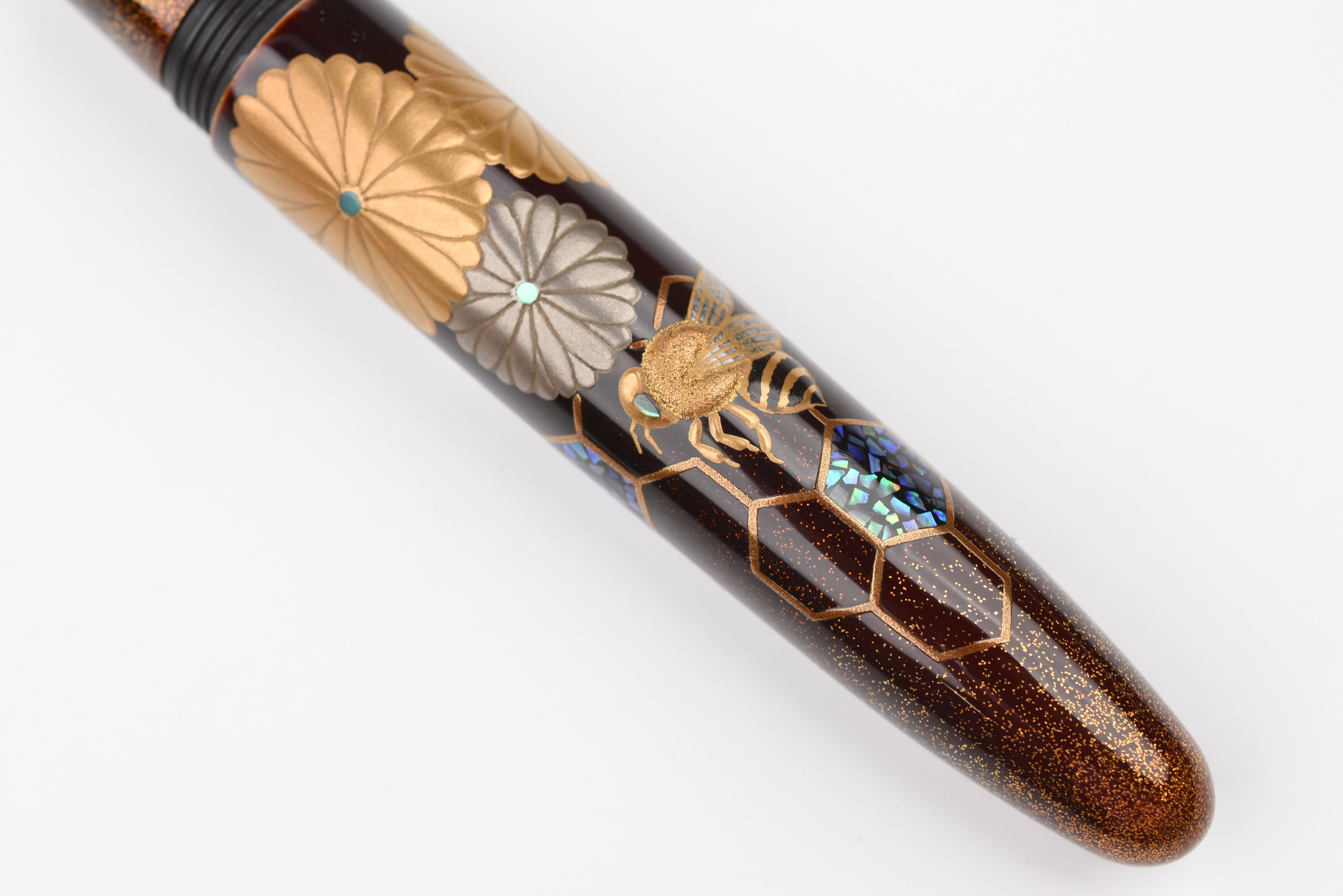 This fall as the chrysanthemum flowers start to bloom, the Empress Imperial Honeybee fountain pen features Taka Maki-e honeybees floating above the golden honeycombs, sparkling with Raden and Nashiji gold powder. The delicate way the honeybees' wings have been adorned from mother of pearl and the sparkle of Raden in their eyes is enchanting. In Japan, honeybees are a symbol of diligence, prosperity, and wealth, and the chrysanthemum flowers represent longevity and renewal.