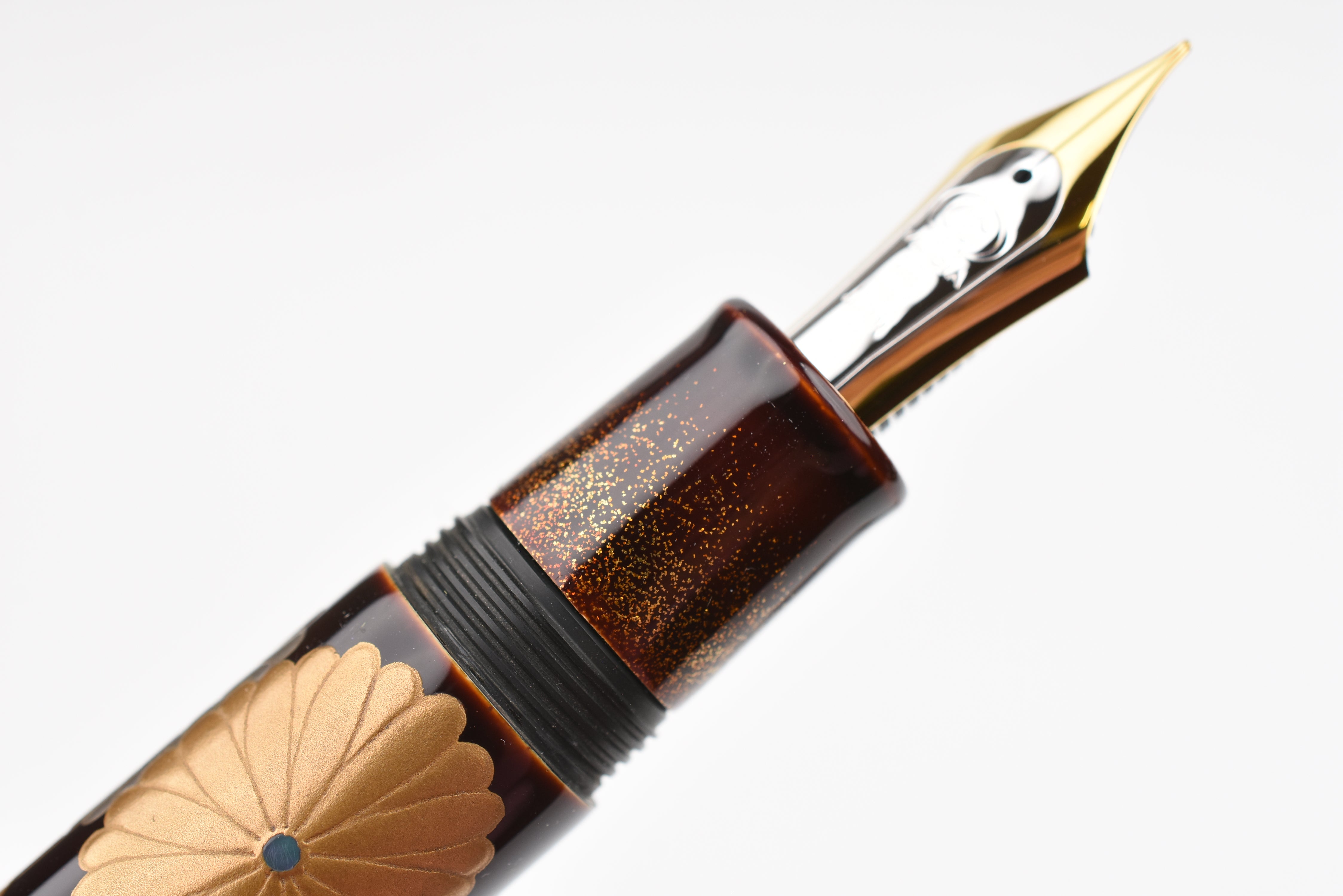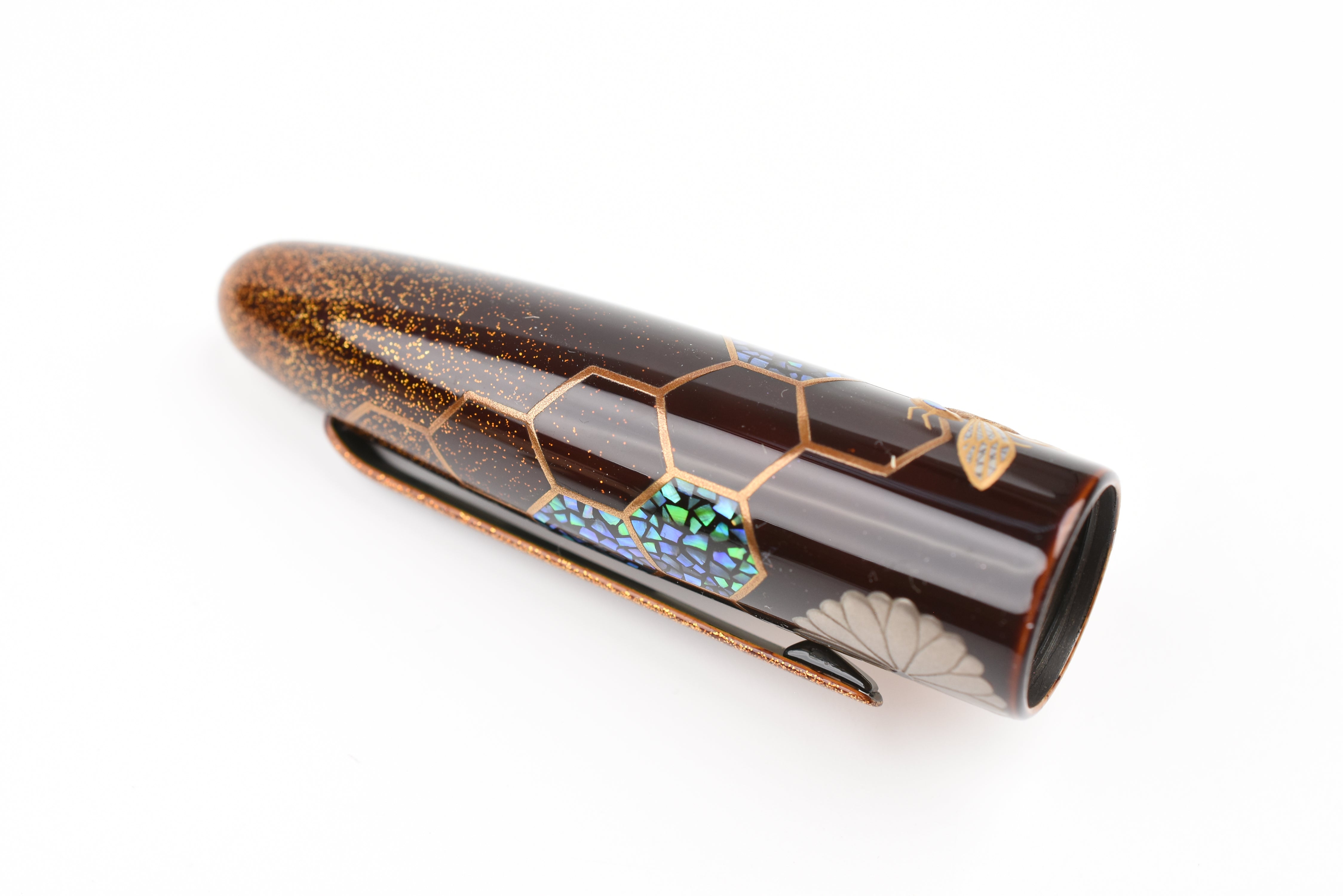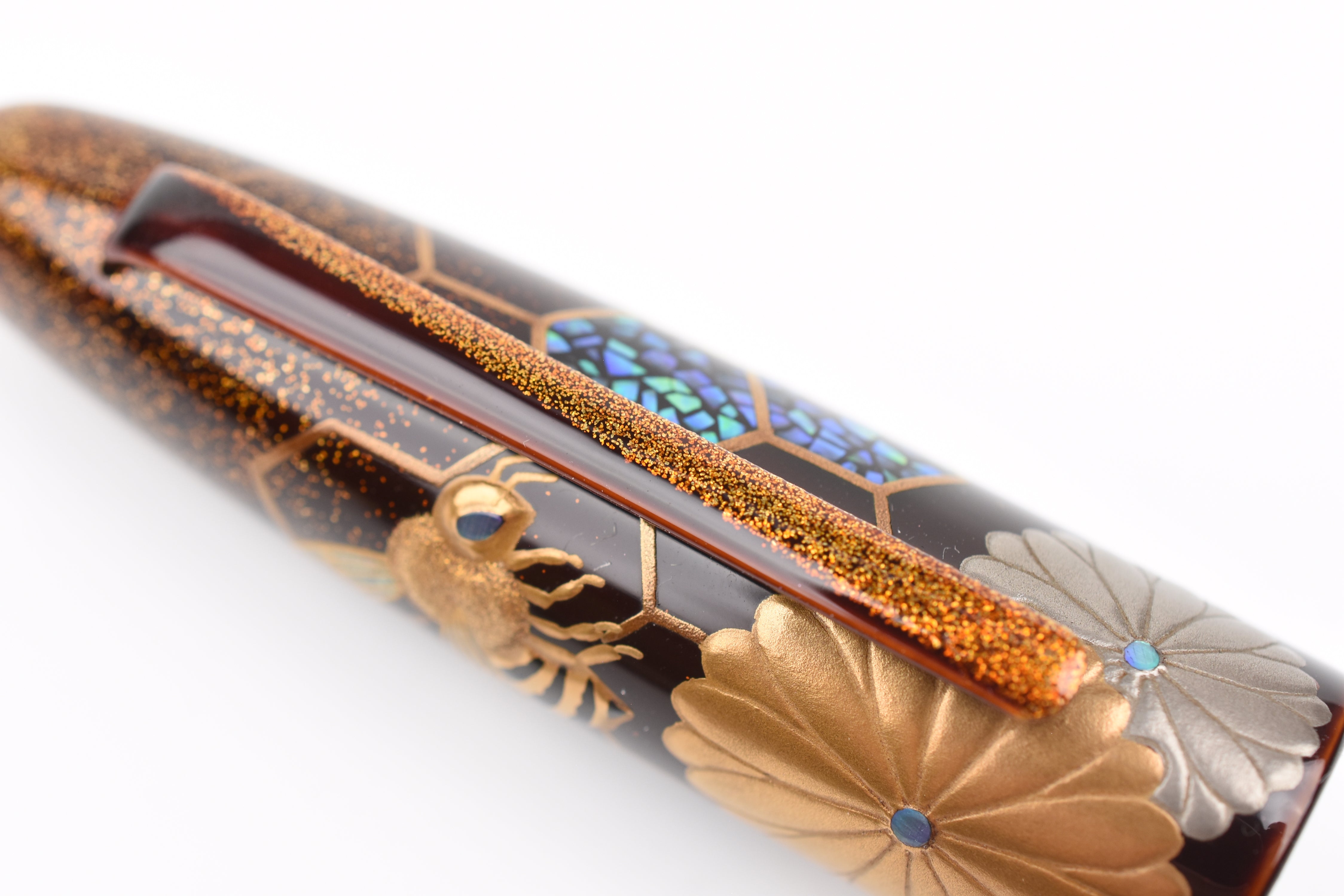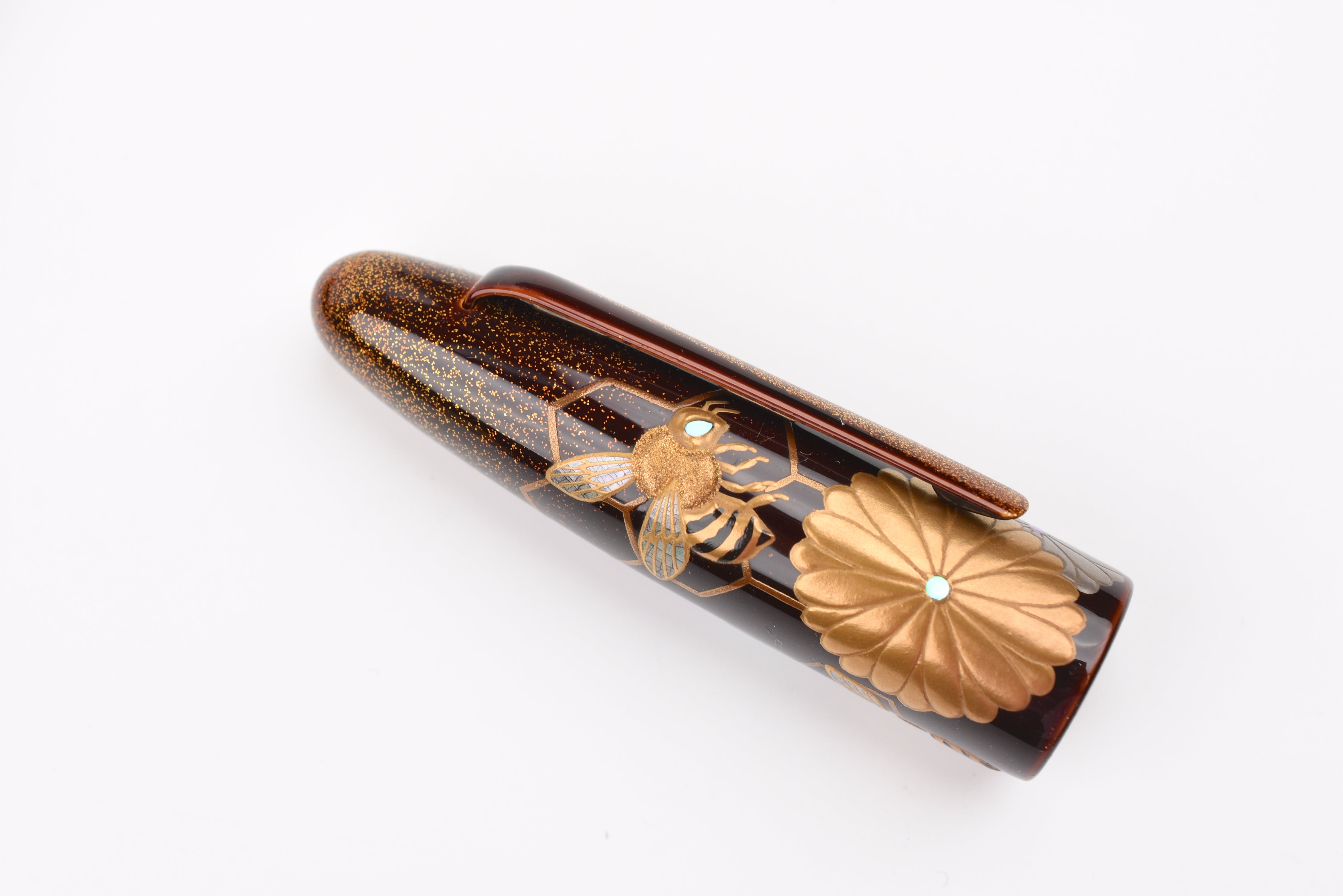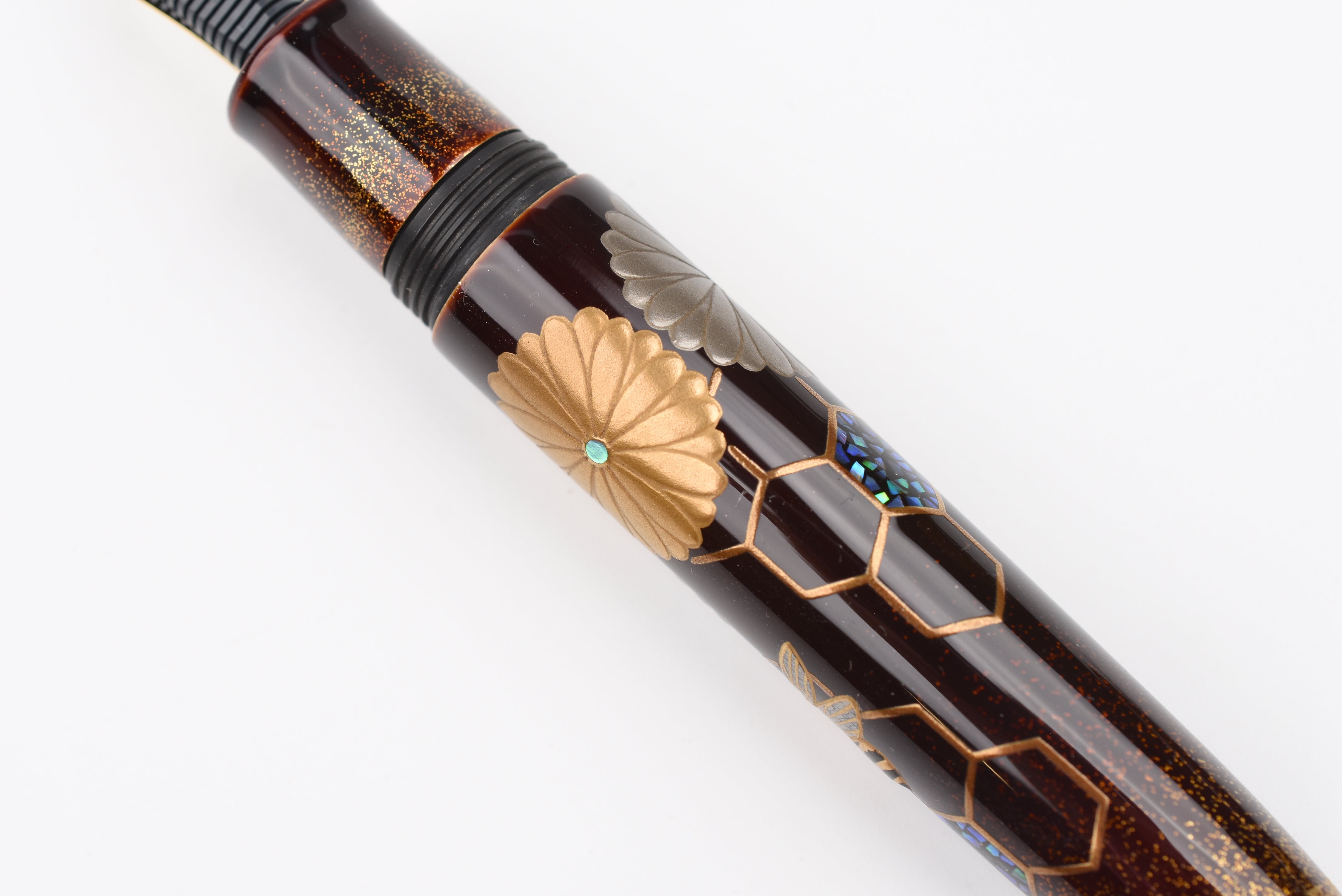 This fall as the chrysanthemum flowers start to bloom, the Empress Imperial Honeybee fountain pen features Taka Maki-e honeybees floating above the golden honeycombs, sparkling with Raden and Nashiji gold powder. The delicate way the honeybees' wings have been adorned from mother of pearl and the sparkle of Raden in their eyes is enchanting. In Japan, honeybees are a symbol of diligence, prosperity, and wealth, and the chrysanthemum flowers represent longevity and renewal.