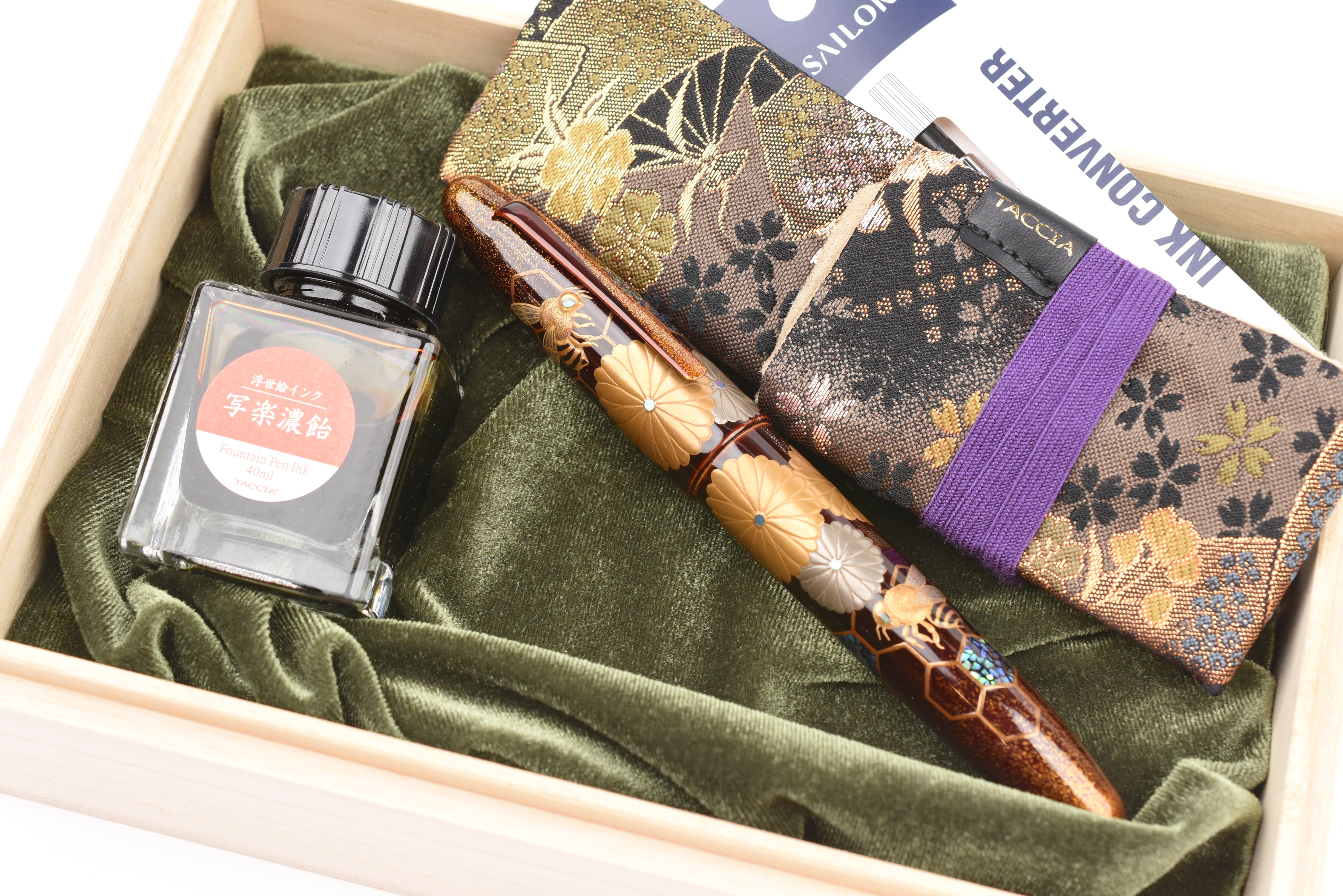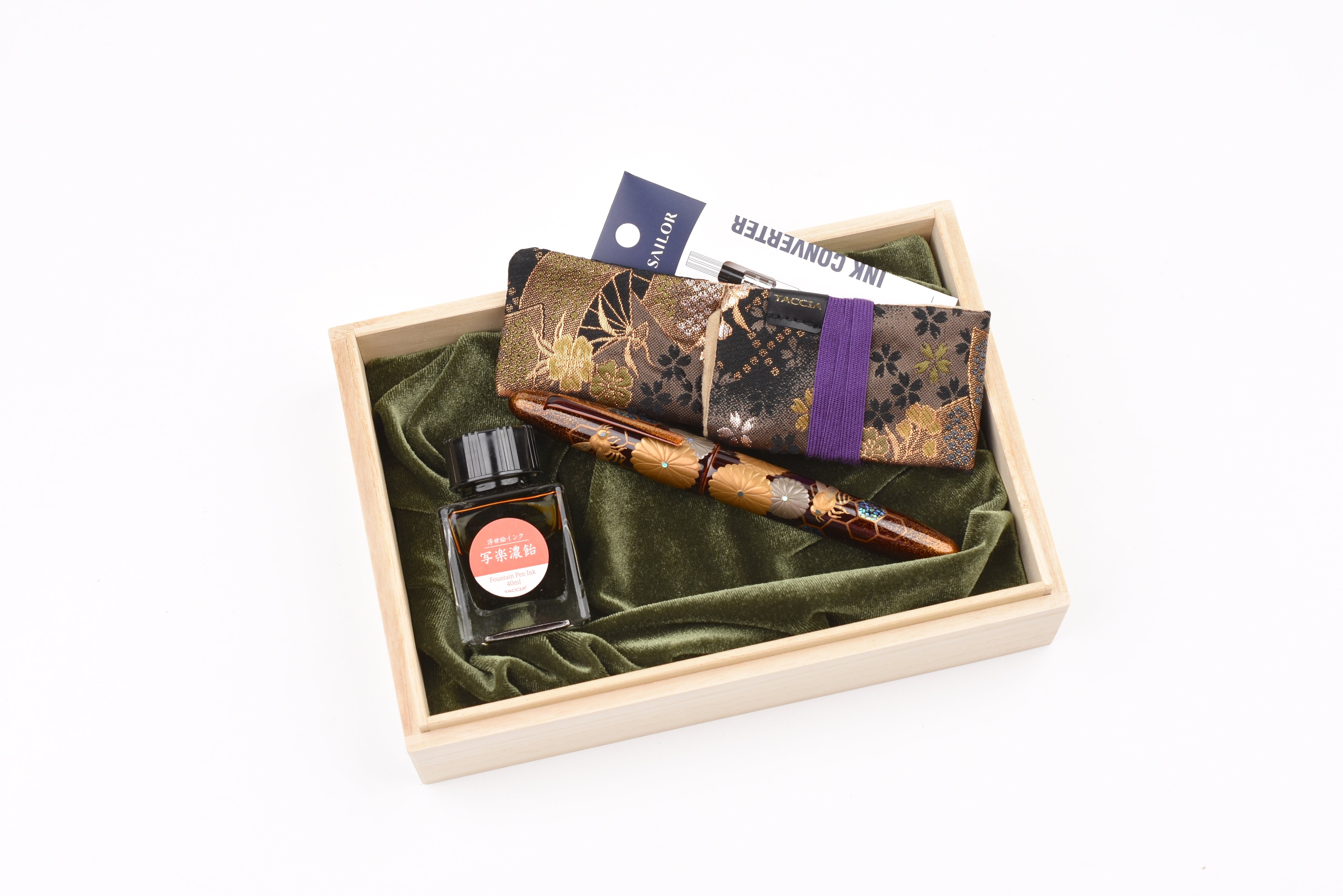 - Sailor converter, two ink cartridges, and a 40ml bottle of Taccia Ukiyo-e Koiame included