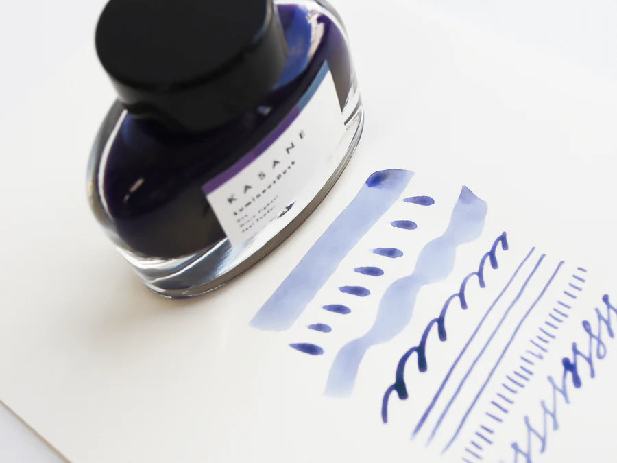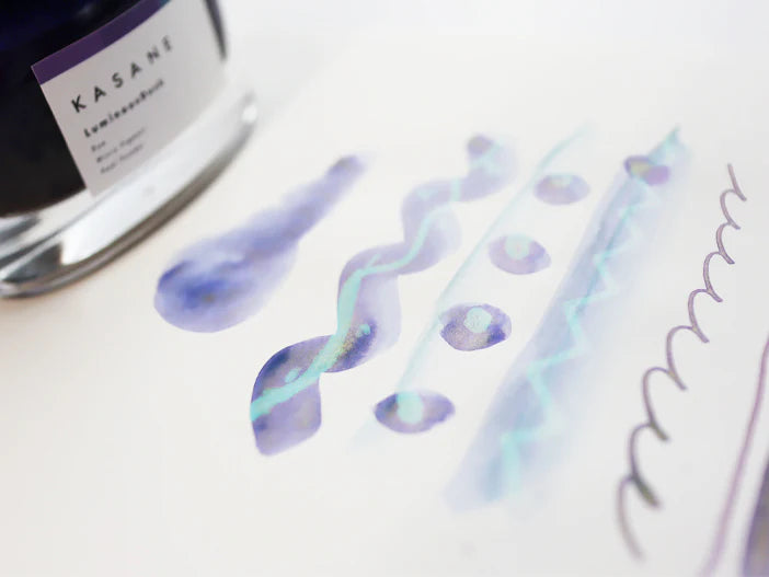 Luminous Dusk is part of the KASANE ink series, inspired by the overlapping colors of kimonos. The color changes from the moment you start writing to when it dries, and the pigments separate beautifully when blended with water, allowing for unique expression in writing or art. Infused with fine pigments and shimmering glitter, this ink adds depth and dimension to your work, inspiring creativity with every stroke.