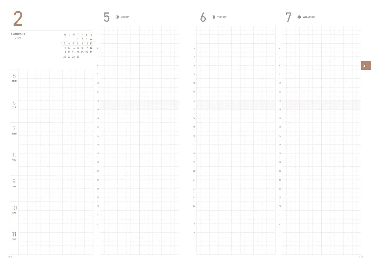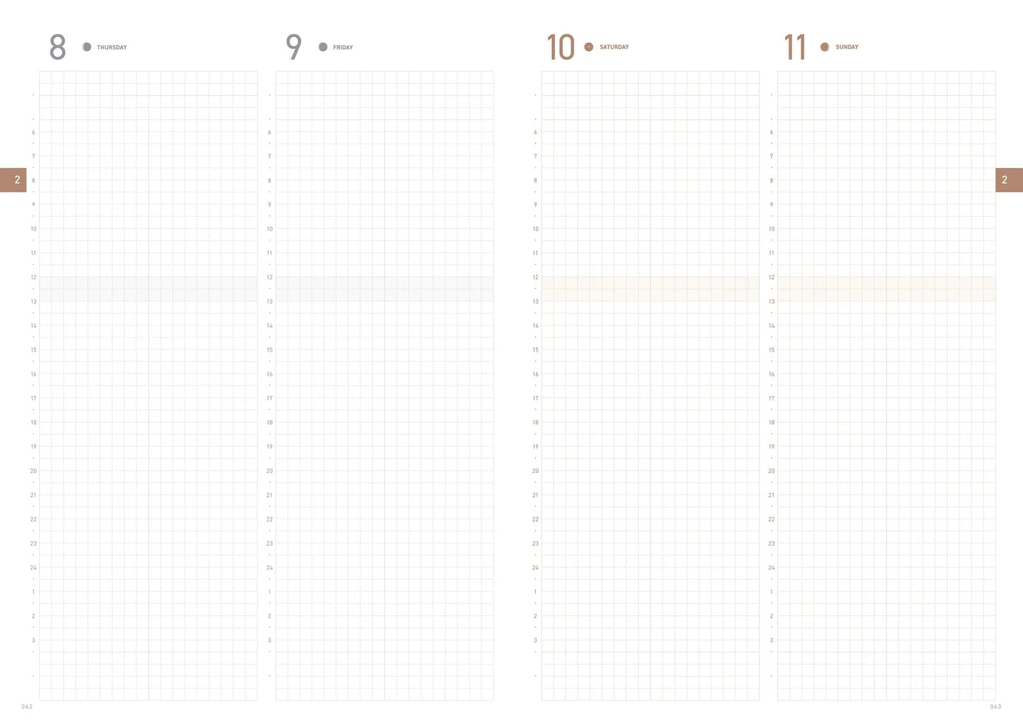While this planner comes with yearly, monthly, weekly and daily views, most of the pages of the planner fall into the "mini weekly calendar + two days per page vertical timeline" layout, which is an original feature of Take A Note. This layout allows you to view the week at a glance while also jotting down to-dos and events relevant to your specific day. Each day includes a 24 hour vertical timeline with blank grids at the top and bottom of the timeline; this section also includes features such as a mini weekly calendar and moon phases for each day.