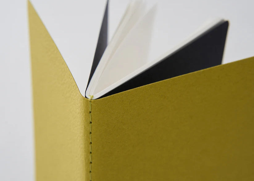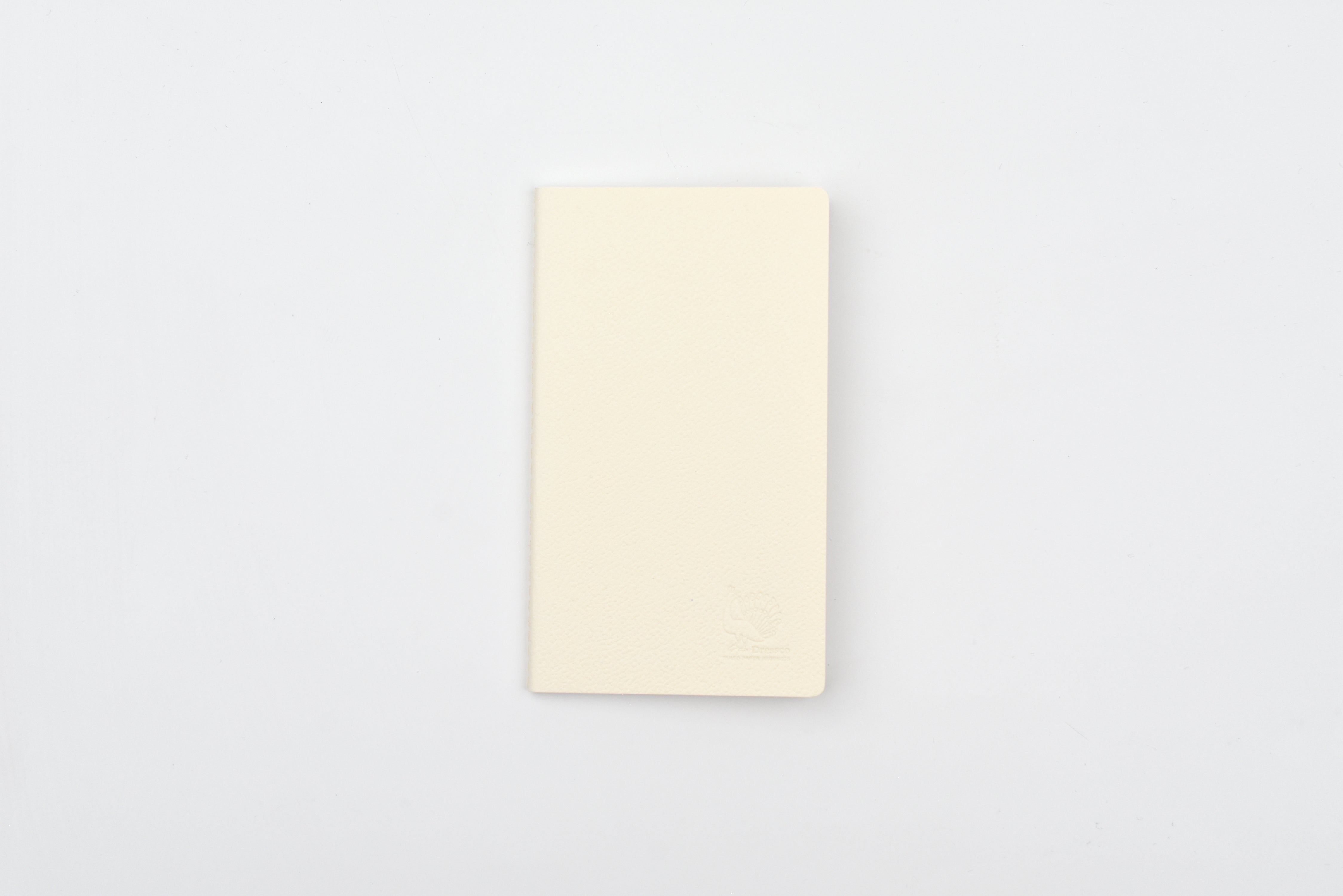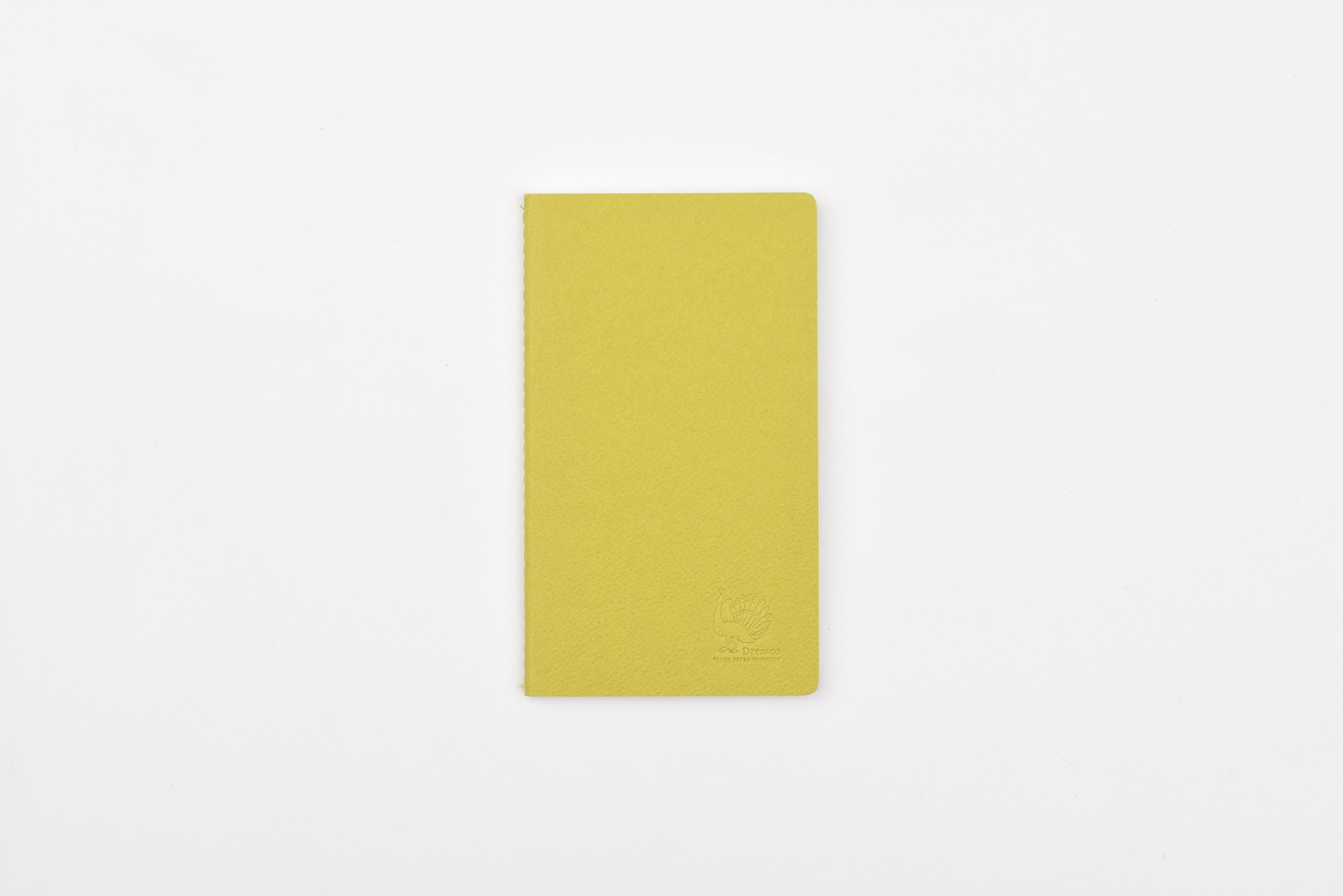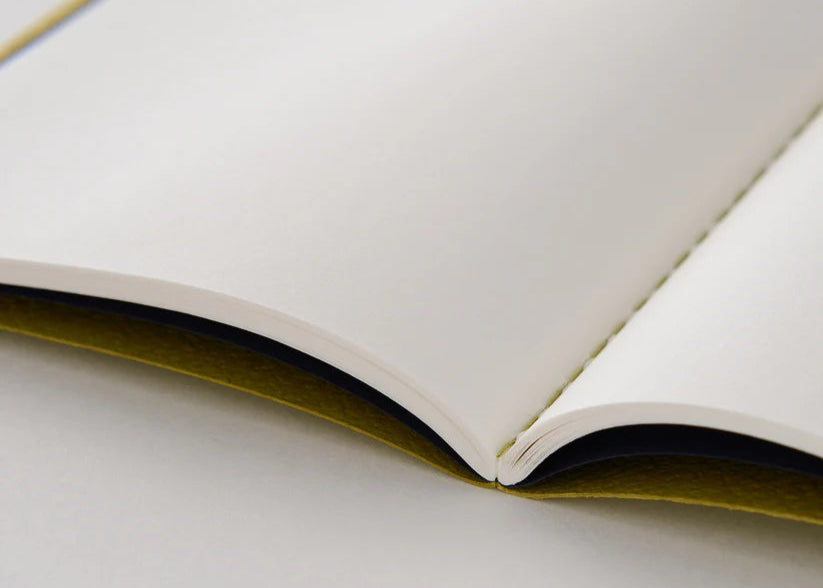 This machine-bound notebook is palm-sized and easy to carry. The main text is made of Spica Raid Bond stationery paper, a smooth, comfortable, and easy-to-write paper with a 25% cotton blend that gives it a soft, high-quality feel. The cover is made of Arezan-FS Avocado, a paper with a soft, leather-like texture that feels comfortable in the hand, while the endpapers are made of Biotope GA-FS Midnight Blue, a craft paper with a deep color and firm texture.