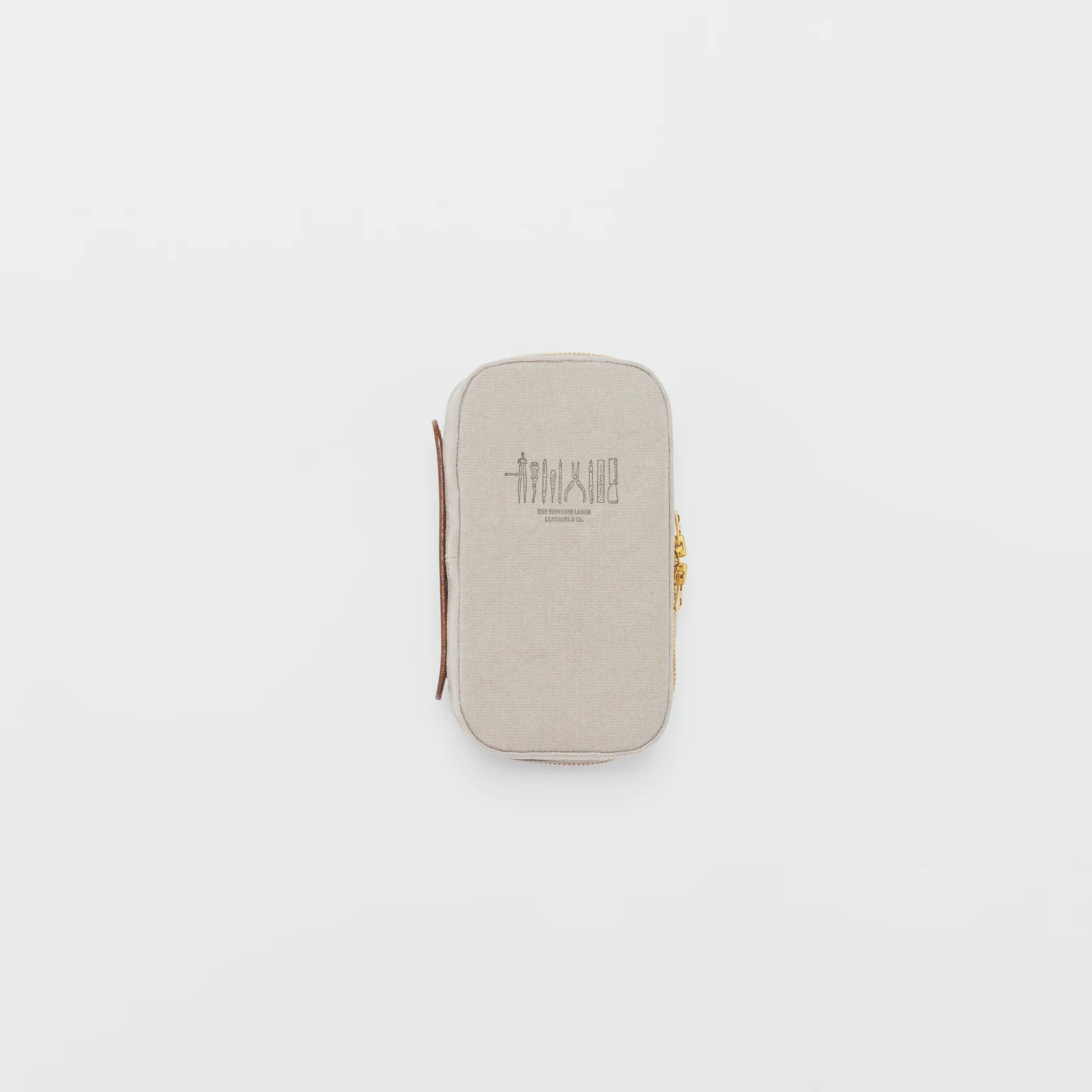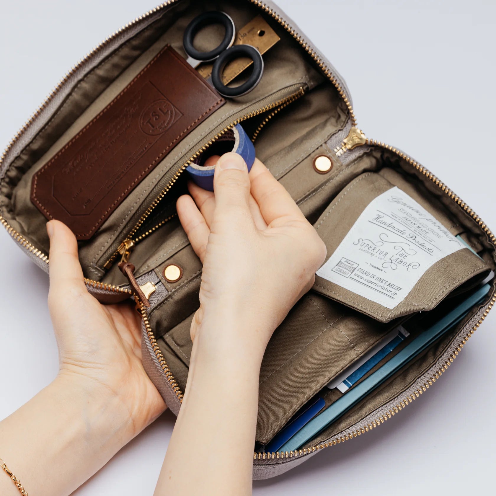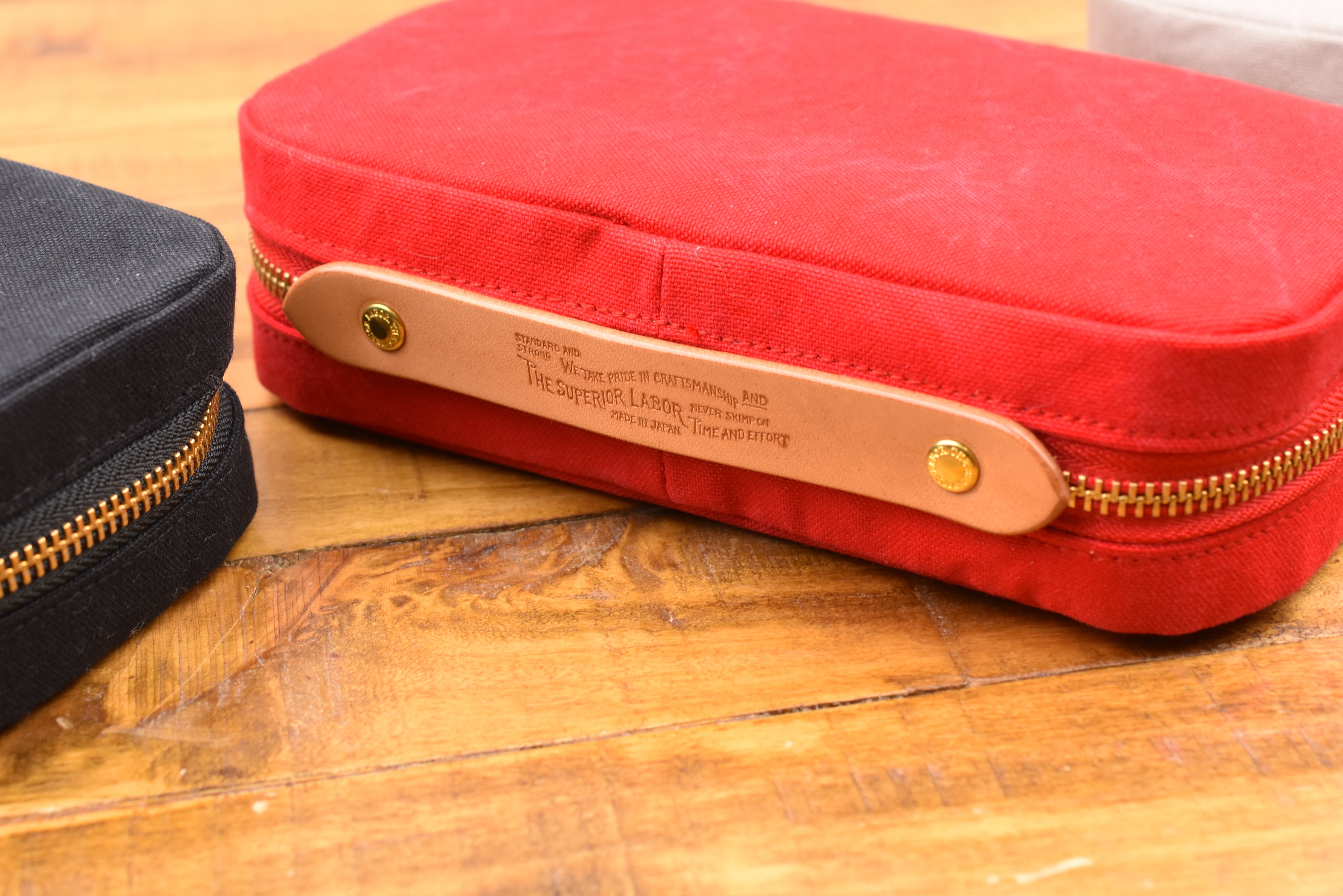 A Medium Canvas Mission Case handmade by Superior Labor. From passports and cards to stationery and tech accessories, this versatile canvas case keeps your essentials neatly organized and easy to carry. This season, it comes in a bold new red color with a stamped leather tool motif on the front for an eye-catching update. Made from high-density canvas produced in the USA, it’s dyed and washed in Japan to create a soft, broken-in feel with natural wrinkles and subtle tonal variations that add depth and character. The black version especially highlights these textures, making each case one of a kind. Lay it open to view everything at a glance, then zip it up for a reliable storage solution wherever you go.