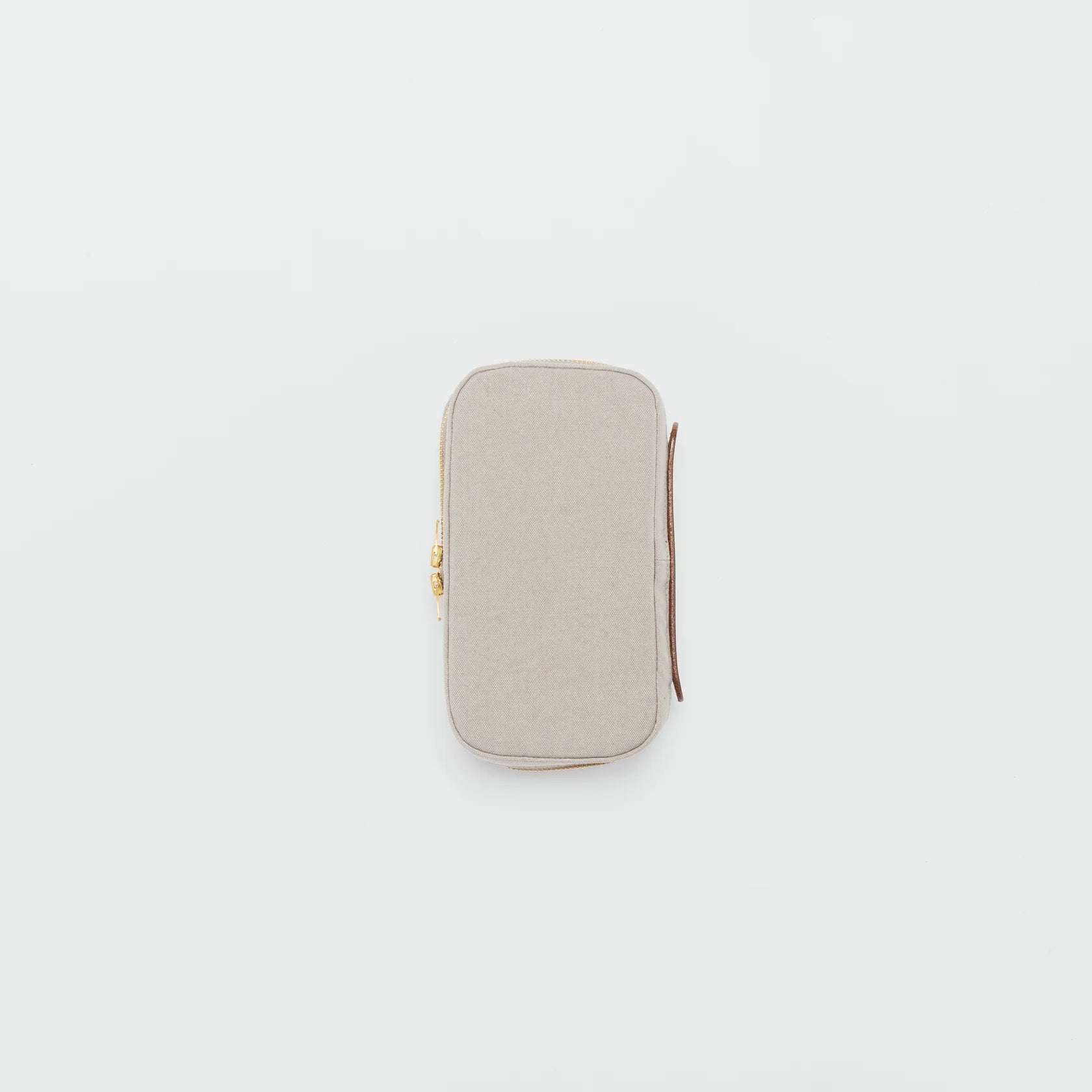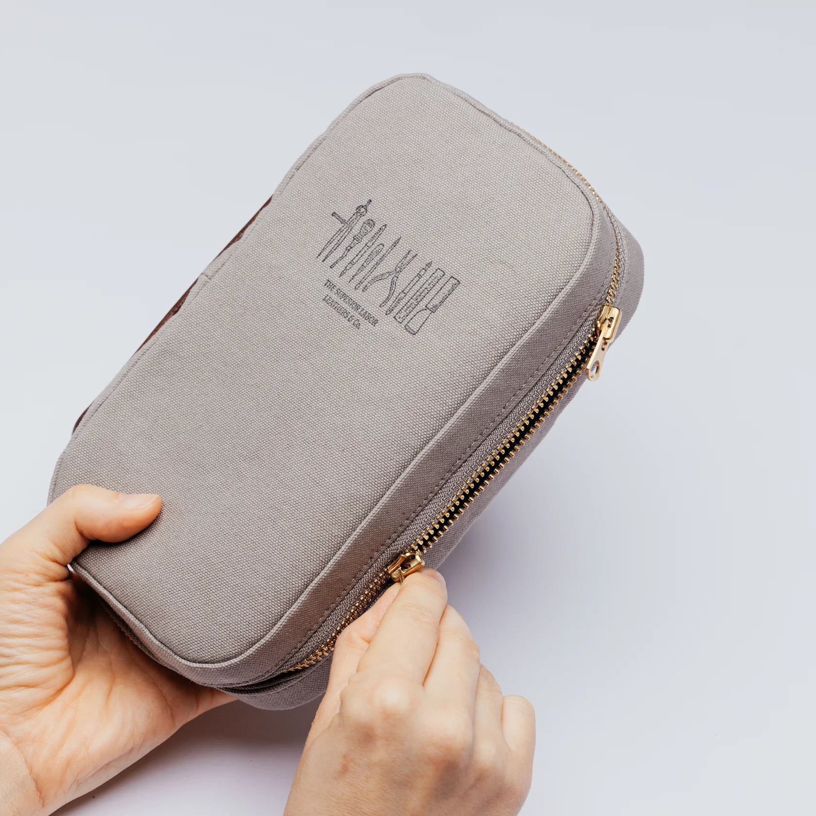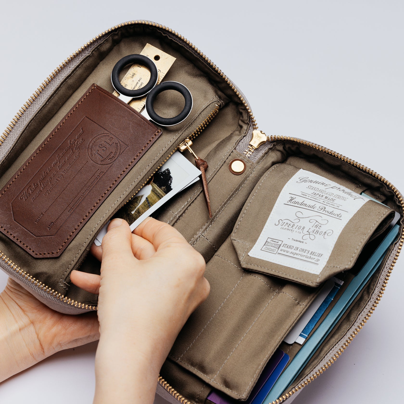 A Medium Canvas Mission Case handmade by Superior Labor. From passports and cards to stationery and tech accessories, this versatile canvas case keeps your essentials neatly organized and easy to carry. This season, it comes in a bold new red color with a stamped leather tool motif on the front for an eye-catching update. Made from high-density canvas produced in the USA, it’s dyed and washed in Japan to create a soft, broken-in feel with natural wrinkles and subtle tonal variations that add depth and character. The black version especially highlights these textures, making each case one of a kind. Lay it open to view everything at a glance, then zip it up for a reliable storage solution wherever you go.