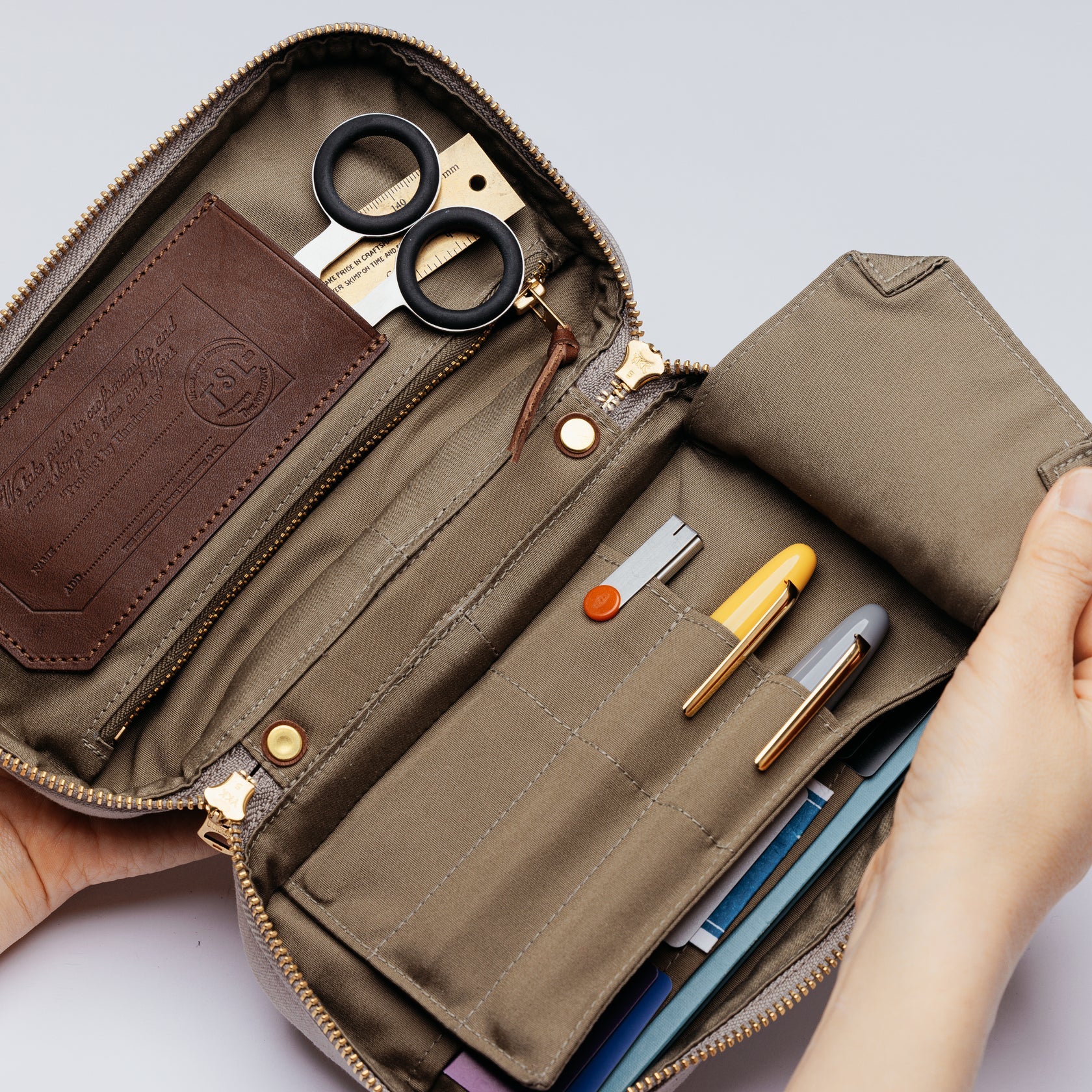 - Includes: 1 leather flap for carrying 1-2 metal tools, 1 zipper compartment, 1 large pocket, 1 flap protected inner pouch for 3 writing utensils, 6 card slots, followed by 1 large pocket
